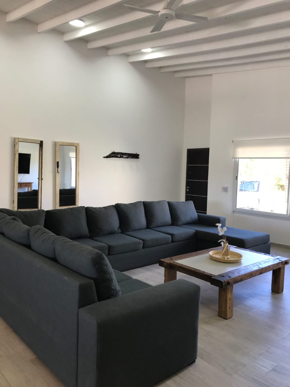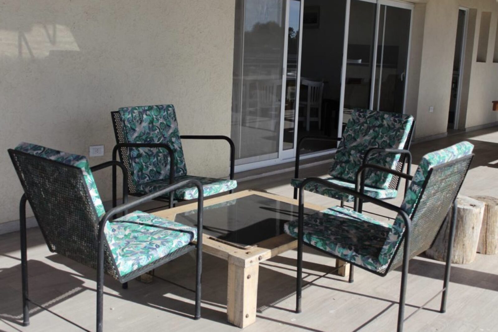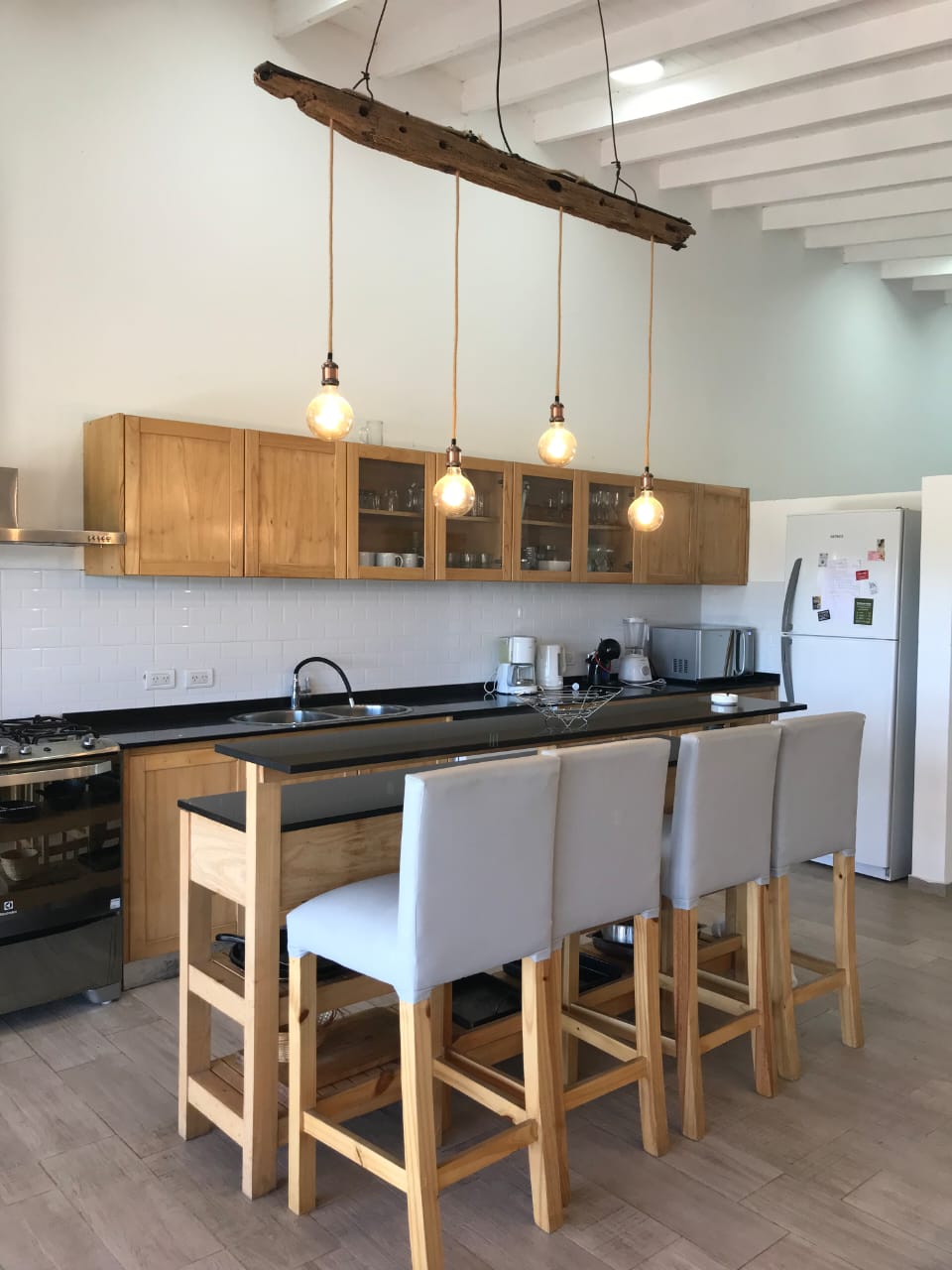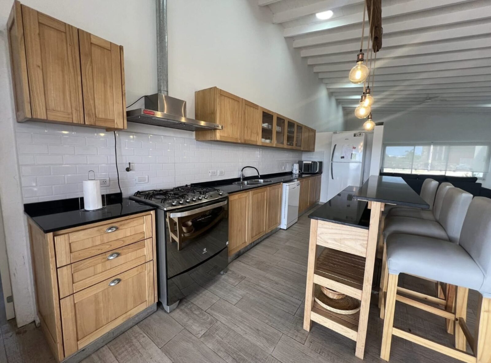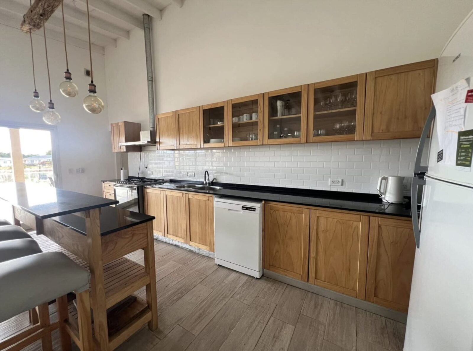 Cocina completa más barra desayunador con lavavajilla cafetera, minipimer, heladera de 360 LT y living comedor de 15 x 6 con un sillón.
