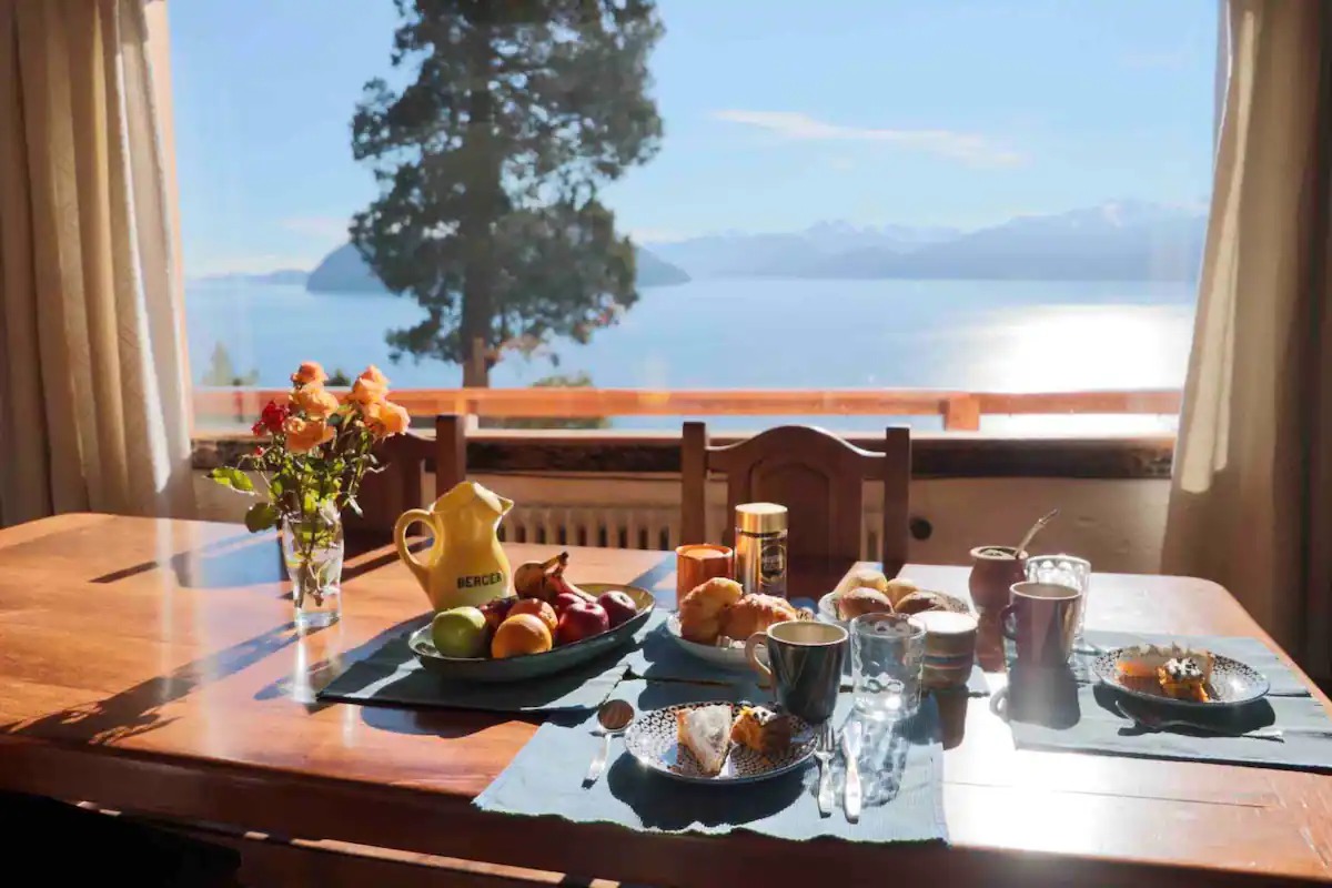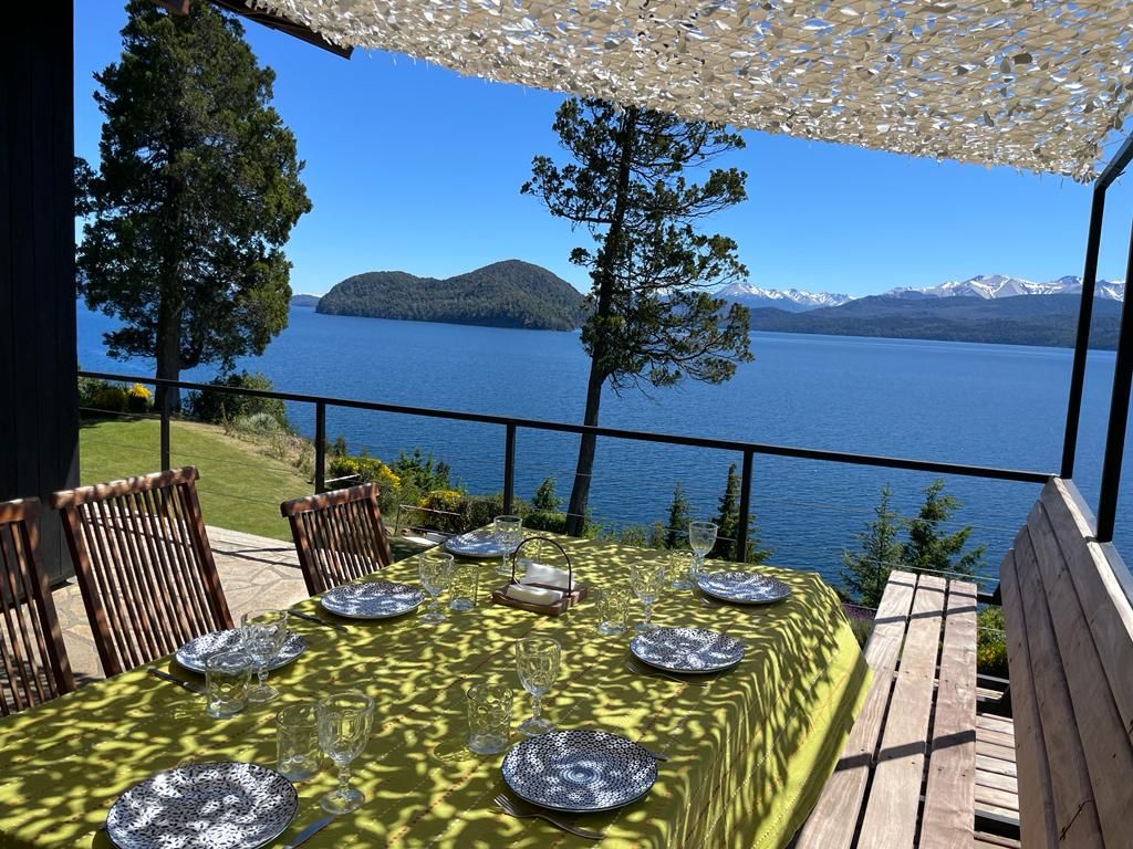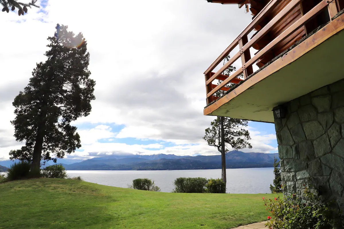 Parque con césped, frutales y árboles autóctonos, con vista directa al lago Nahuel Huapi, y a la Isla Victoria.