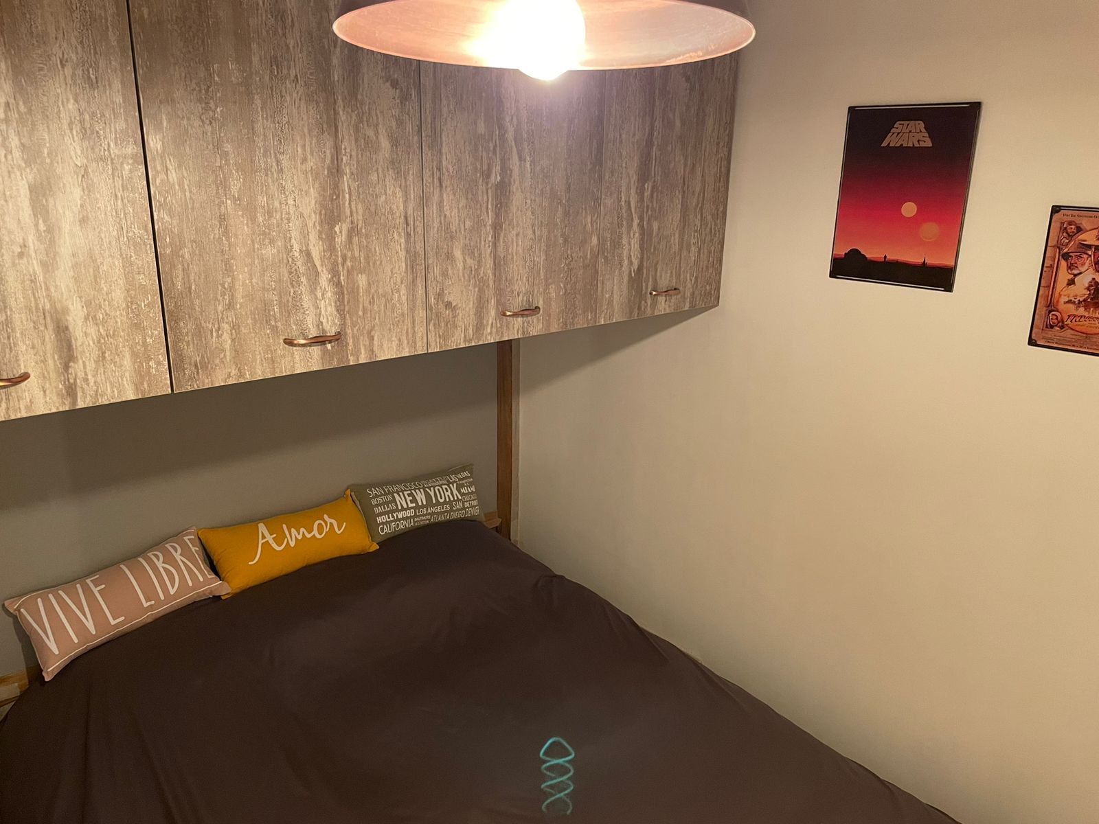 Un dormitorio con cama matrimonial y 3 camas en el living.