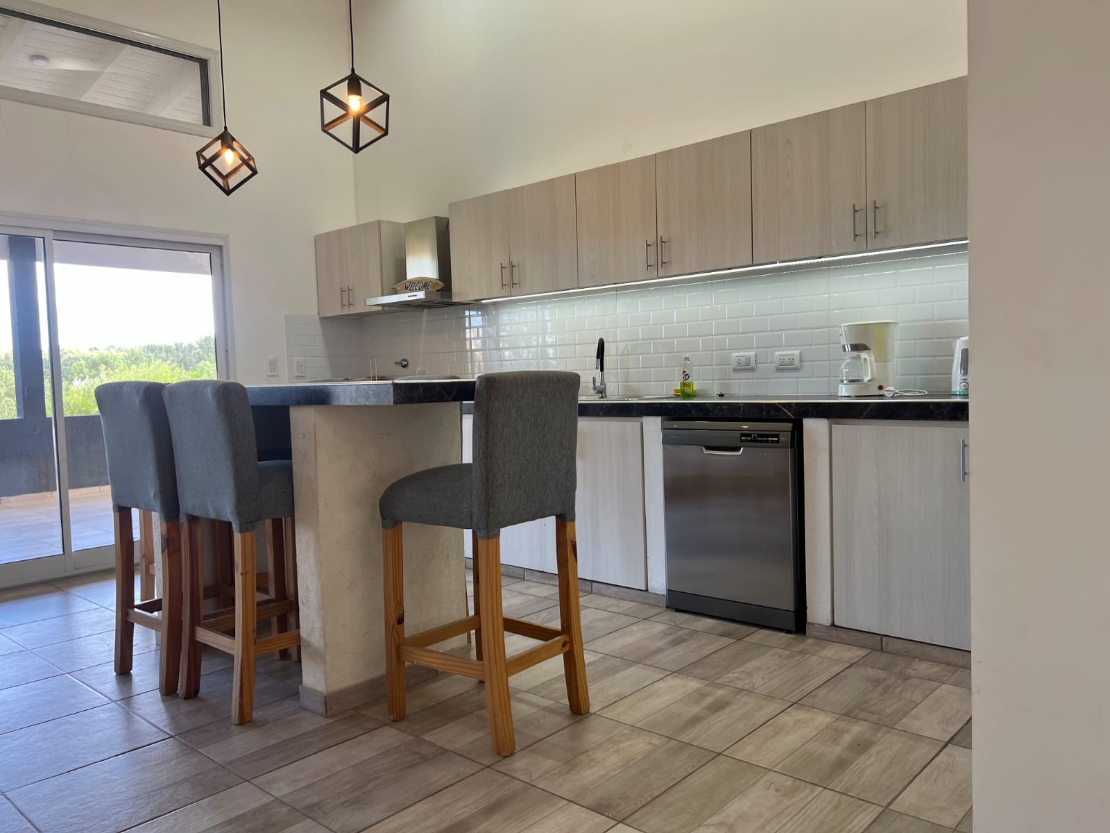 Cocina completa más barra desayunador con lavavajilla, cafetera, minipimer, totalmente equipada.