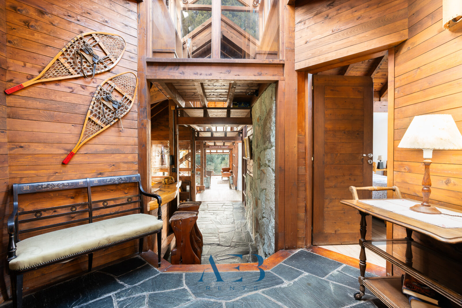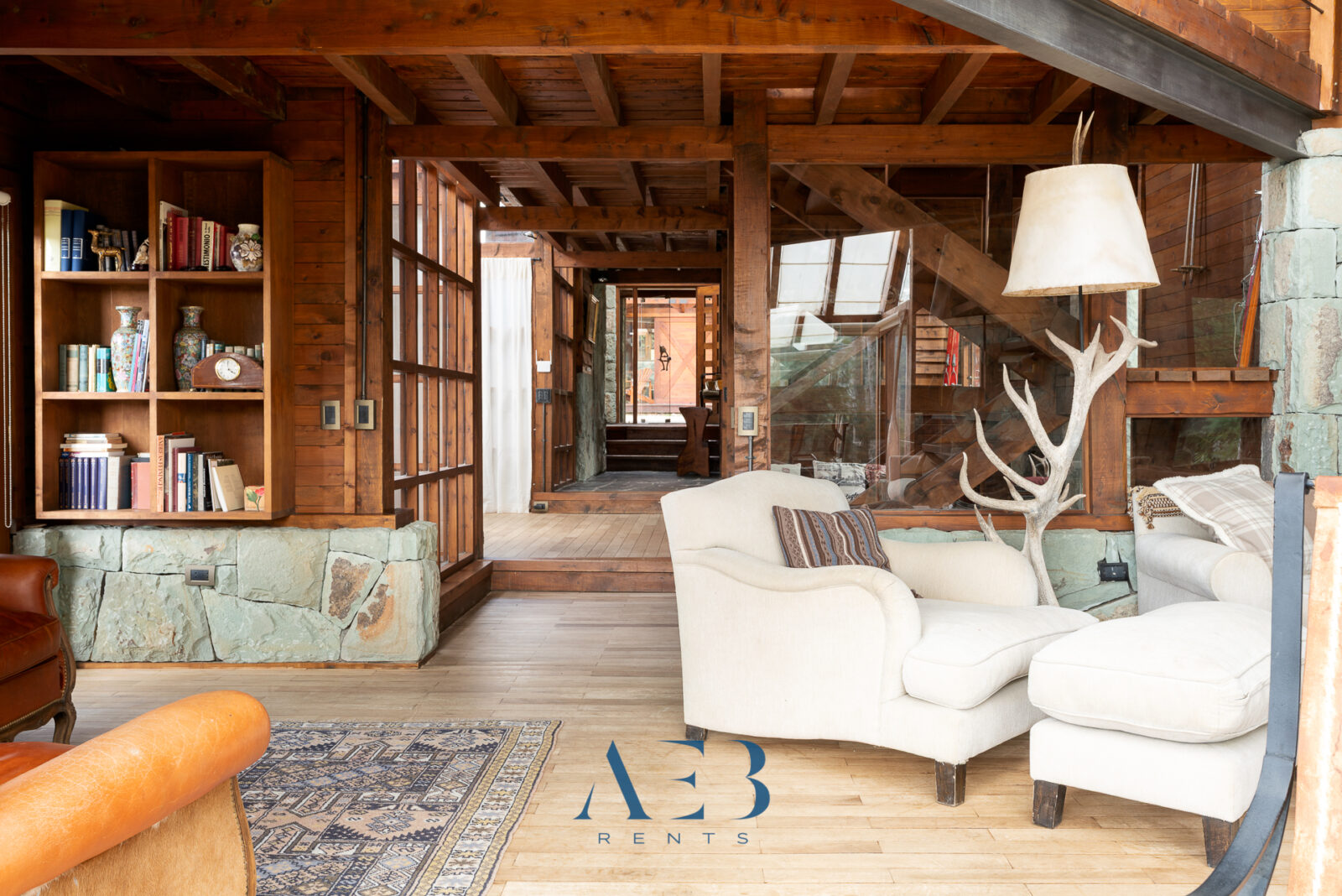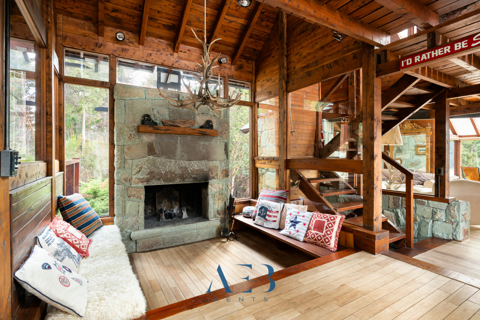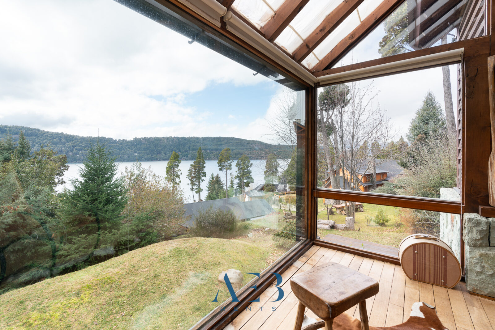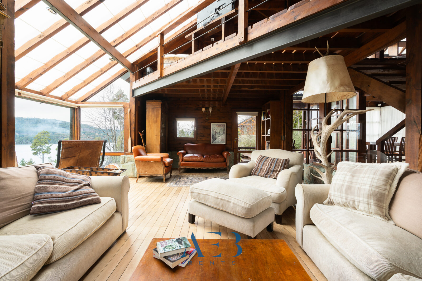 Una antesala con chimenea y un living super amplio con sector de lectura y vista al lago.