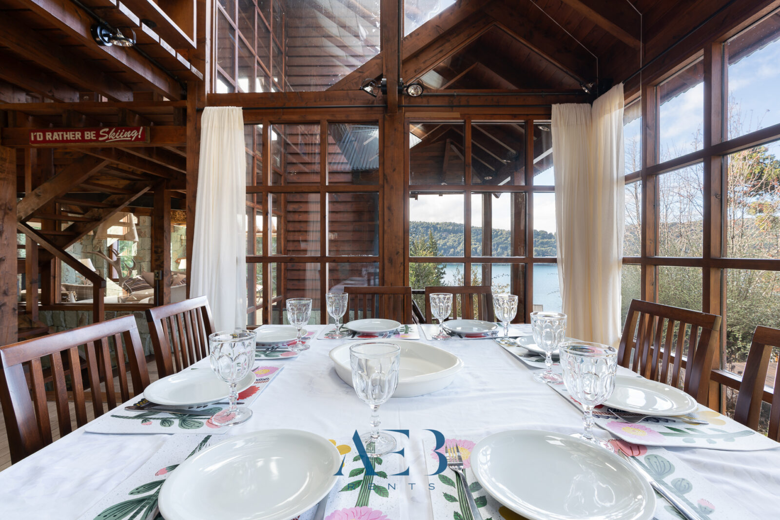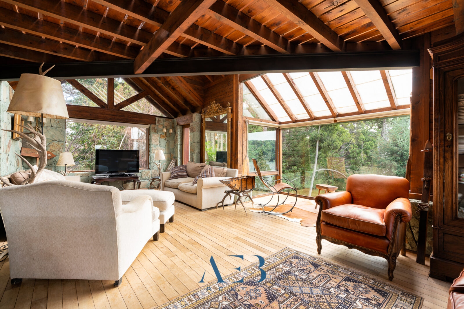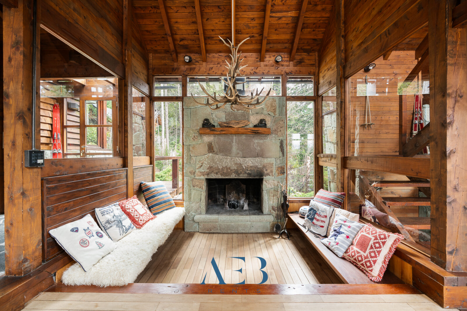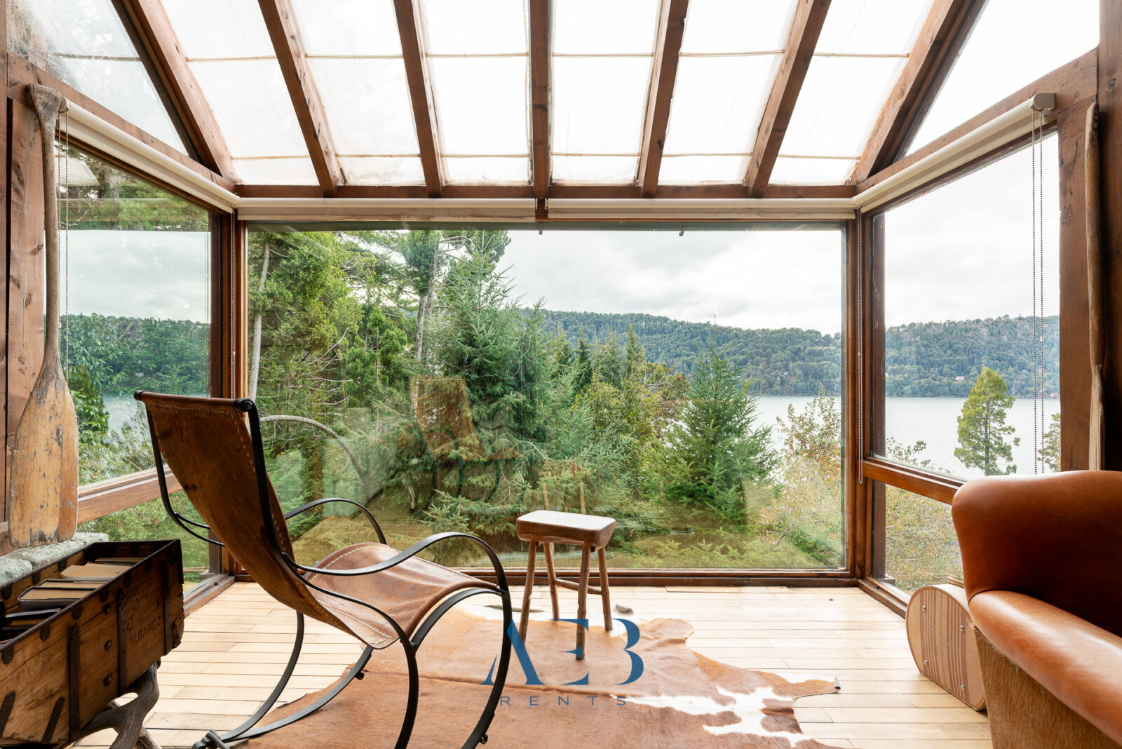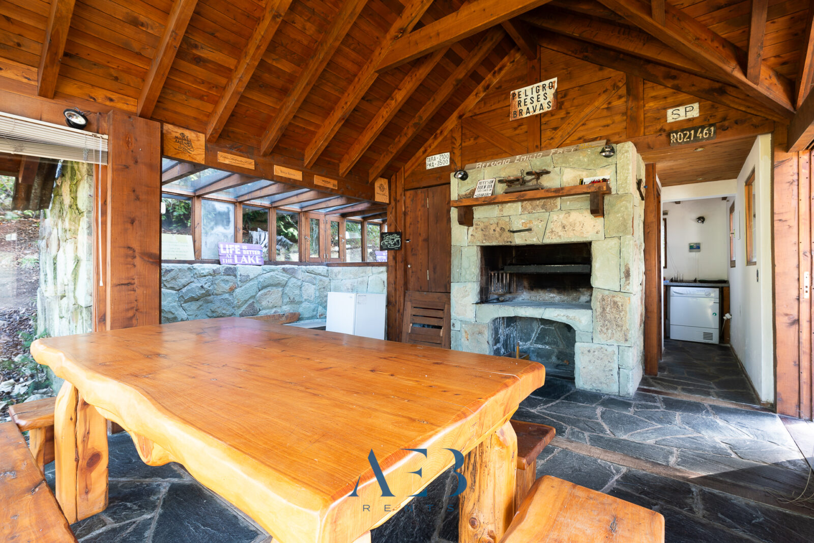 Una antesala con chimenea y un living super amplio con sector de lectura y vista al lago.