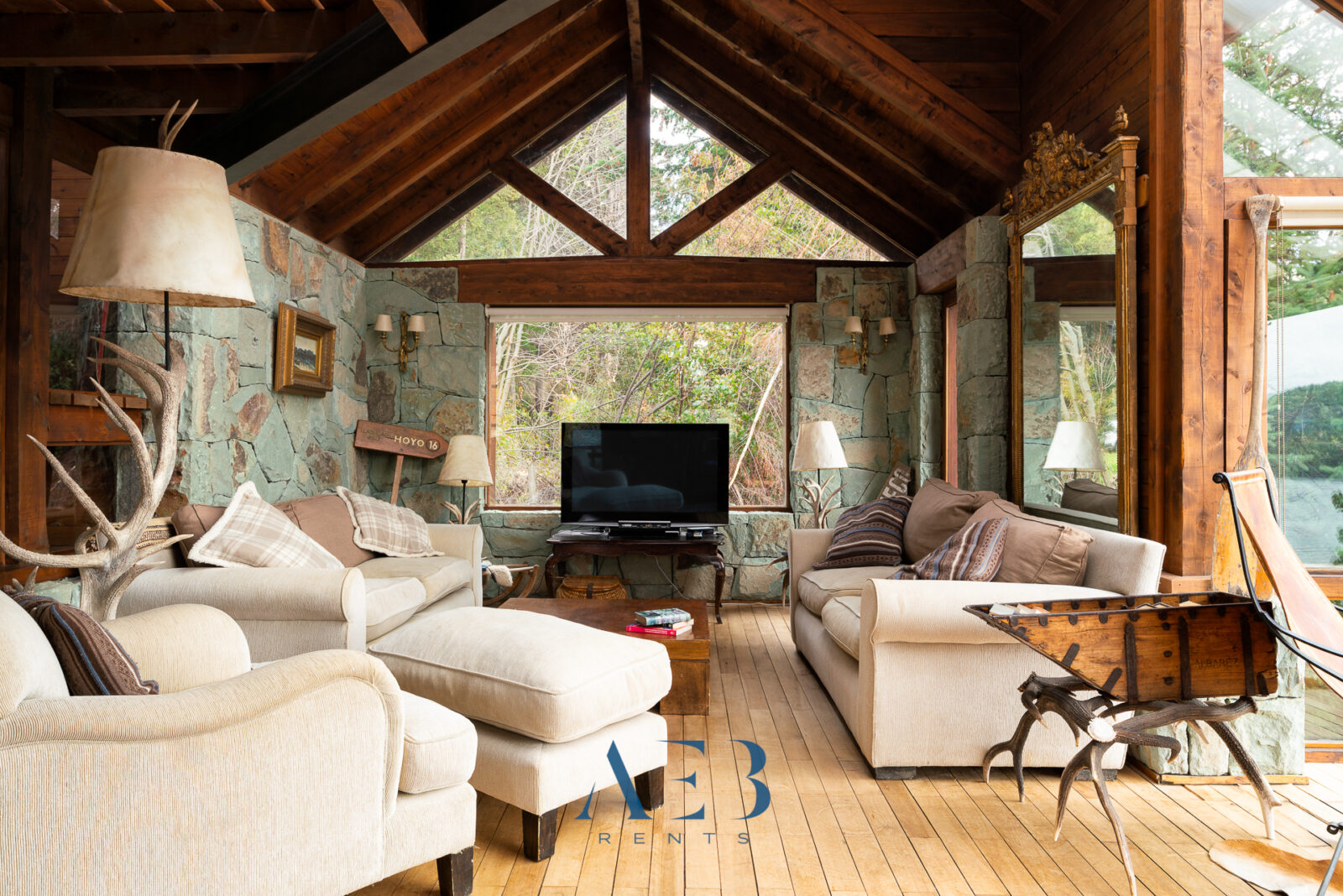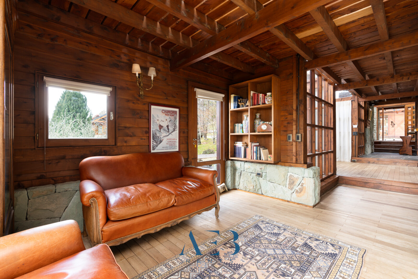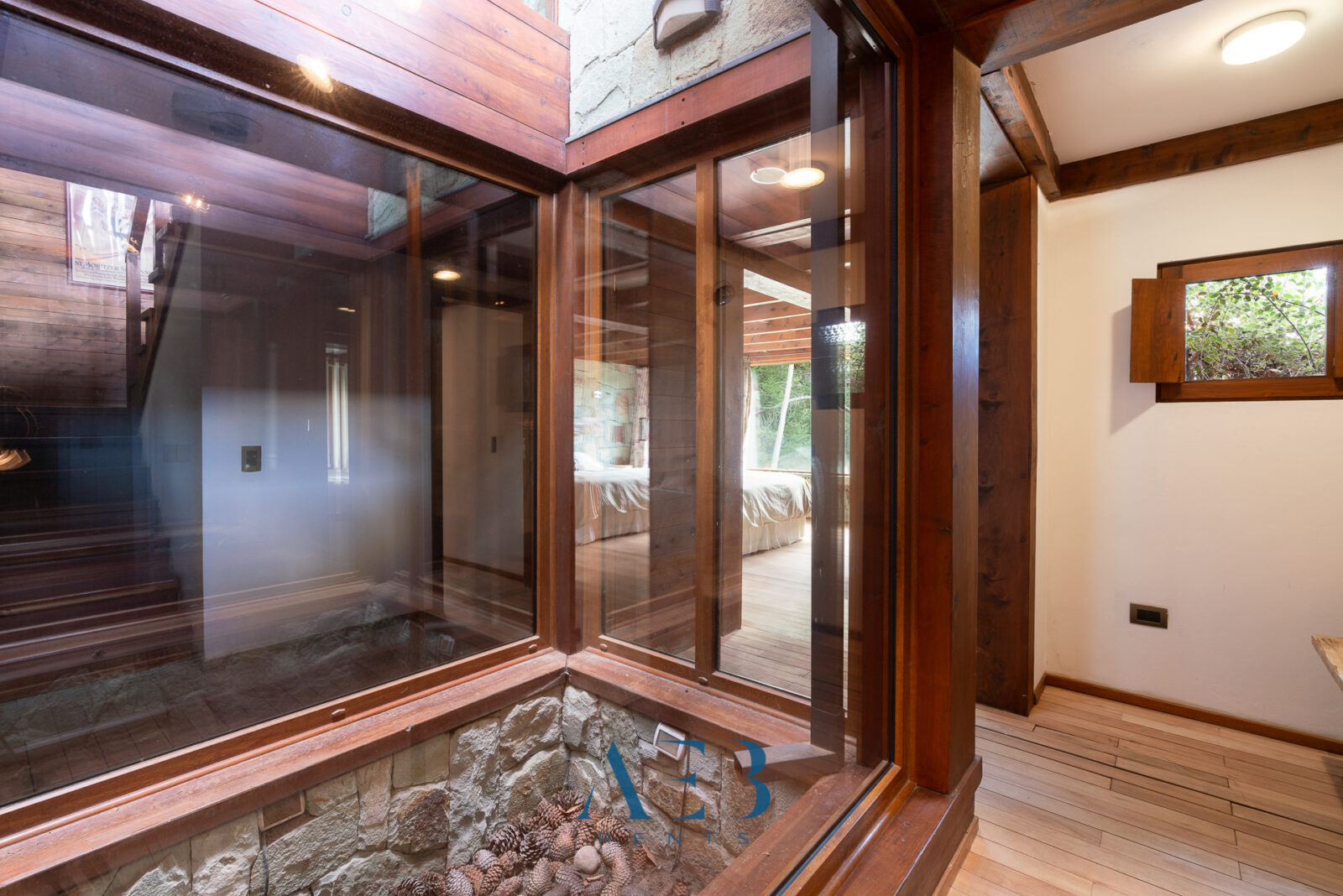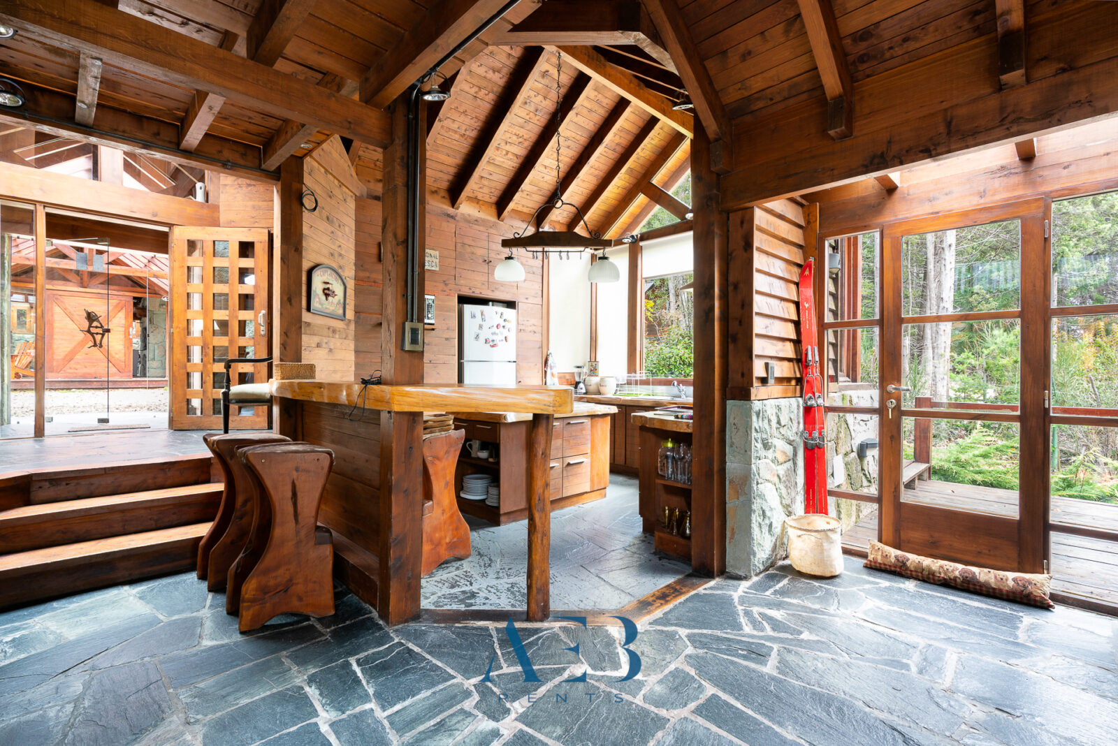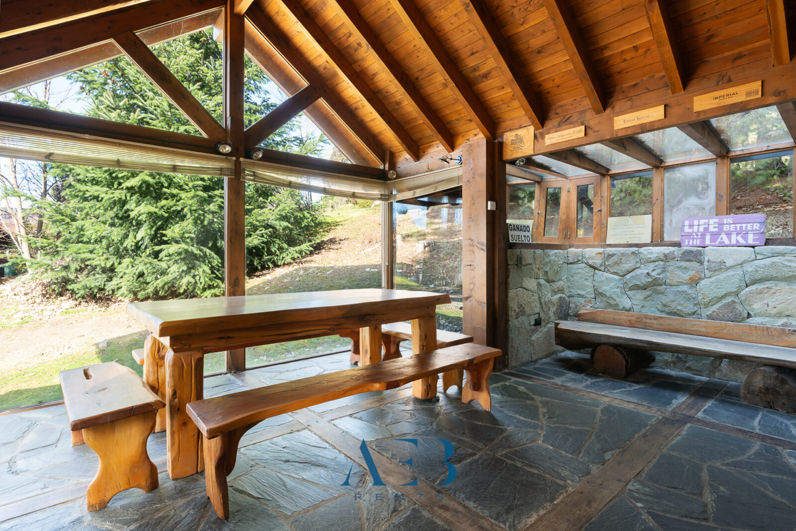 Una antesala con chimenea y un living super amplio con sector de lectura y vista al lago.