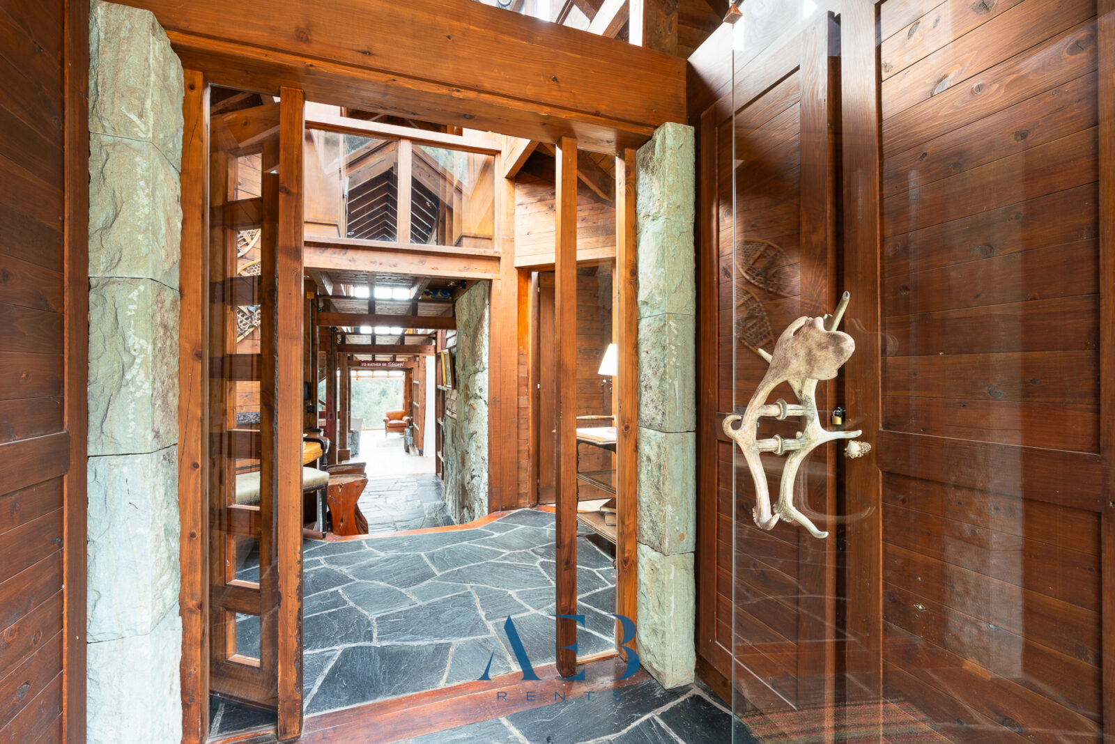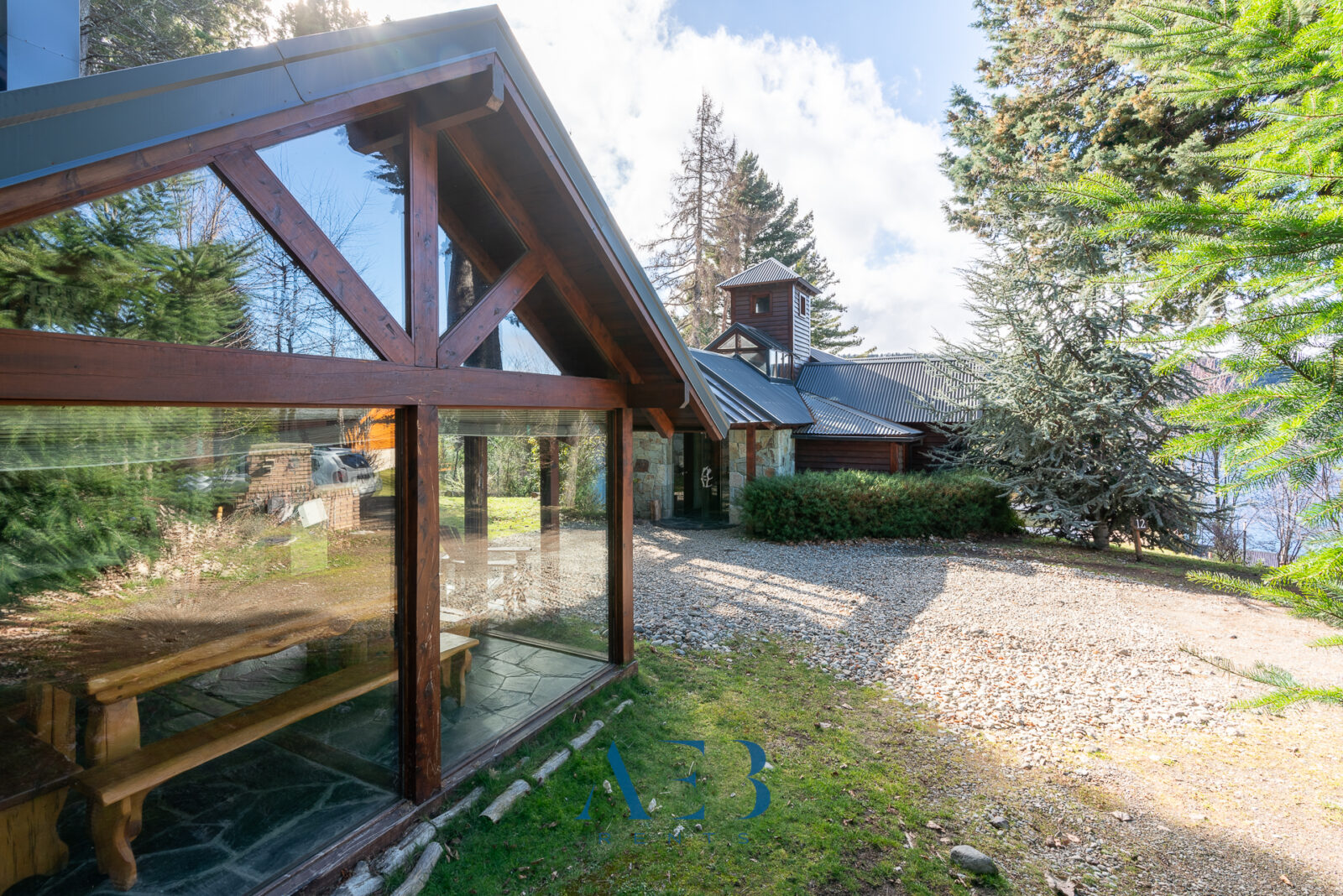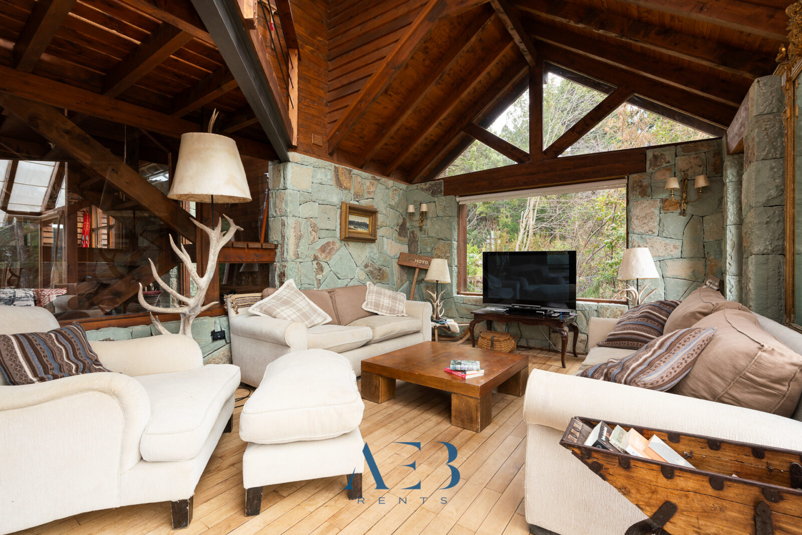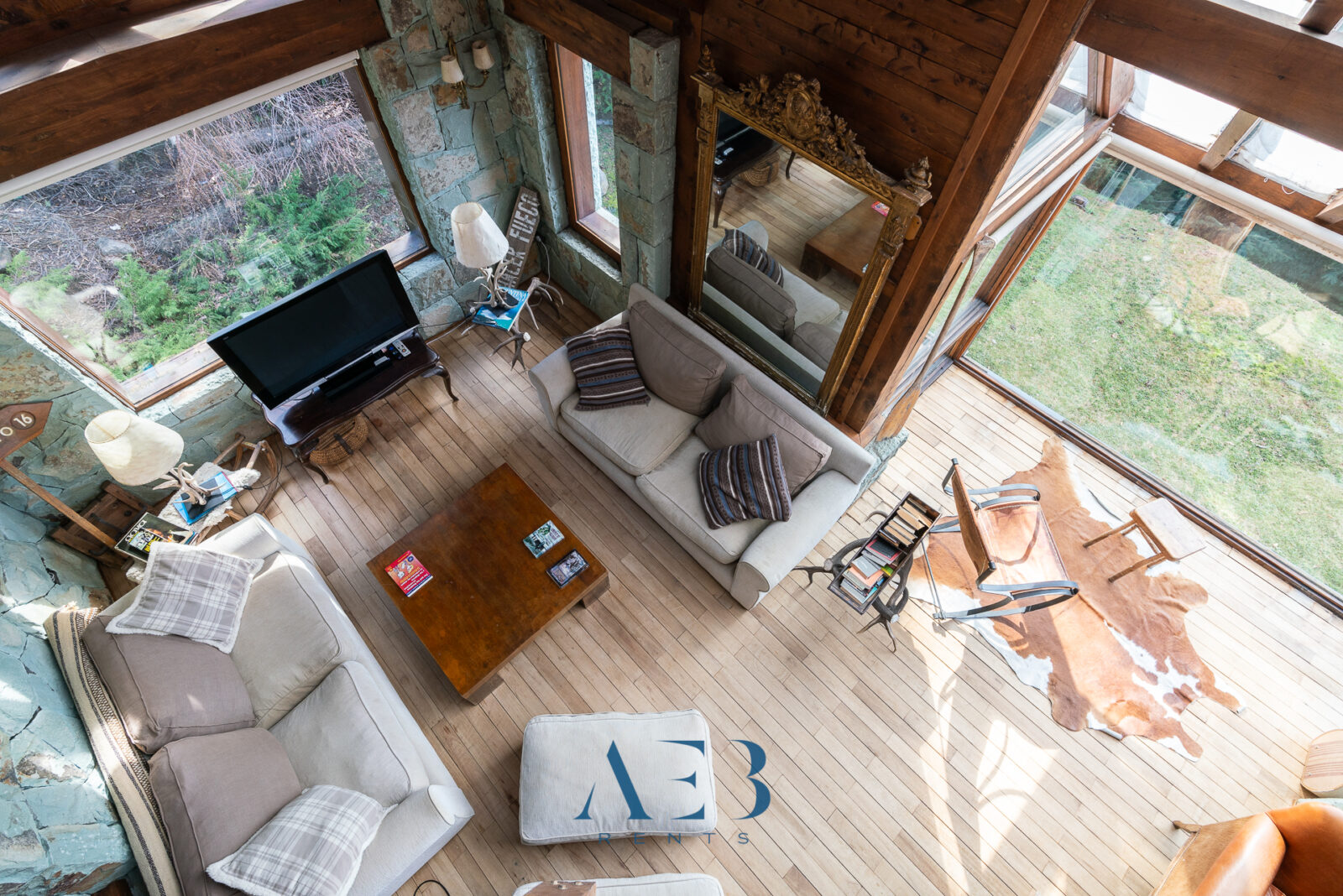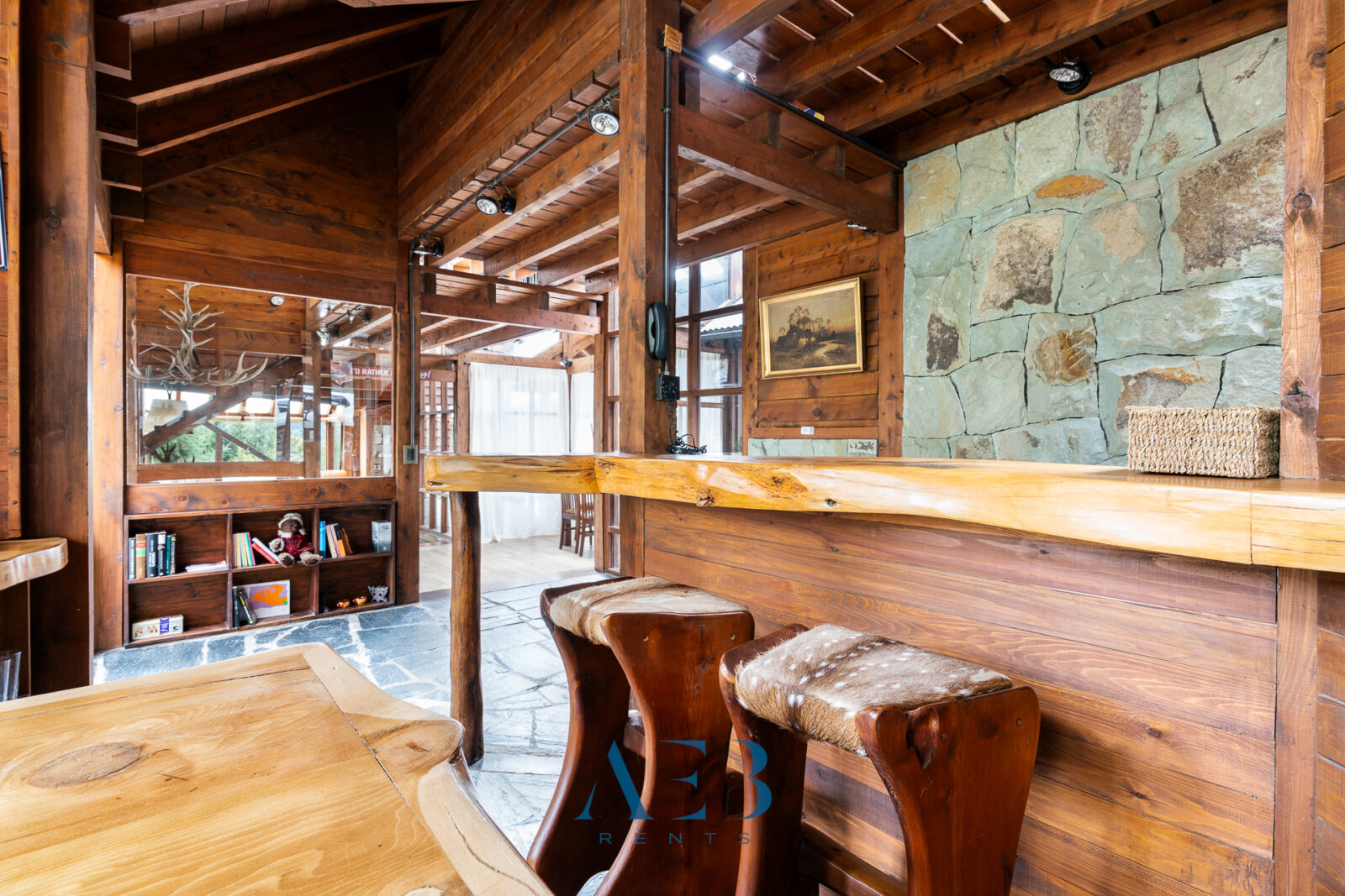 Una antesala con chimenea y un living super amplio con sector de lectura y vista al lago.