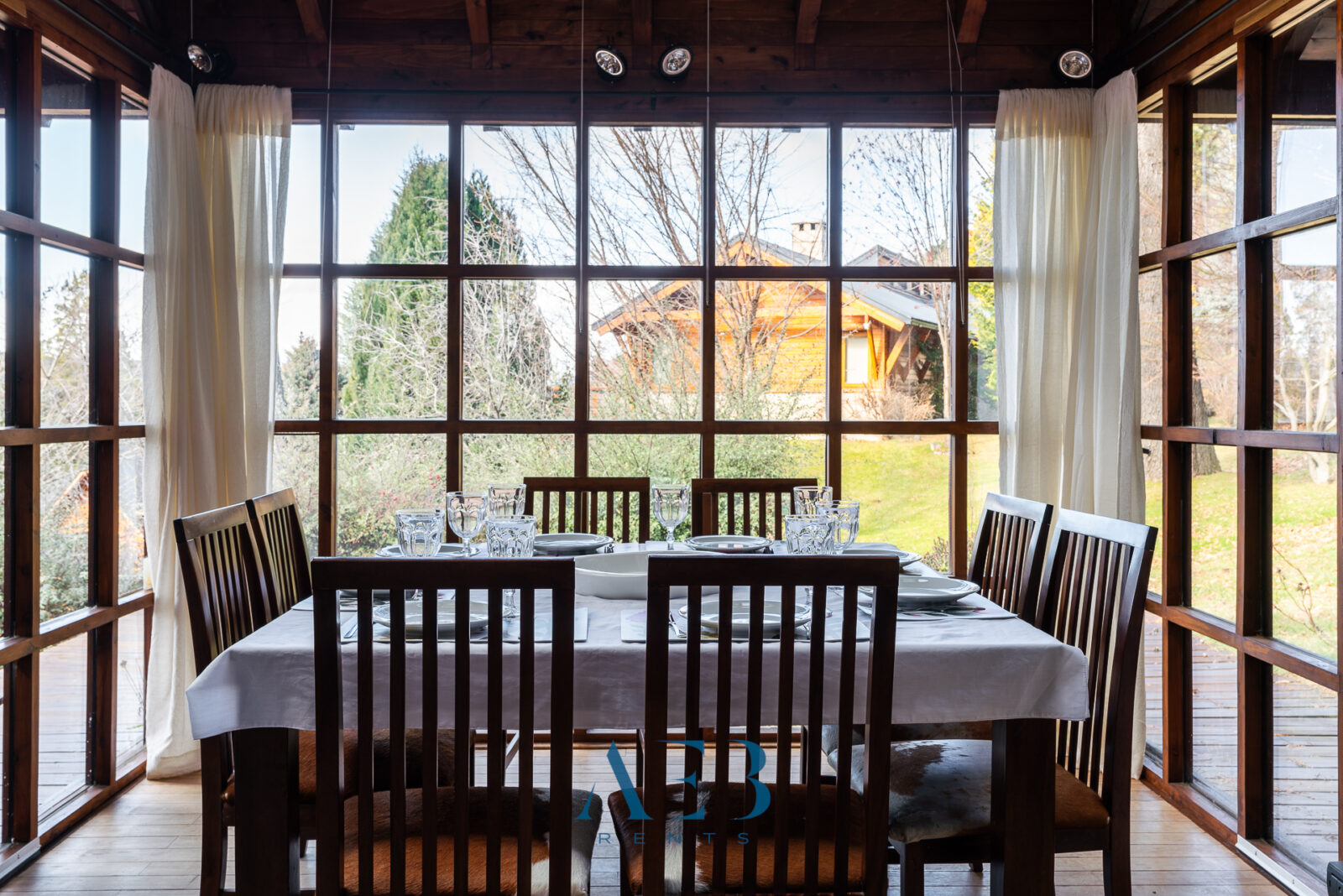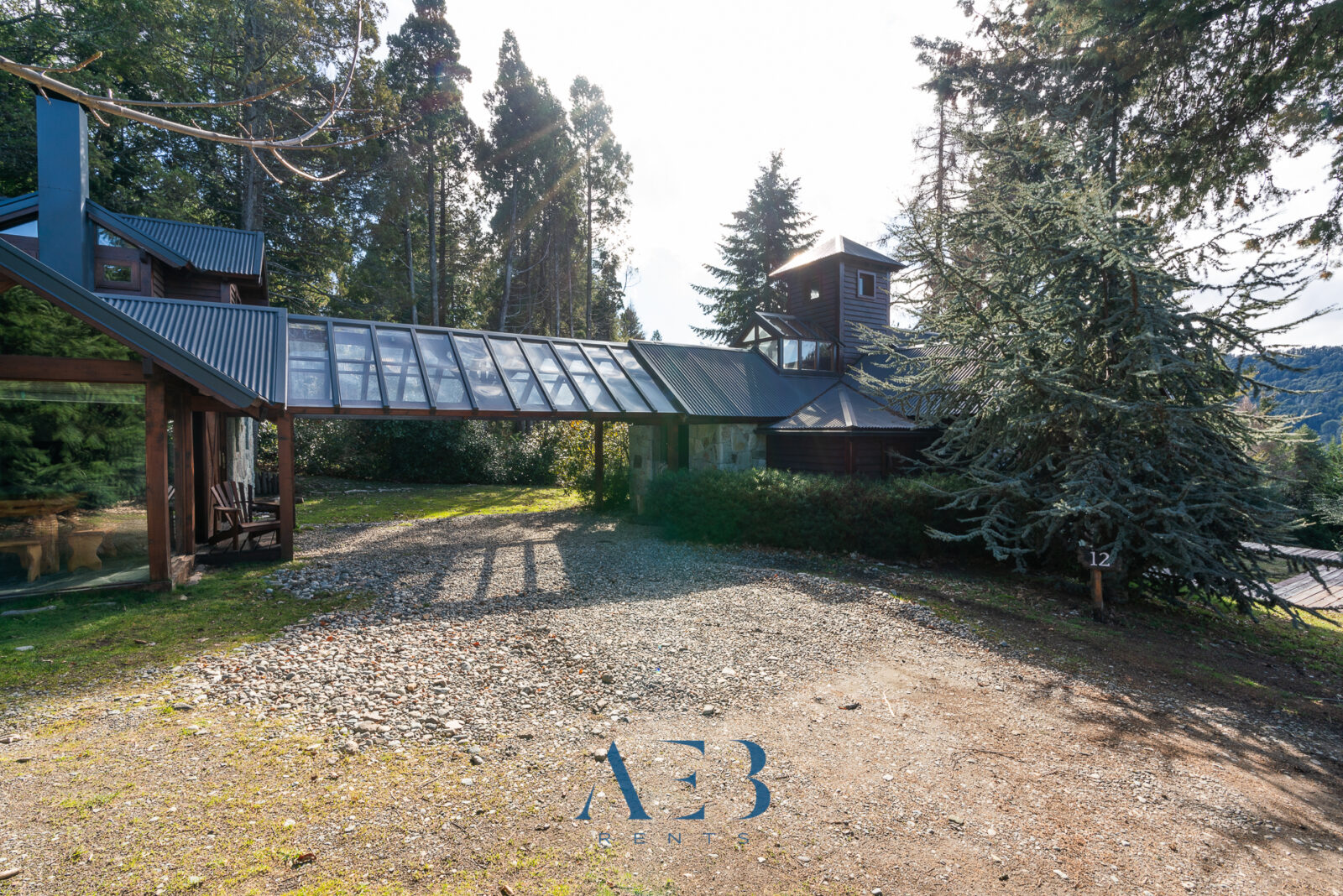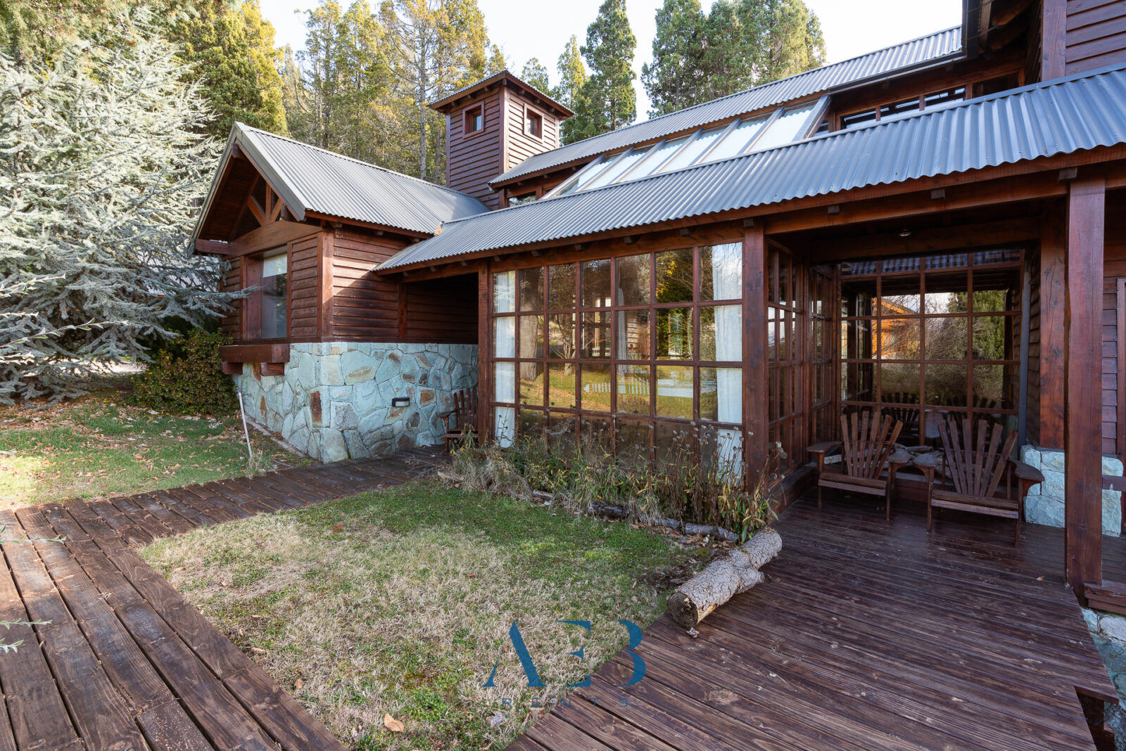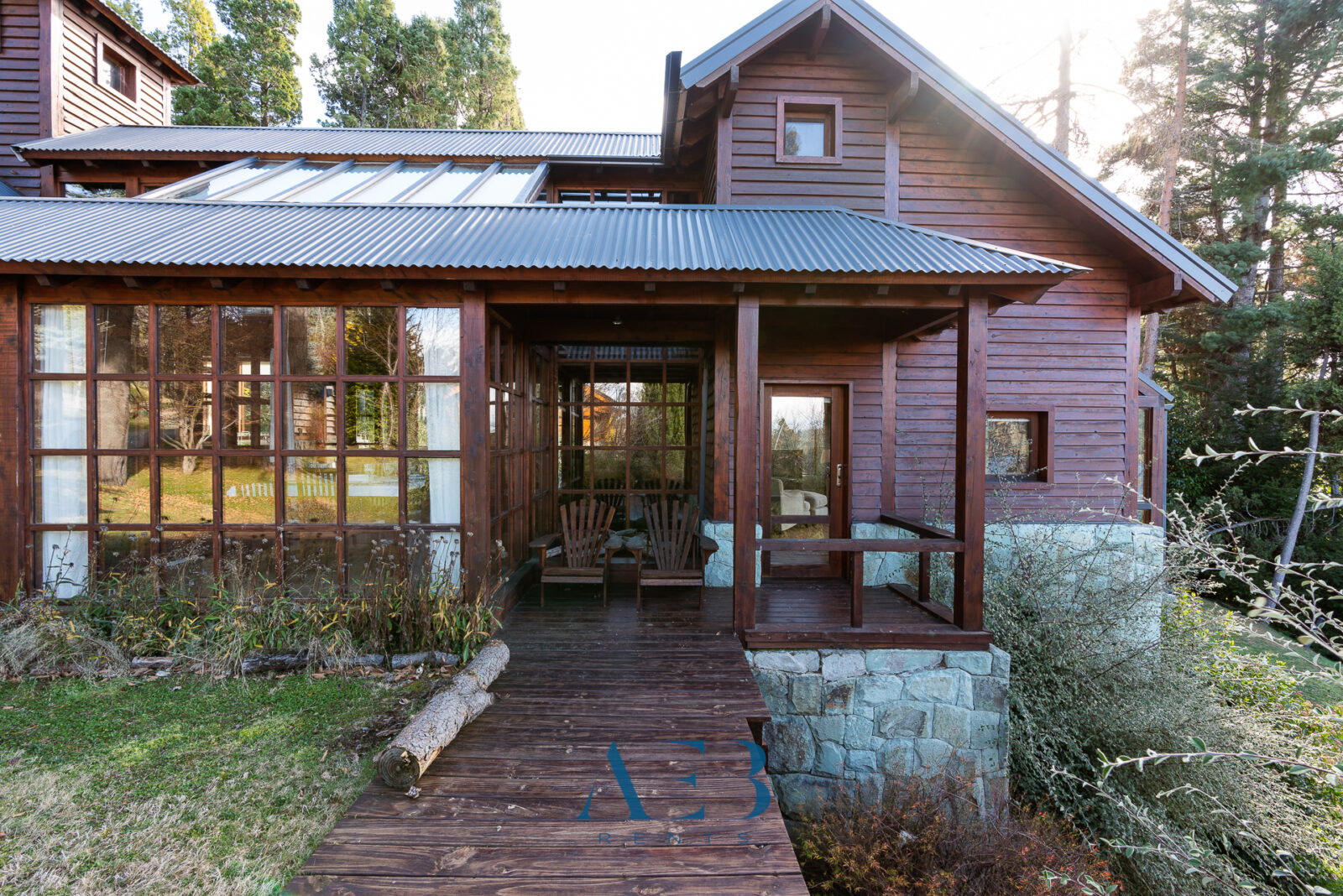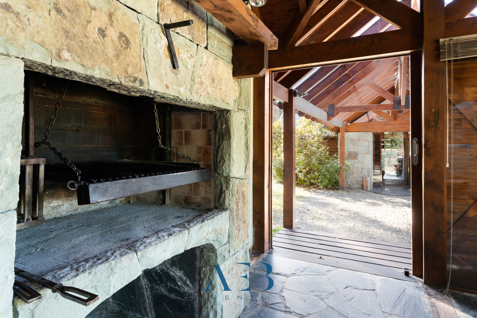 Una antesala con chimenea y un living super amplio con sector de lectura y vista al lago.