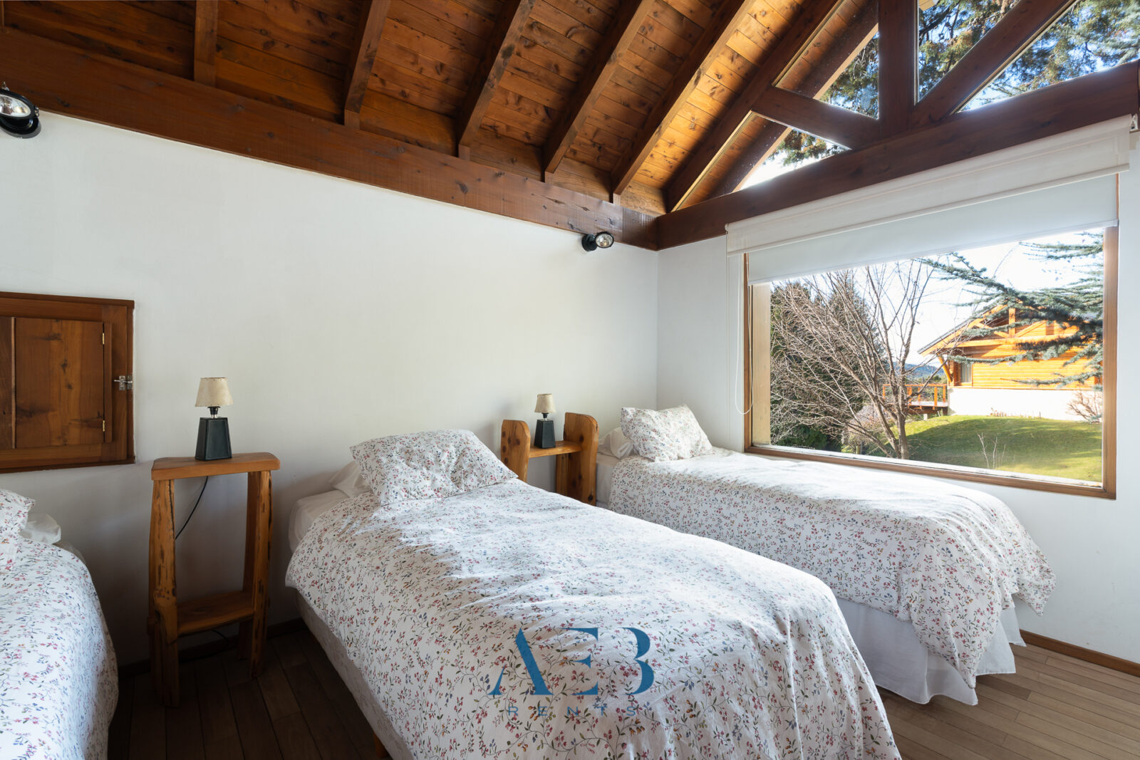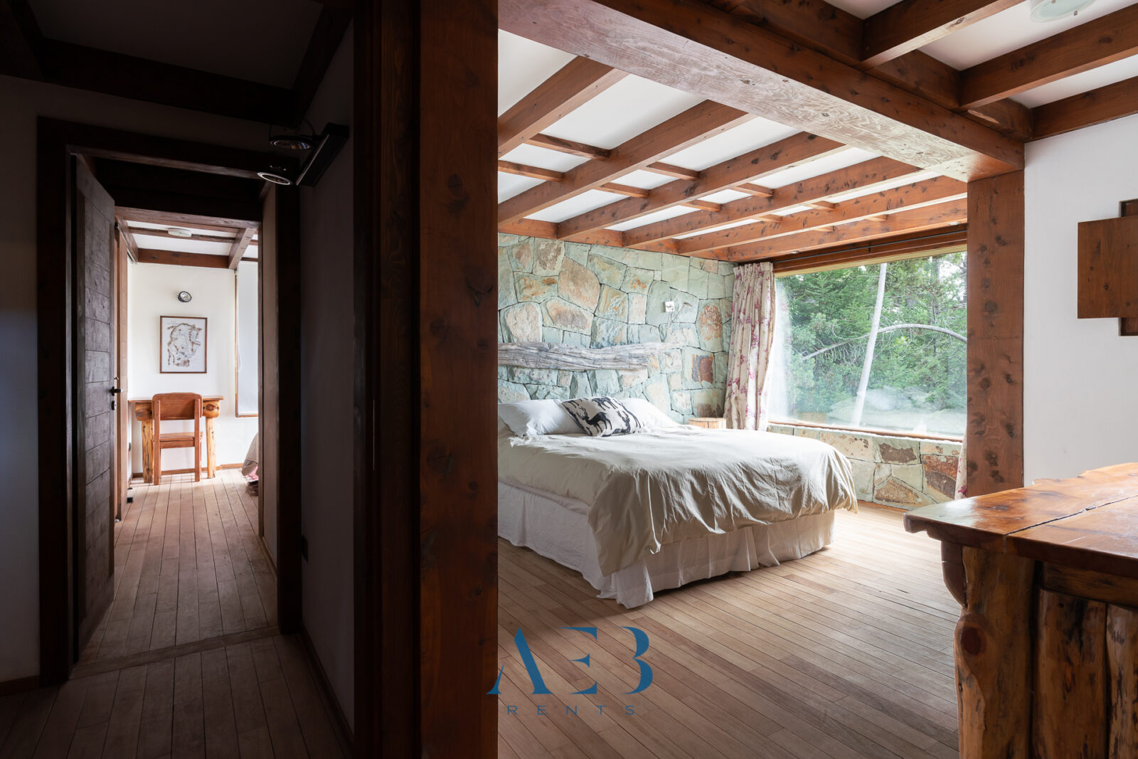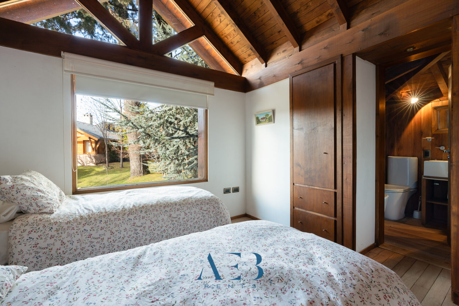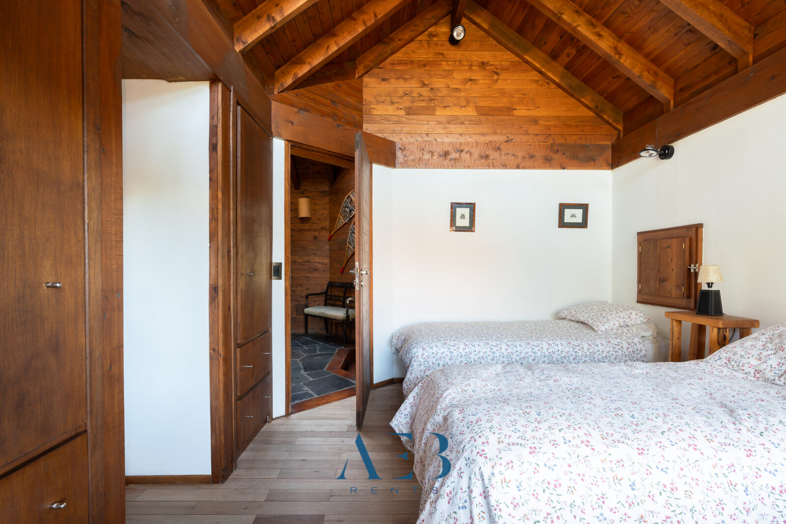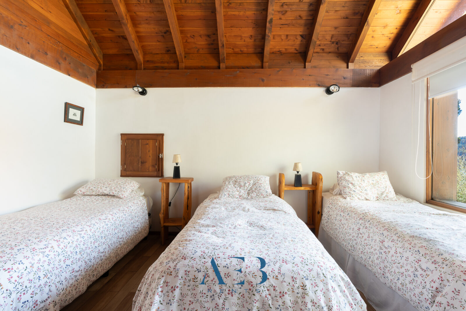 Hacia abajo se encuentran las otras dos habitaciones en suite, una de ellas siendo la principal con cama matrimonial y la otra con opción de cama simple o doble. Además hay una habitación pequeña más.