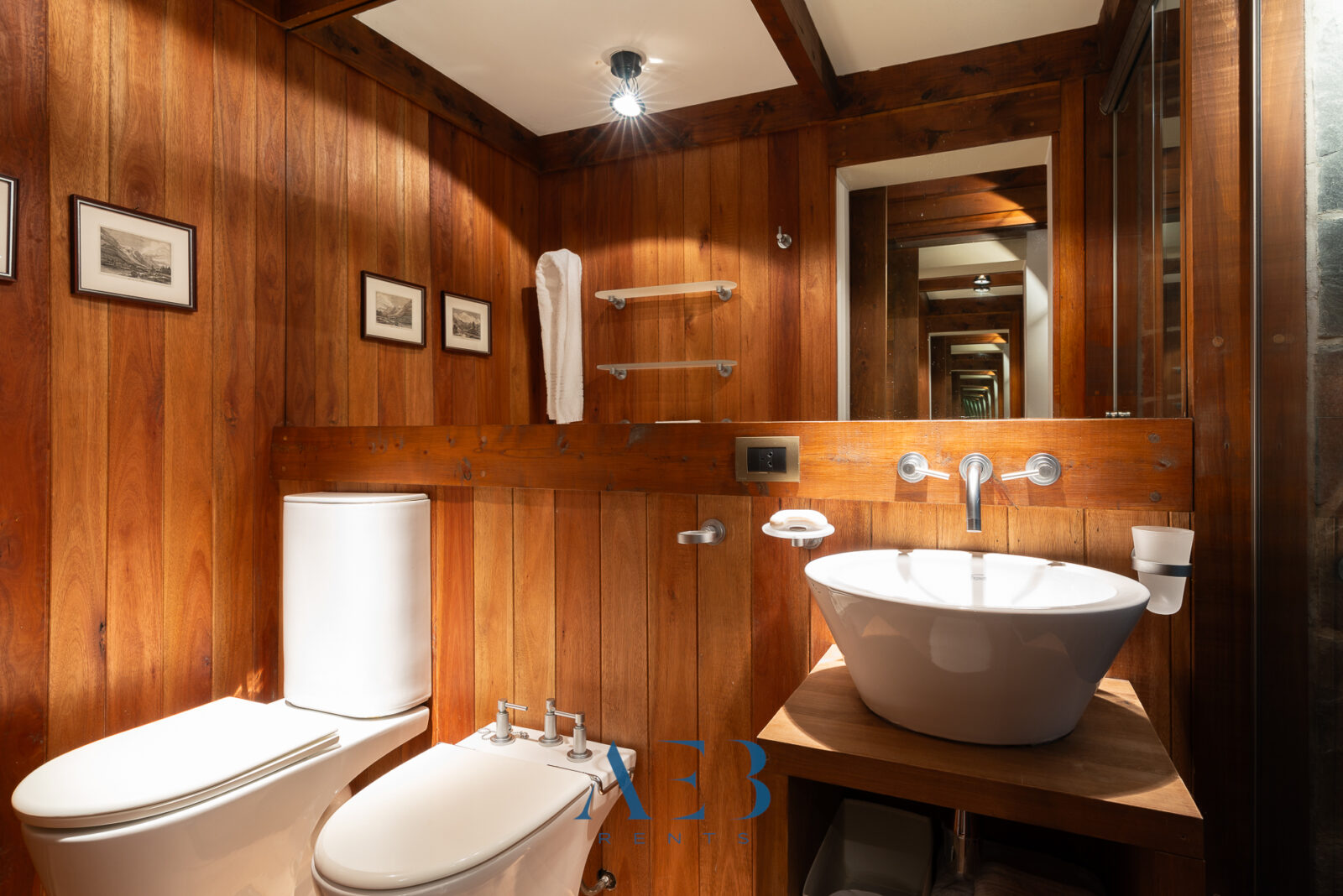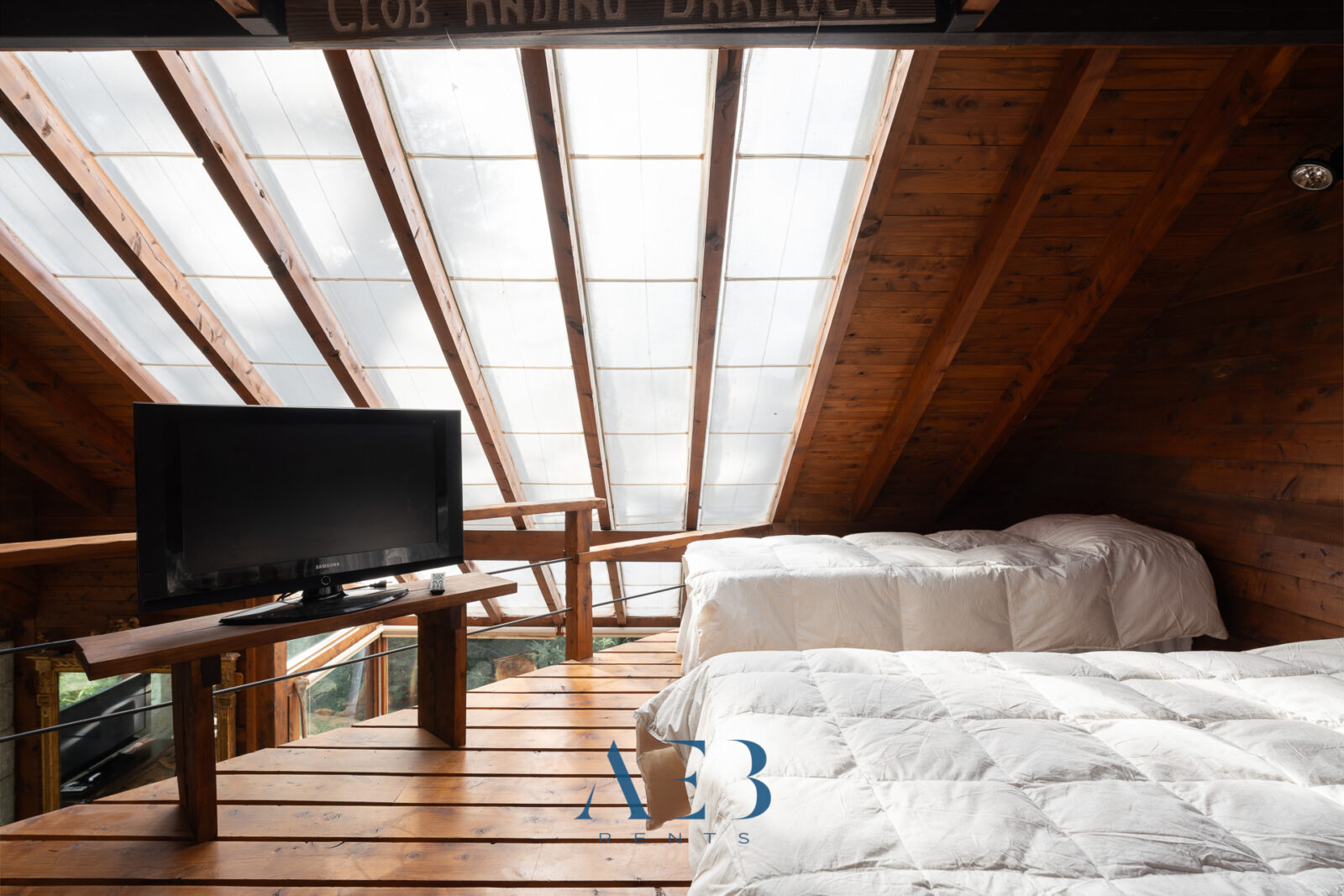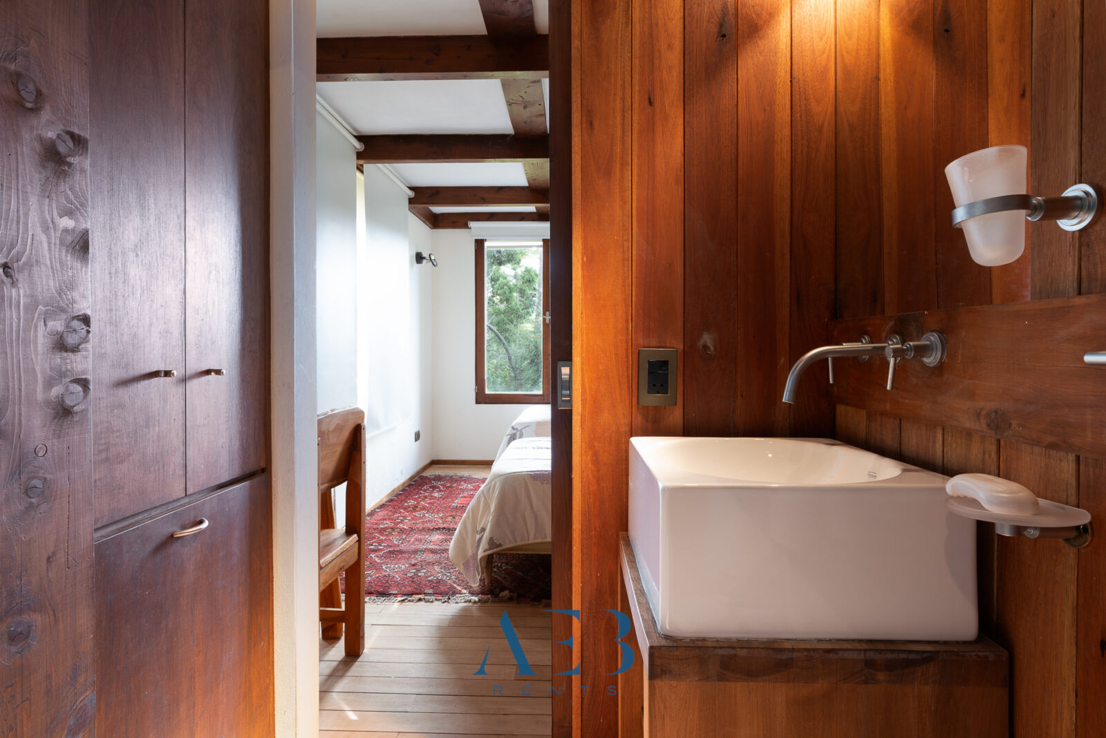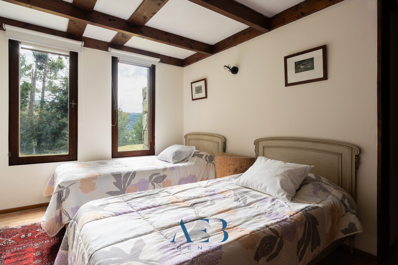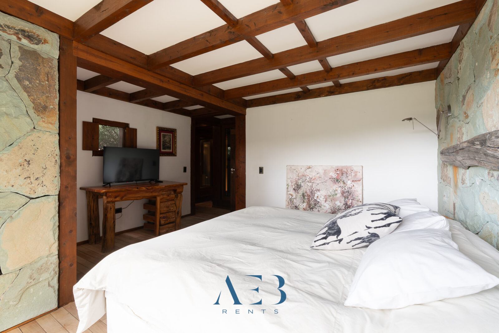 Hacia abajo se encuentran las otras dos habitaciones en suite, una de ellas siendo la principal con cama matrimonial y la otra con opción de cama simple o doble. Además hay una habitación pequeña más.