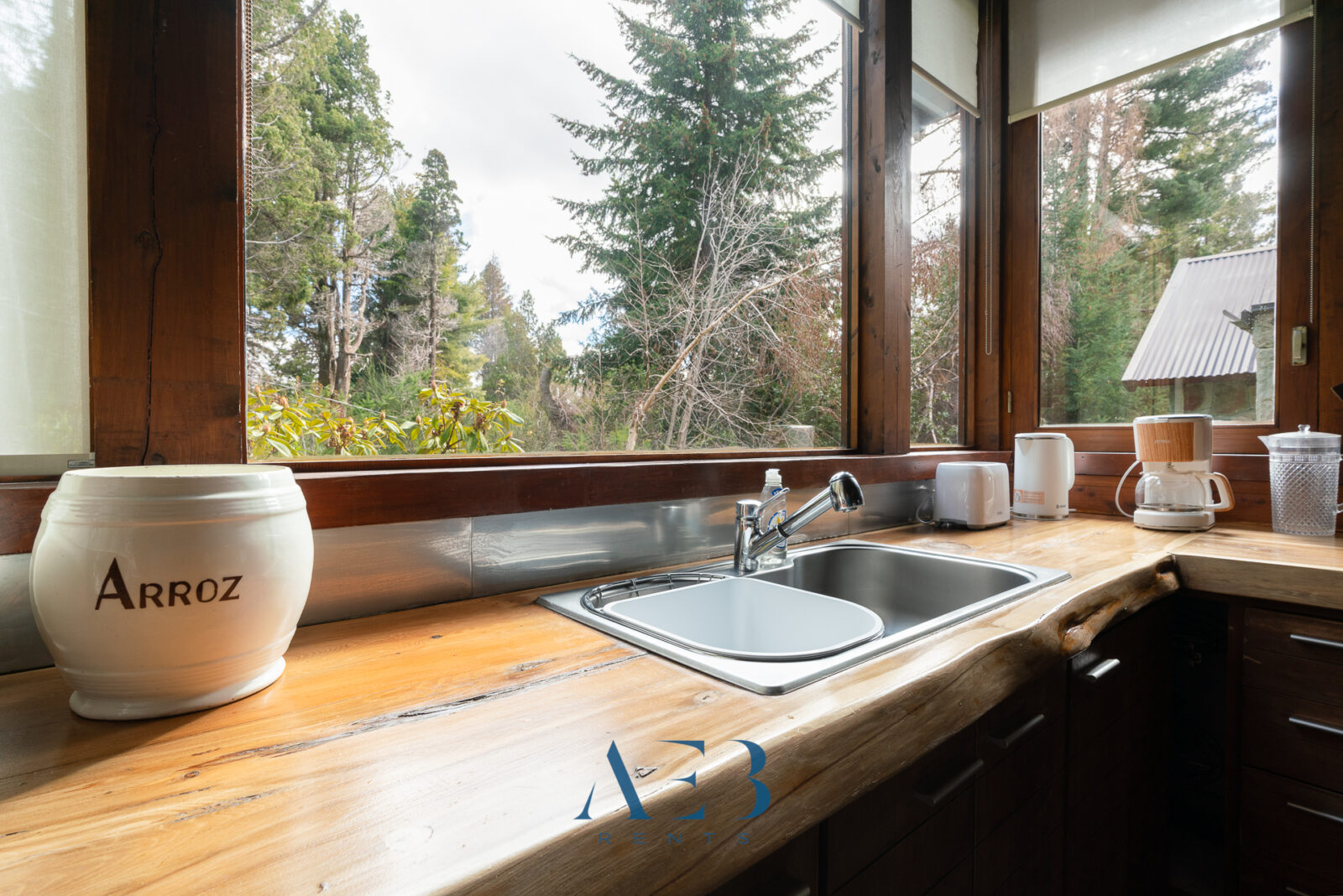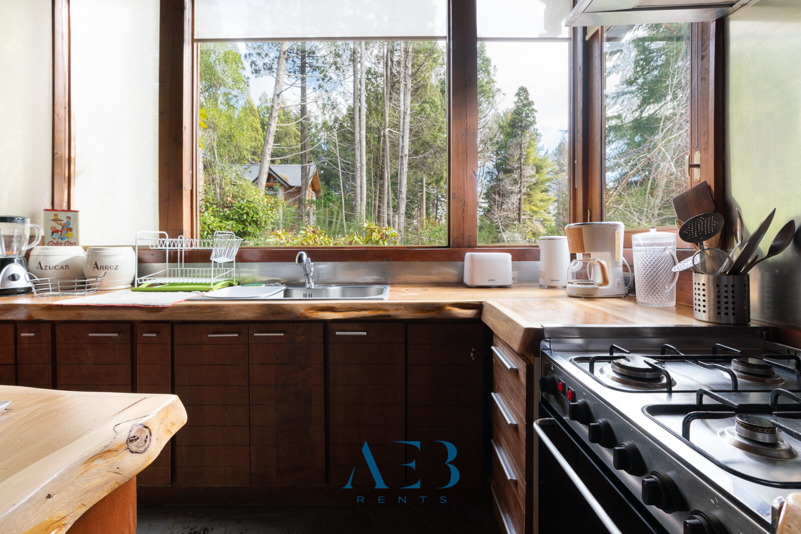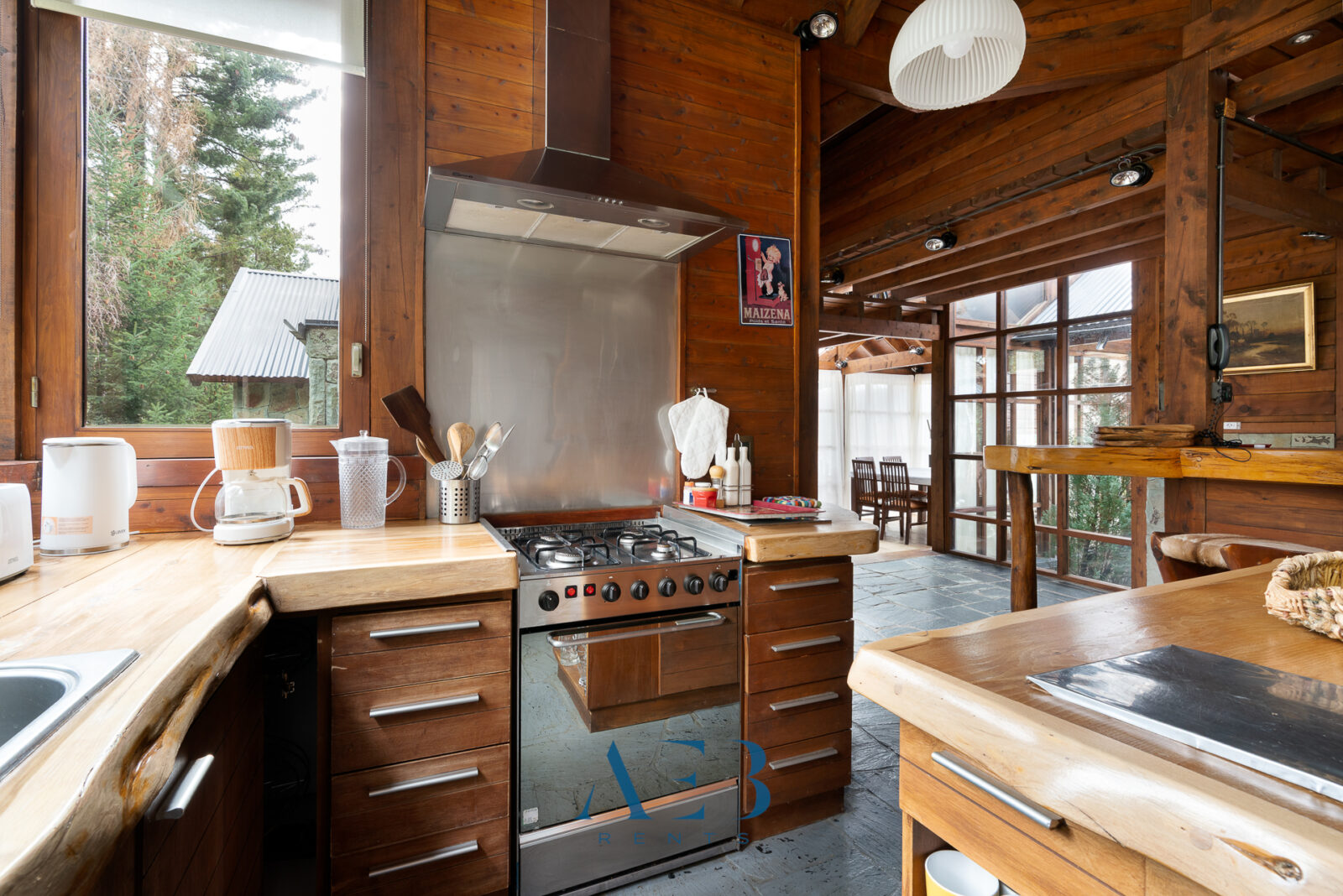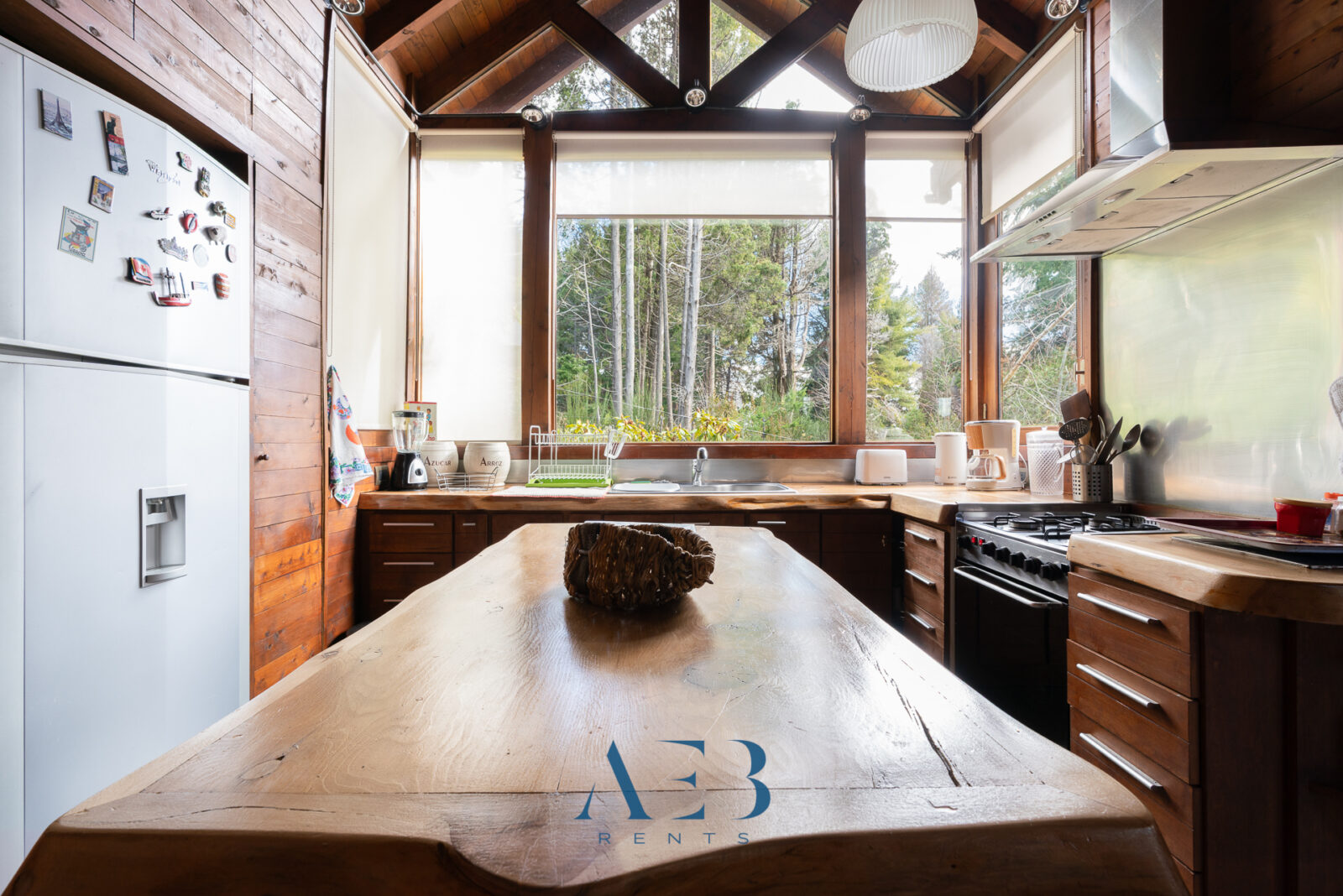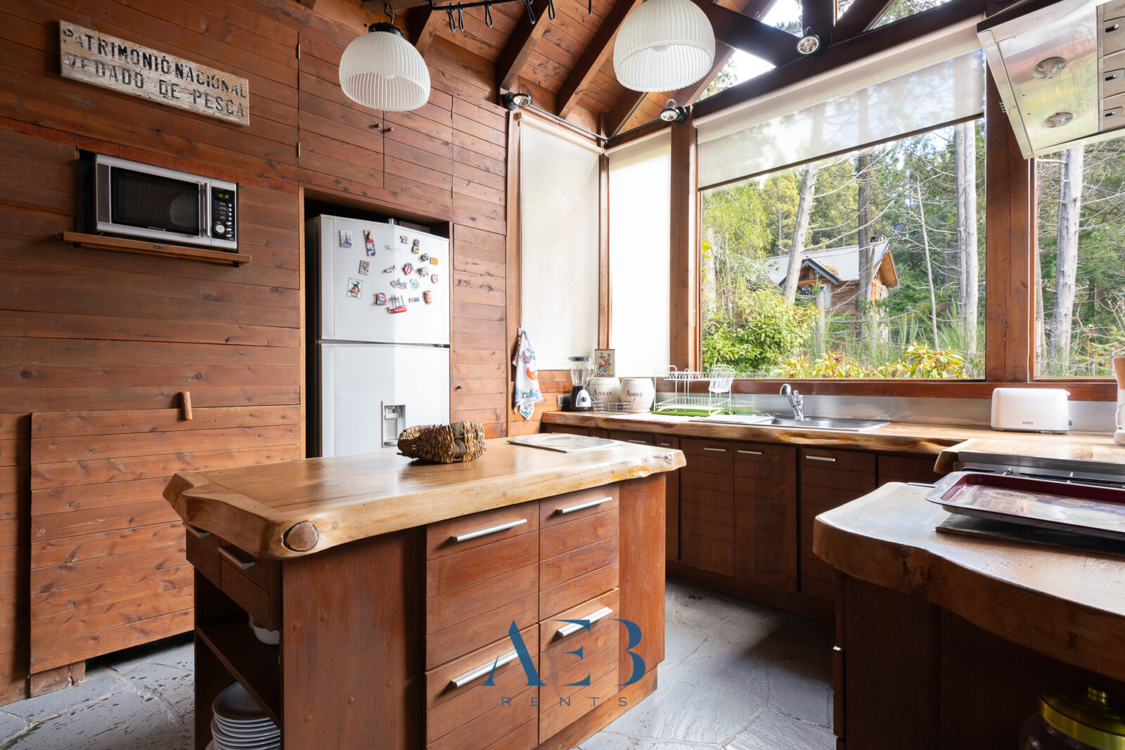 La cocina super amplia está totalmente equipada, con una isla central y una barra desayunadora.