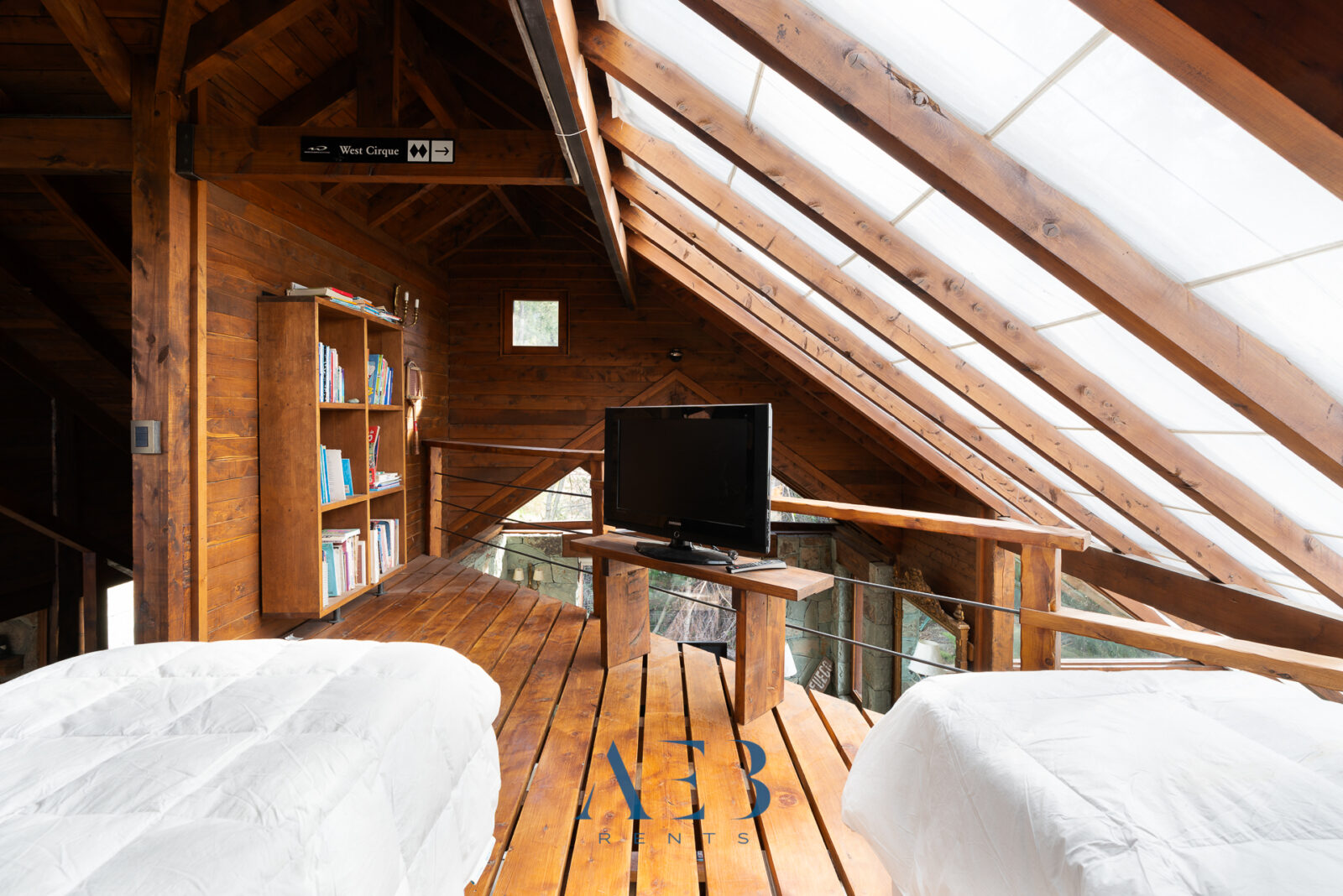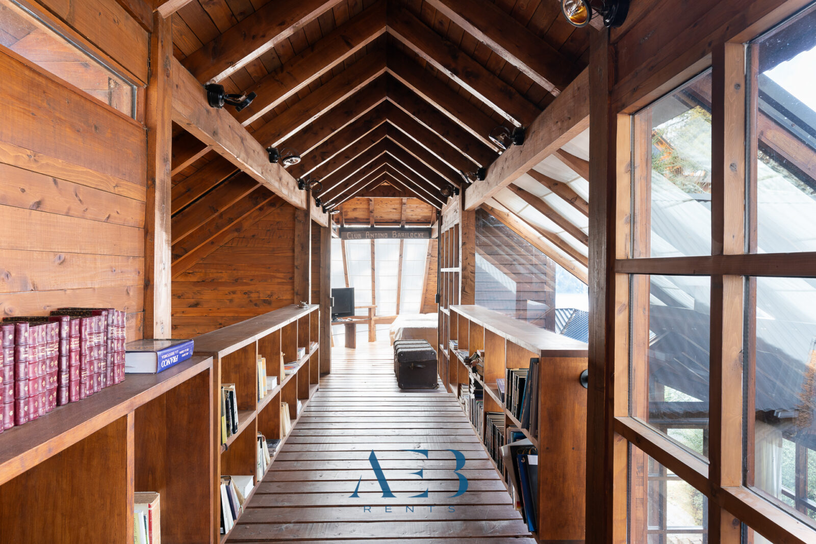 Por la escalera hacia arriba se accede a un gran espacio de biblioteca y sala de estar con amplios ventanales.