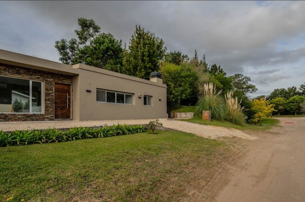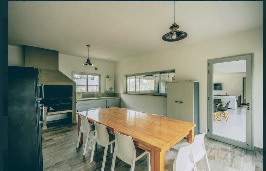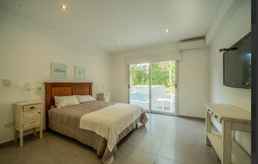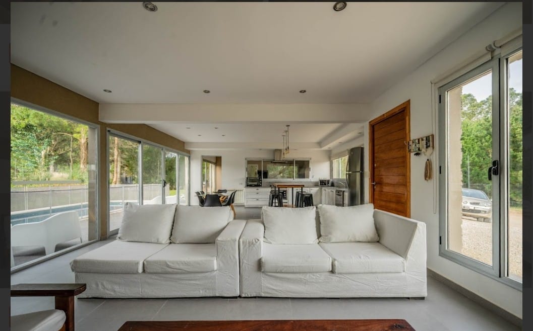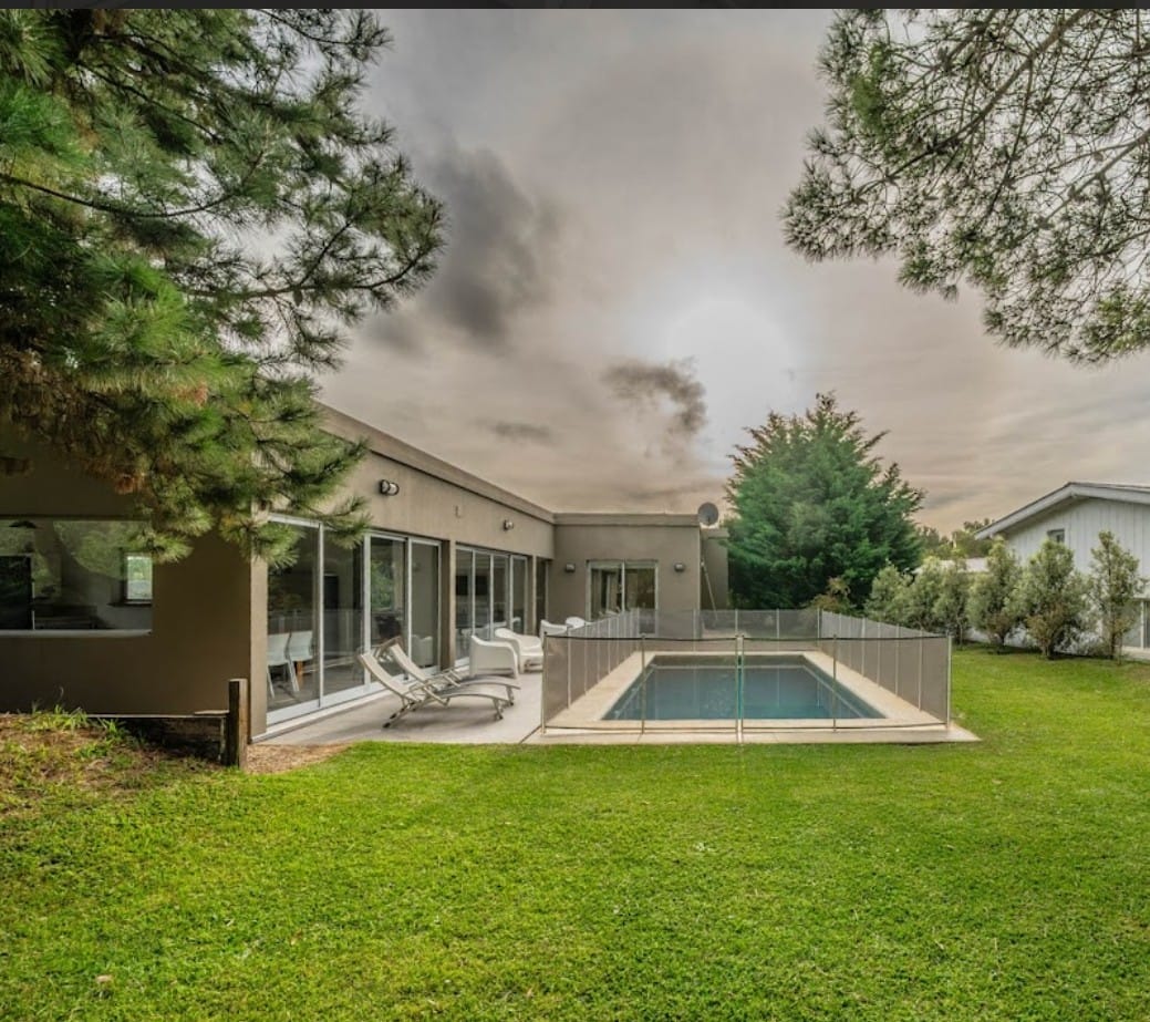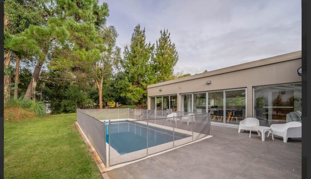 Pileta con cerco de seguridad, zona de solárium y cochera semi cubierta al frente.