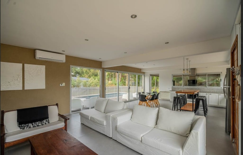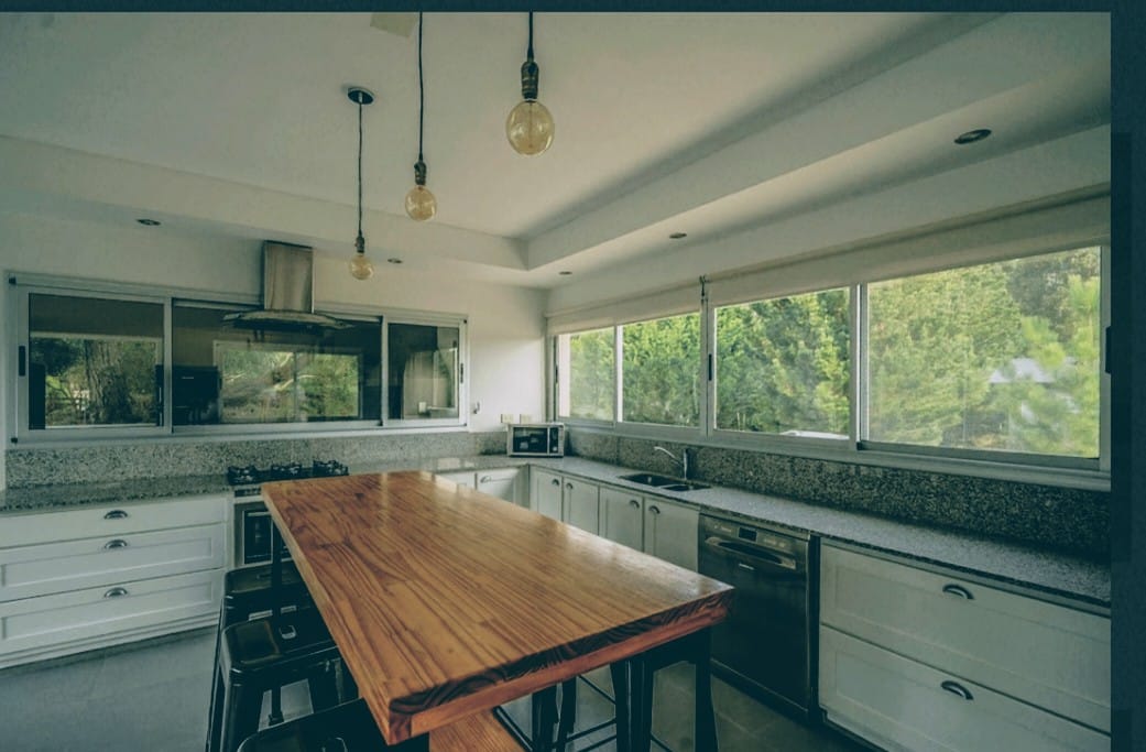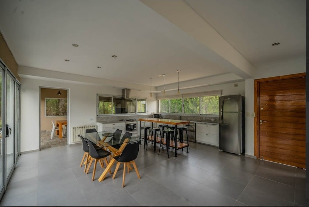 Amplio living comedor con TV y cocina integrada con lavavajilla y barra desayunador.