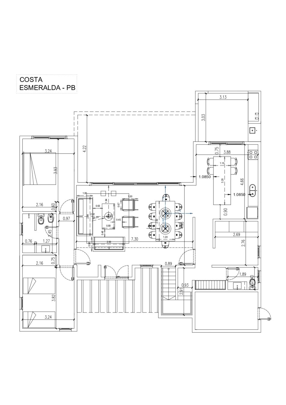 Cocina con barra desayunadora integrada al living comedor con vista a la laguna.