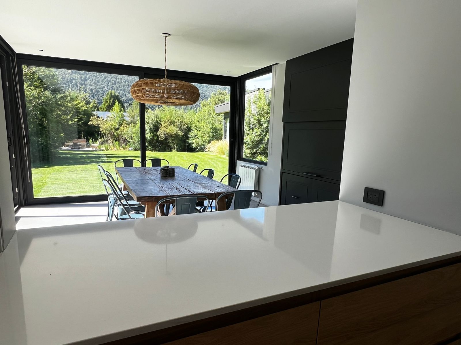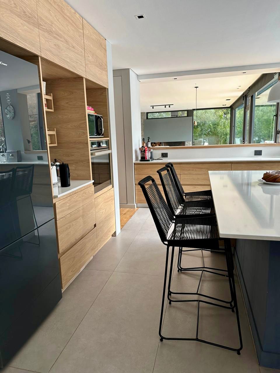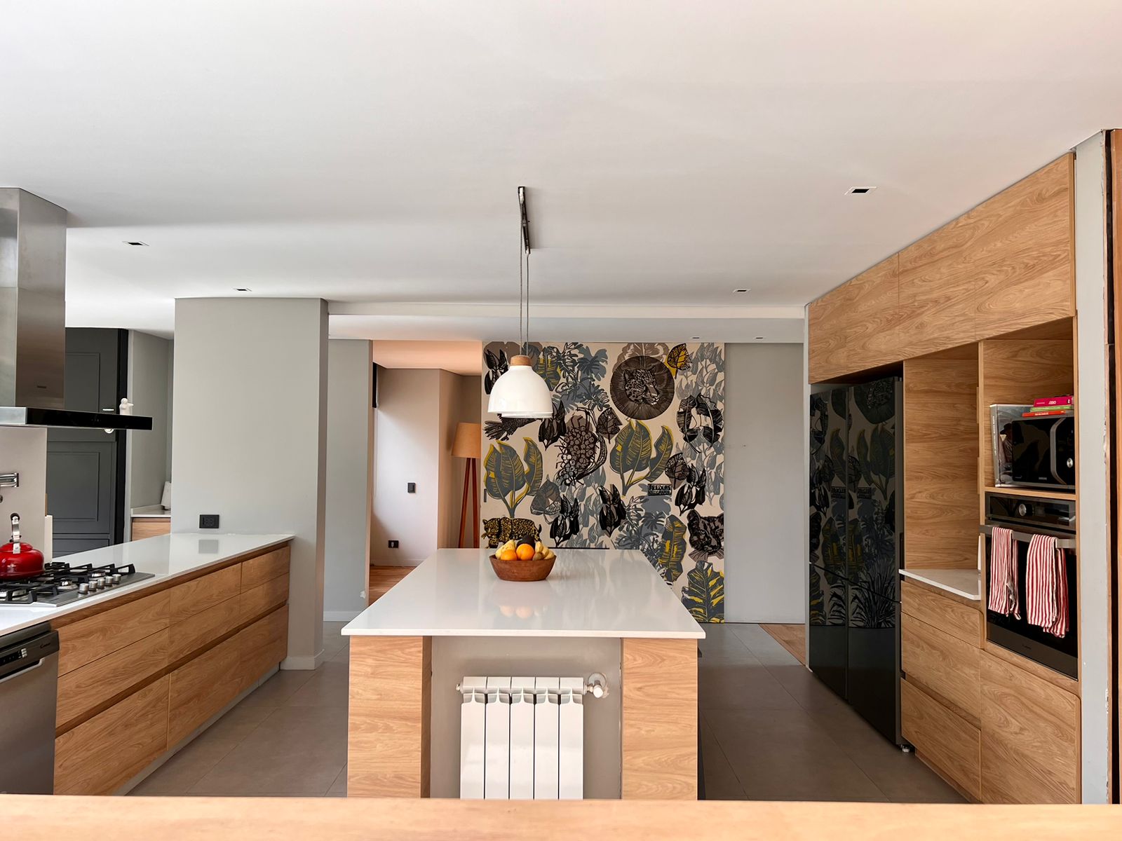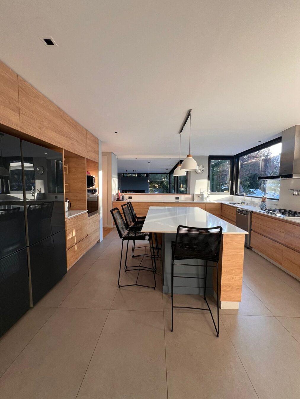 Cocina con isla, integrada al living/quincho y playroom (¡el corazón de la casa!).