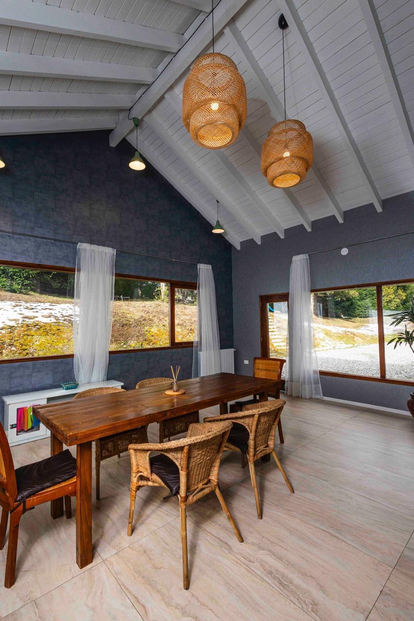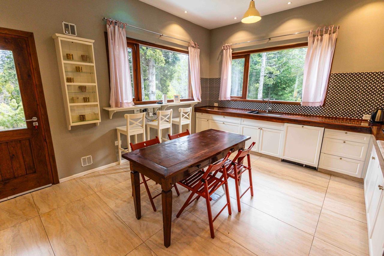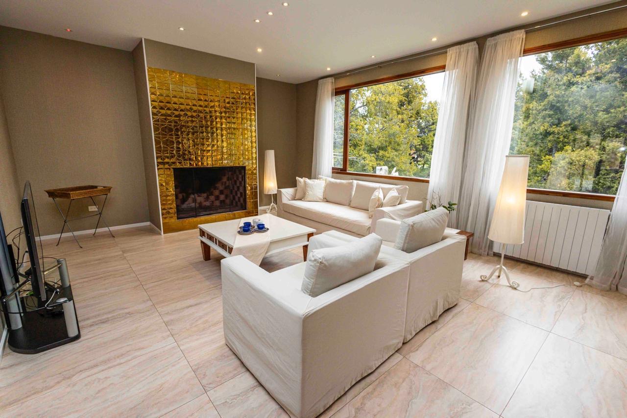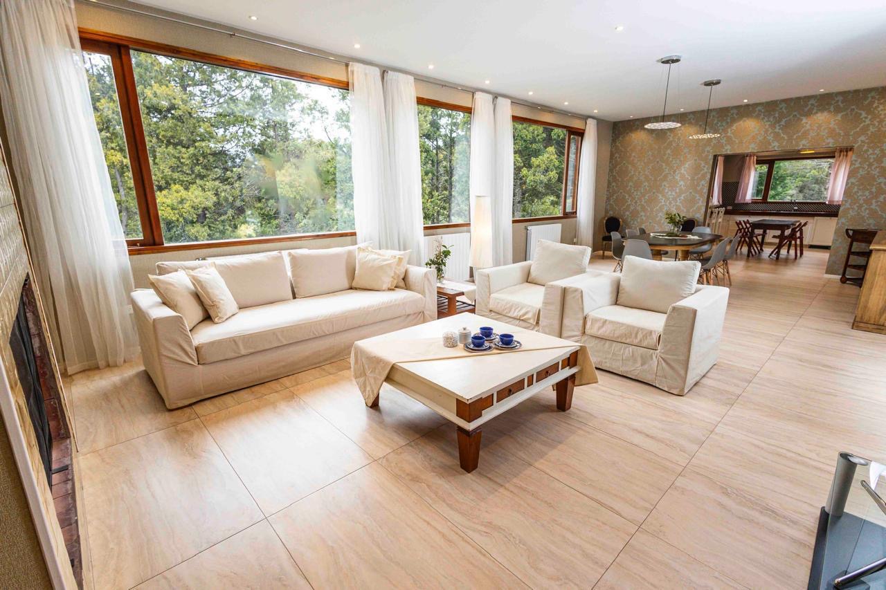 Se divide en una zona central donde encontramos un gran salón (living comedor), con chimenea, TV pantalla plana.