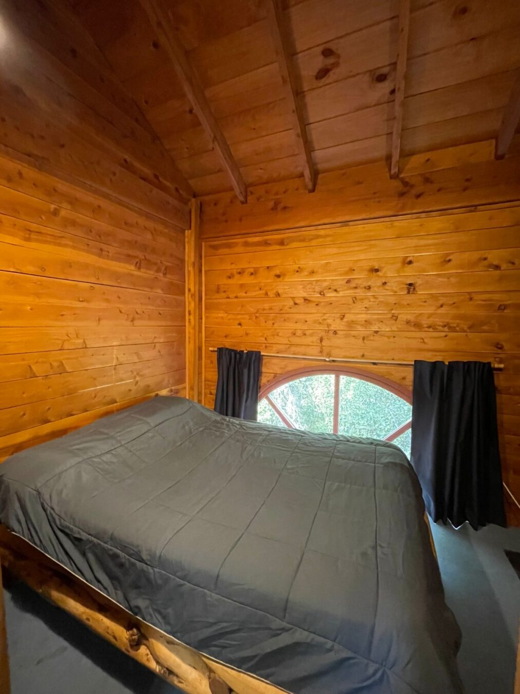 Habitación 2: Acogedor dormitorio con cama queen, destacada por una elegante ventana en forma de semicírculo que inunda el espacio de luz natural. Justo enfrente se encuentra un baño completo con bañadera.