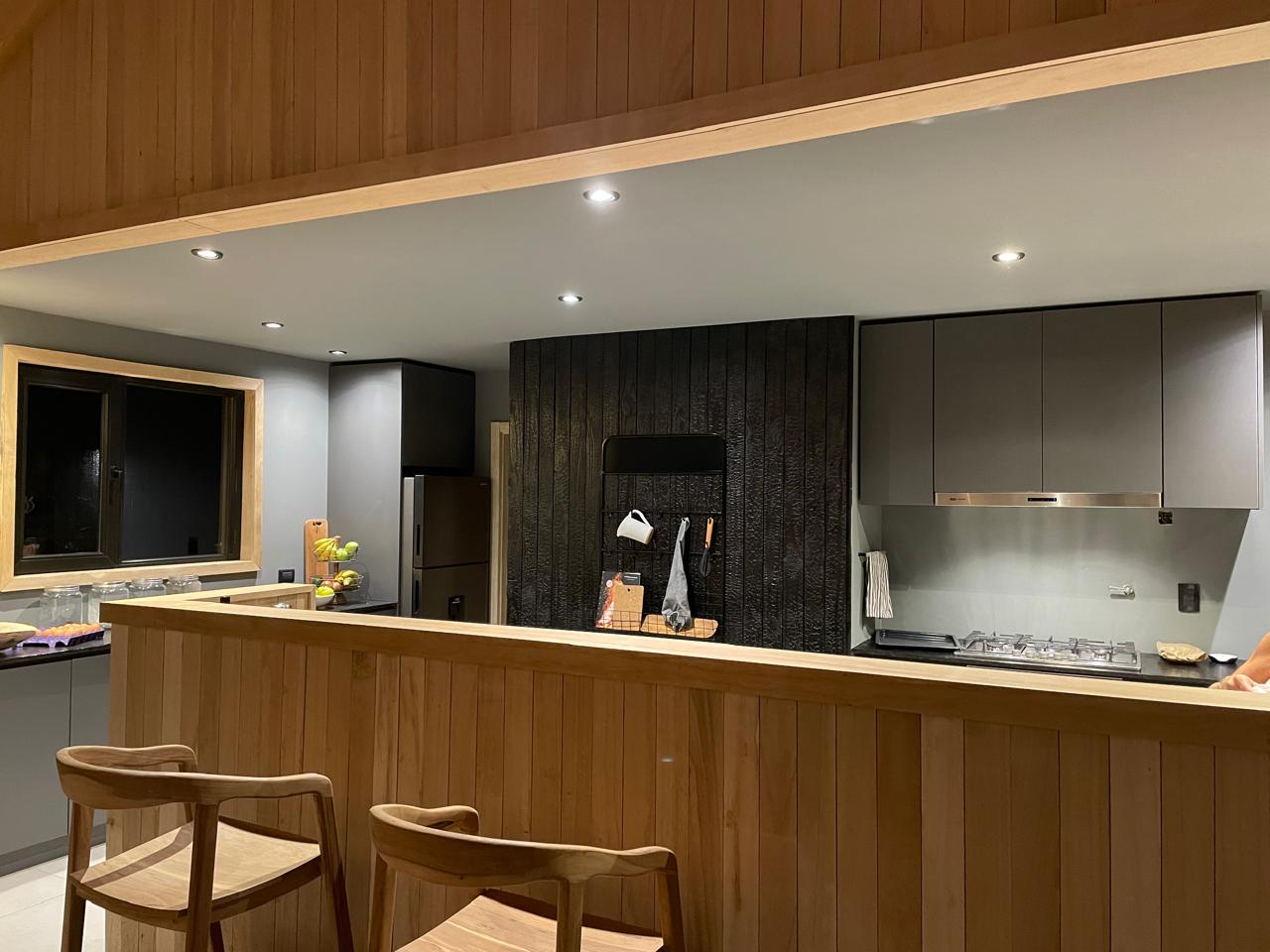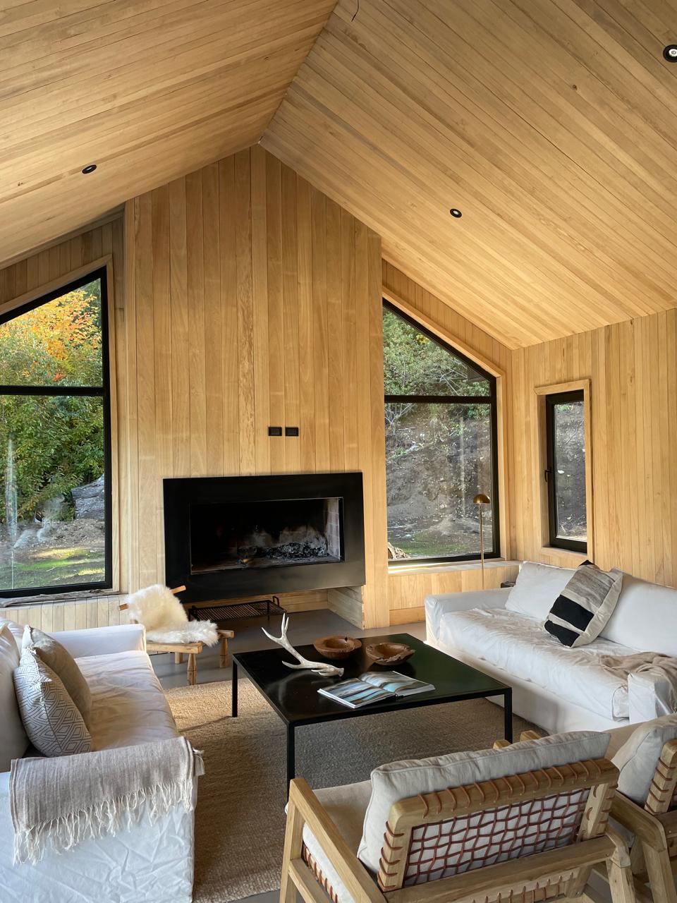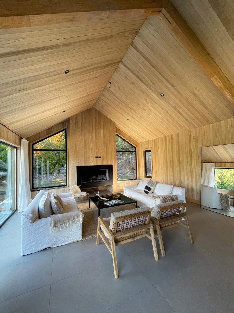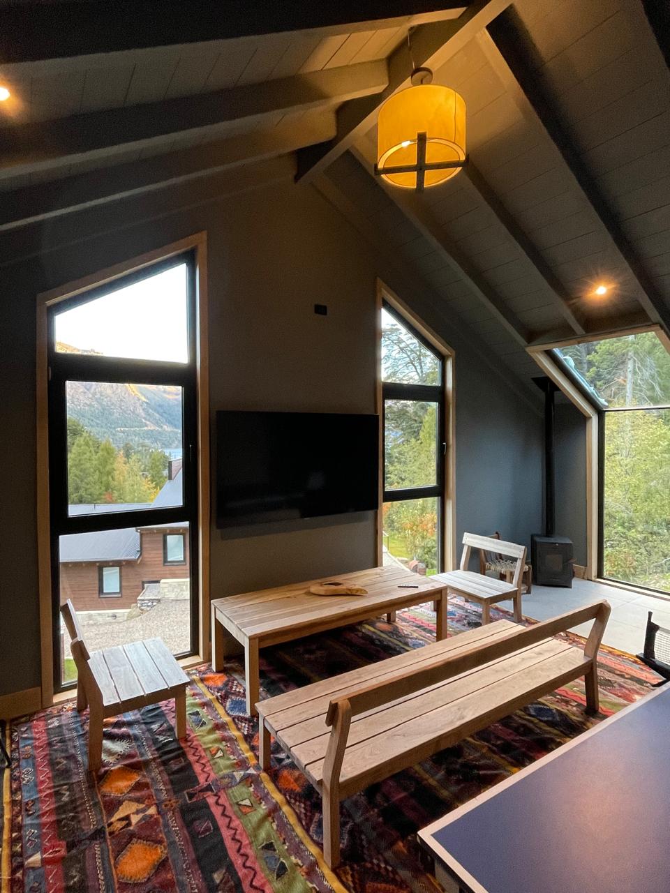 Espacio común: Espacio abierto con cocina grande (con lavaplatos), mesa de comedor para 12 personas, living room con chimenea y galería. Todo con vista al lago y montañas.