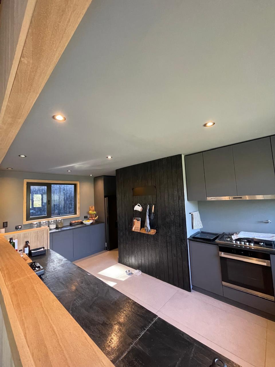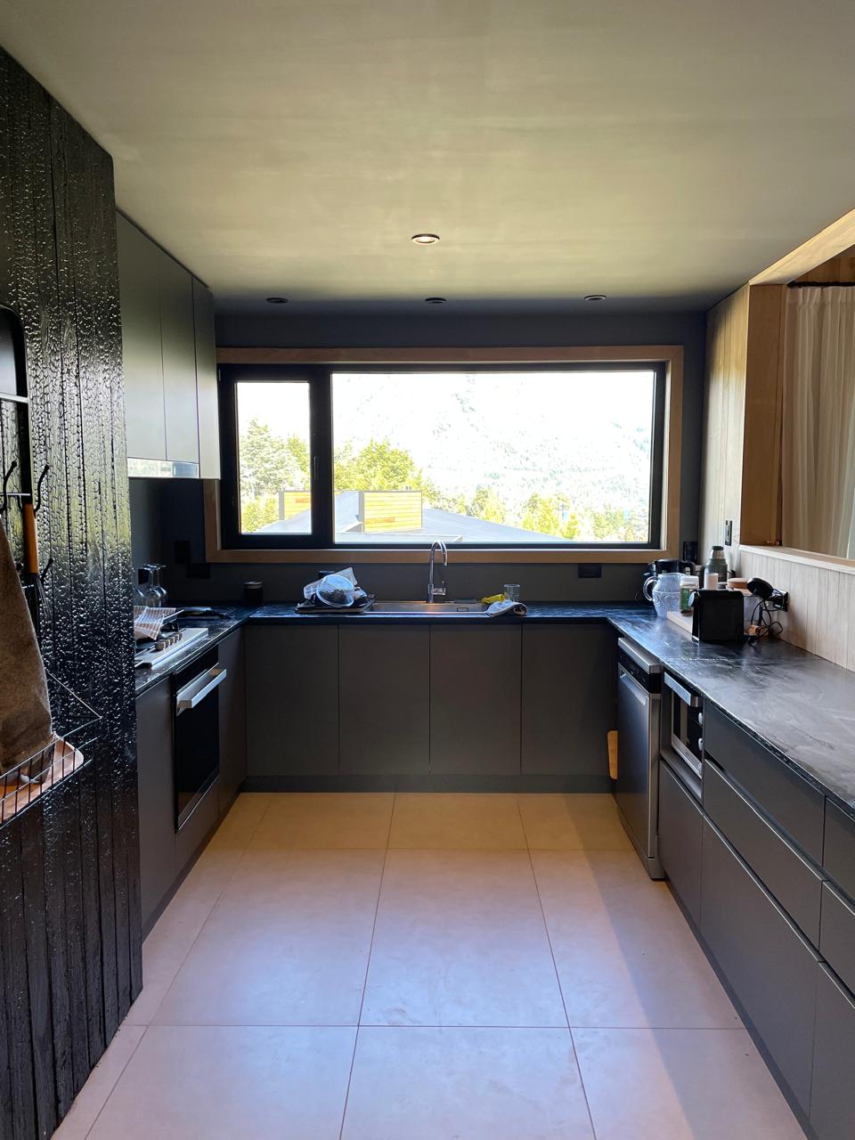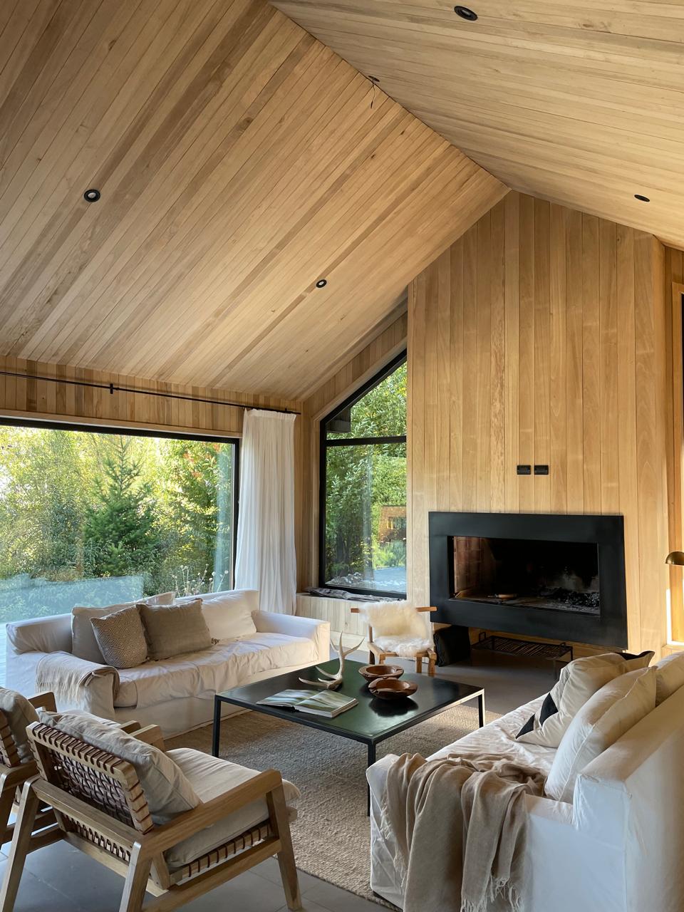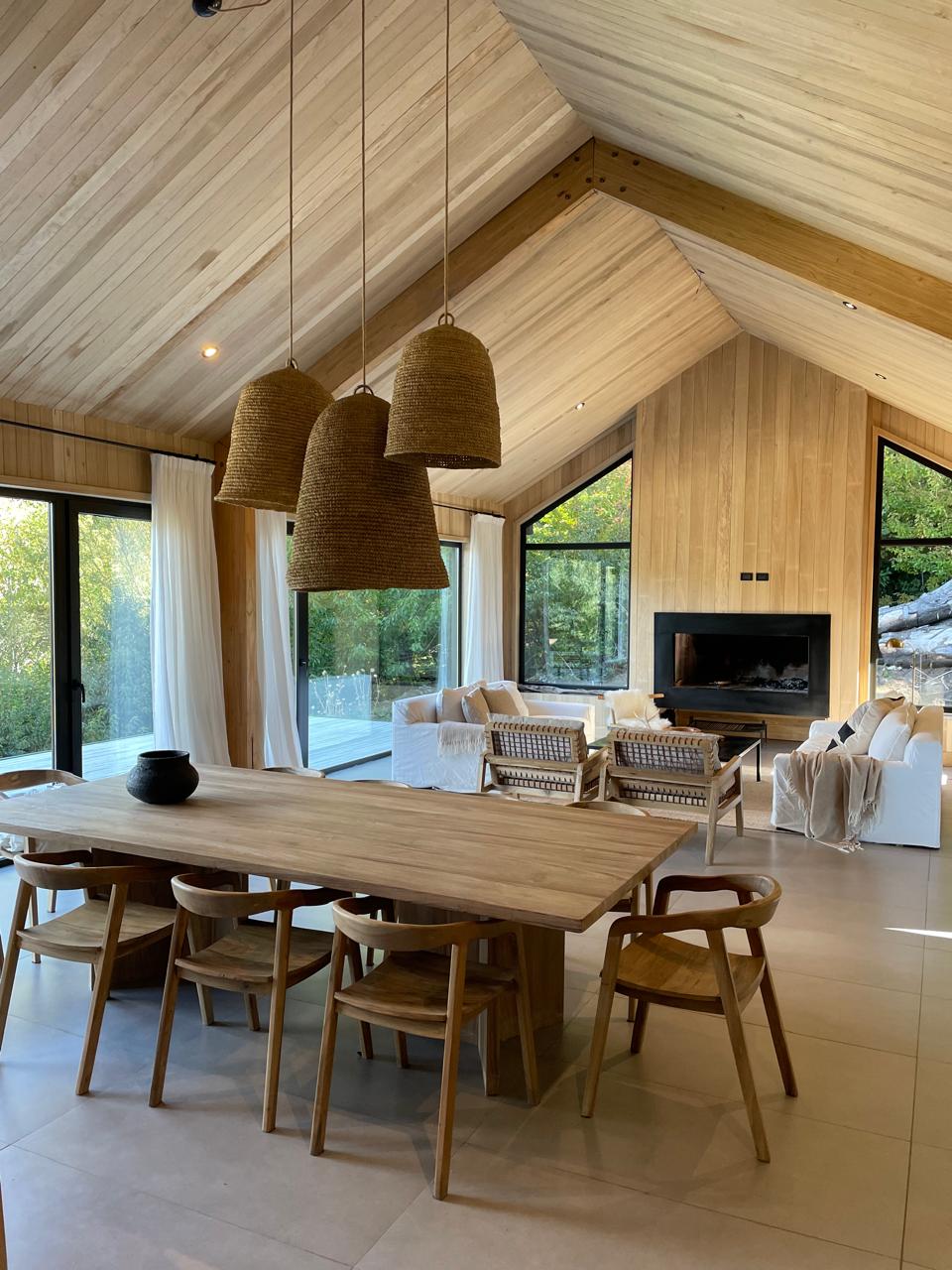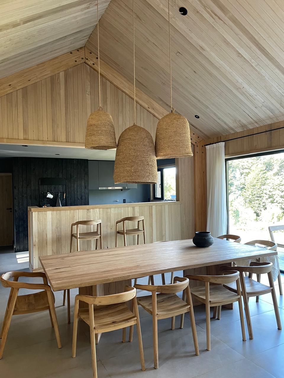 Espacio común: Espacio abierto con cocina grande (con lavaplatos), mesa de comedor para 12 personas, living room con chimenea y galería. Todo con vista al lago y montañas.