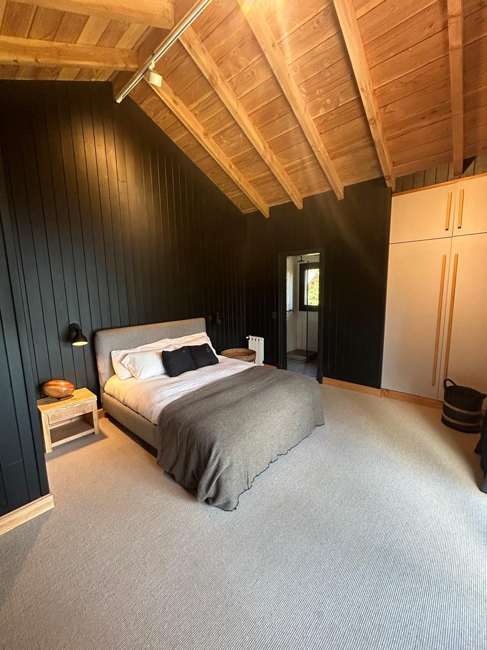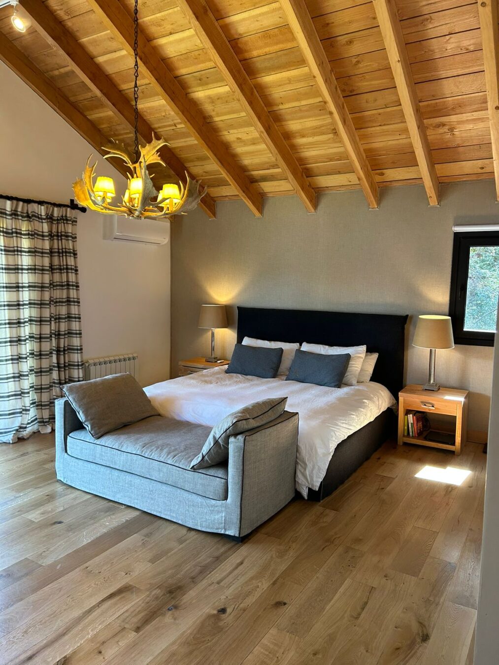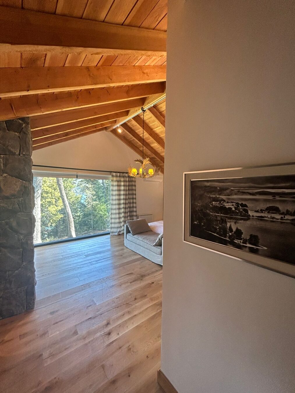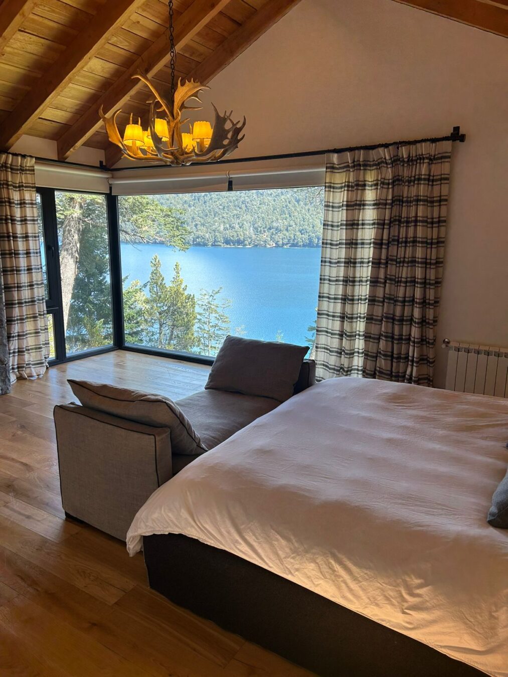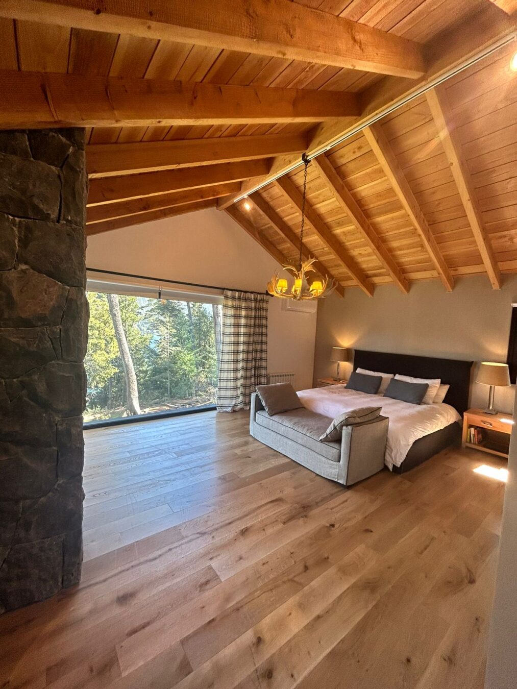 • Dormitorio principal: cama super King (2×2), aire acondicionado, cortinas blackout con control remoto. Vista al Lago Gutiérrez y Cerro Catedral. Baño en suite con bañera y vestidor.