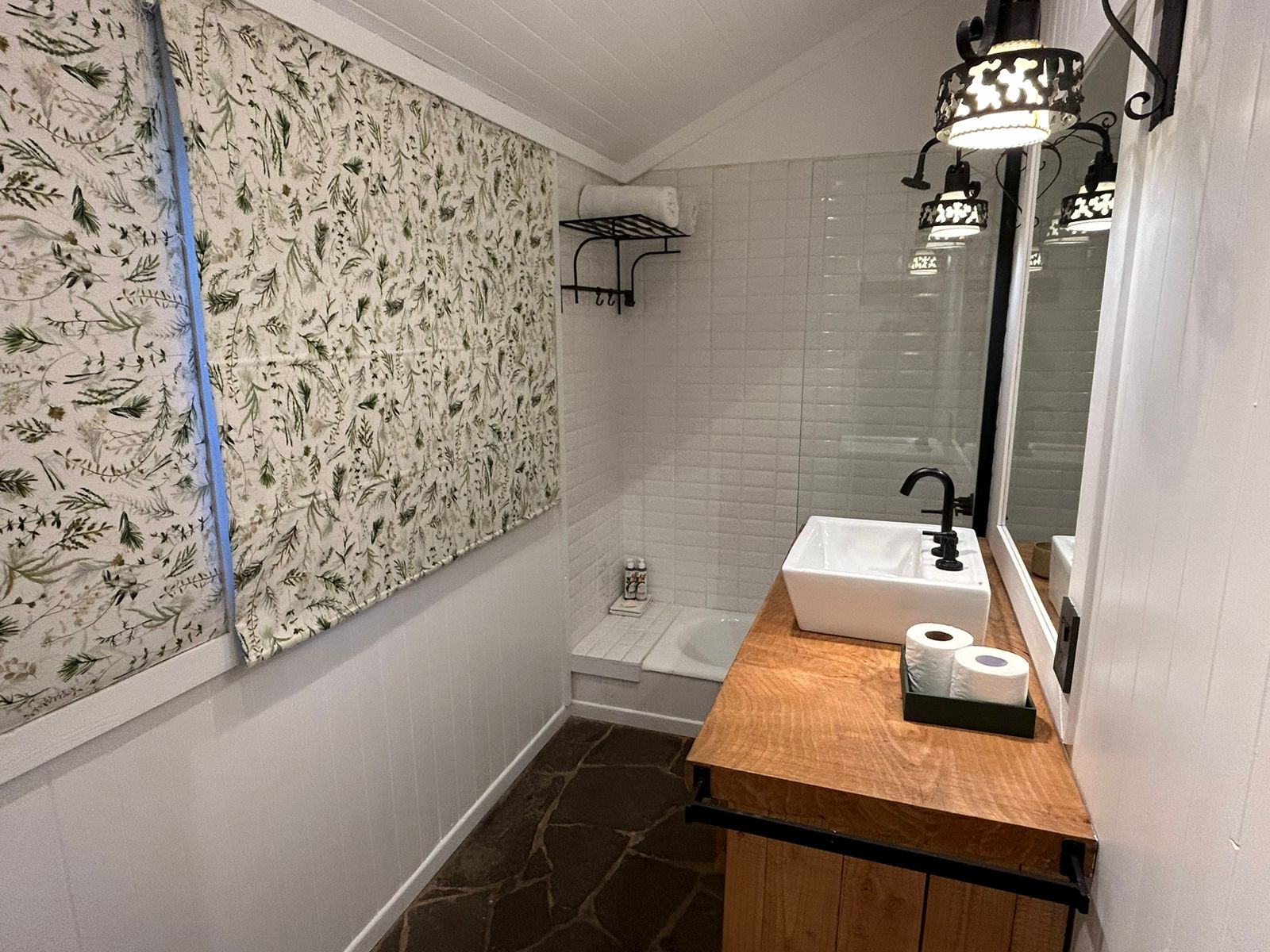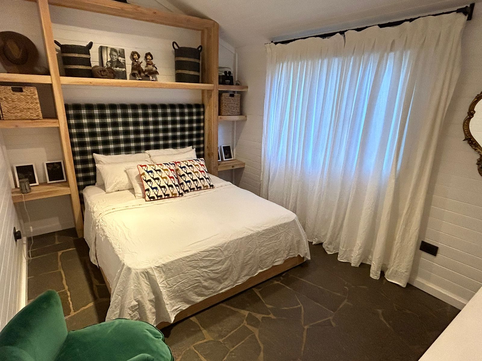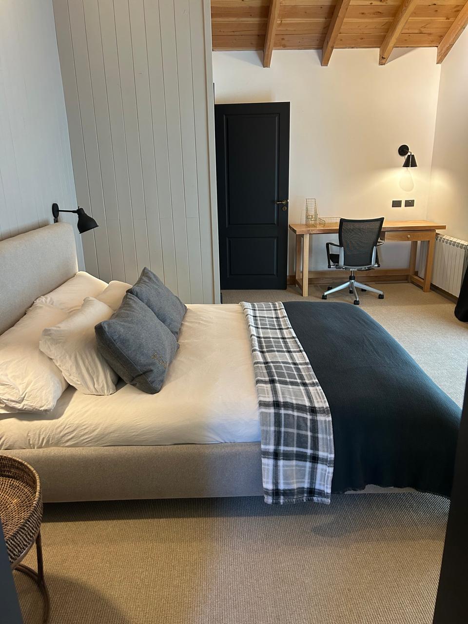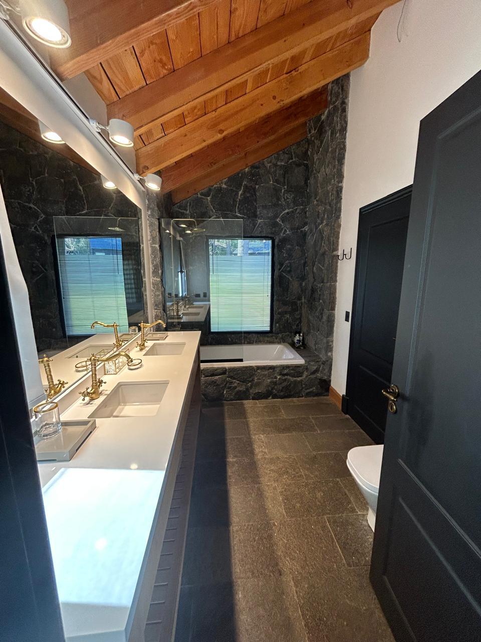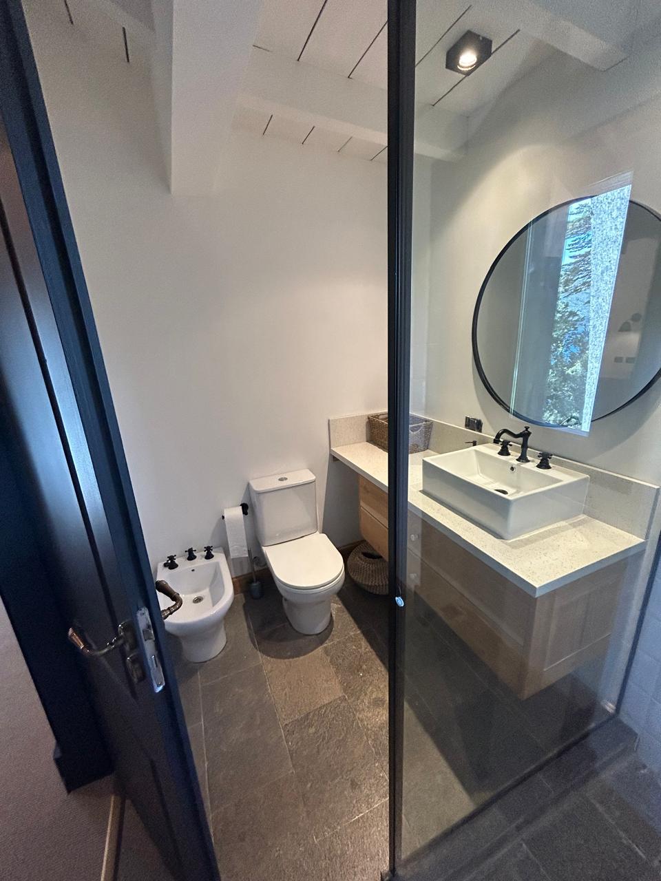 • Dormitorio principal: cama super King (2×2), aire acondicionado, cortinas blackout con control remoto. Vista al Lago Gutiérrez y Cerro Catedral. Baño en suite con bañera y vestidor.