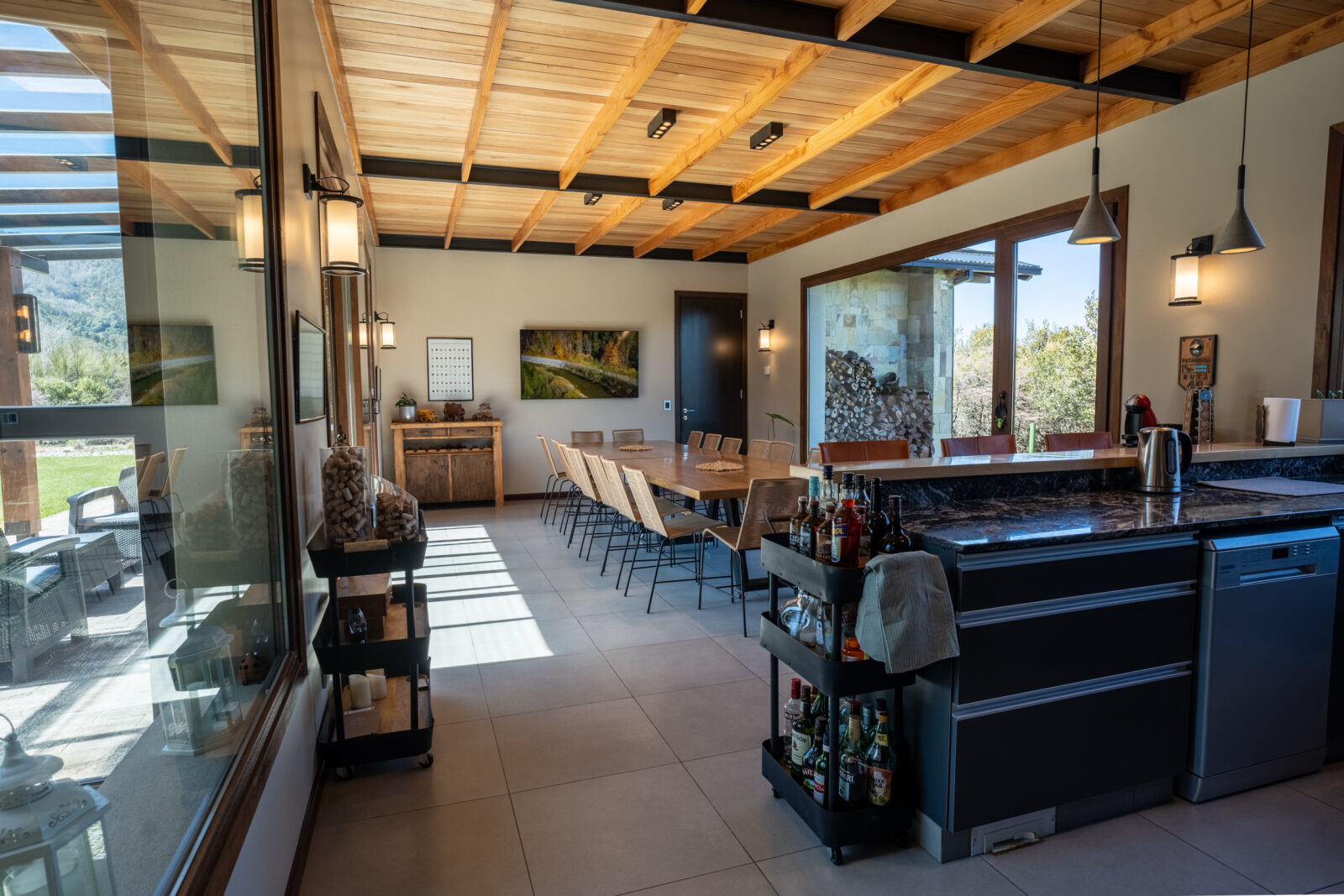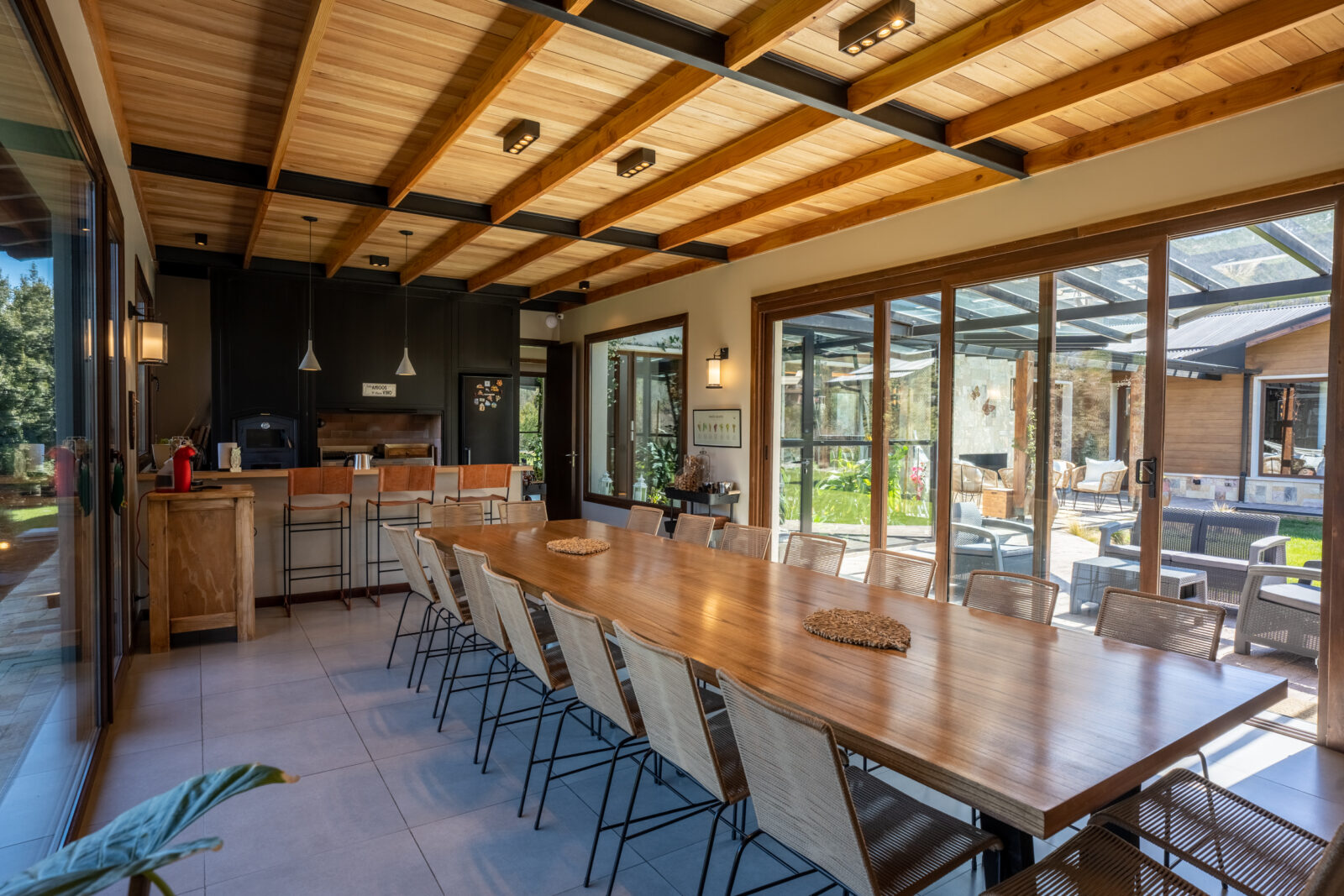 El amplio quincho, con espacio para 18 comensales cómodamente ubicados, cuenta además con Parrilla a Gas de 4 quemadores, Horno a Leña Tromen y Horno Pizzero, y todo lo necesario para los amantes de la cocina y los asados en familia/amigos.