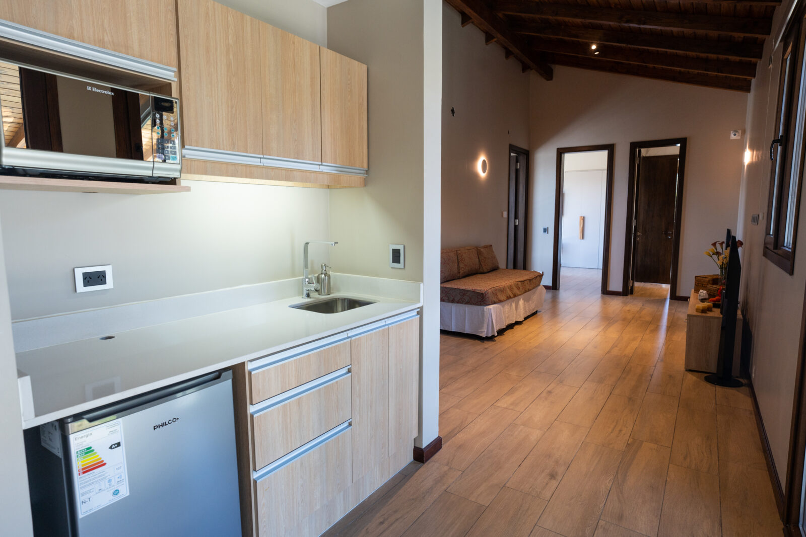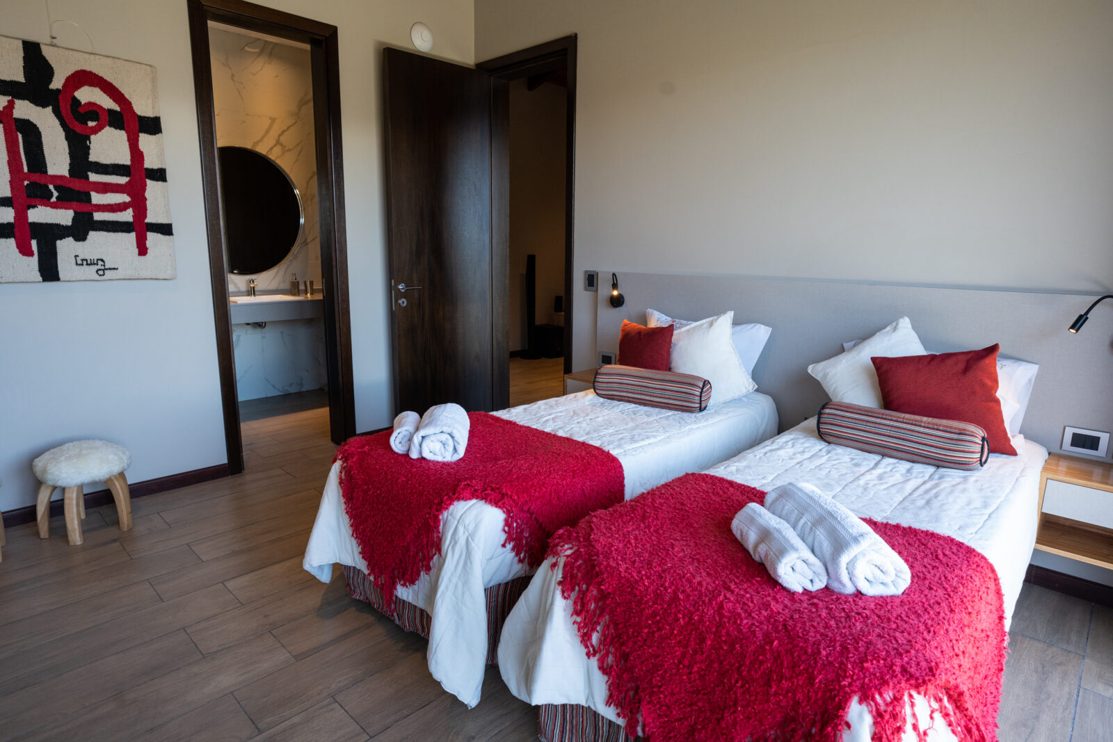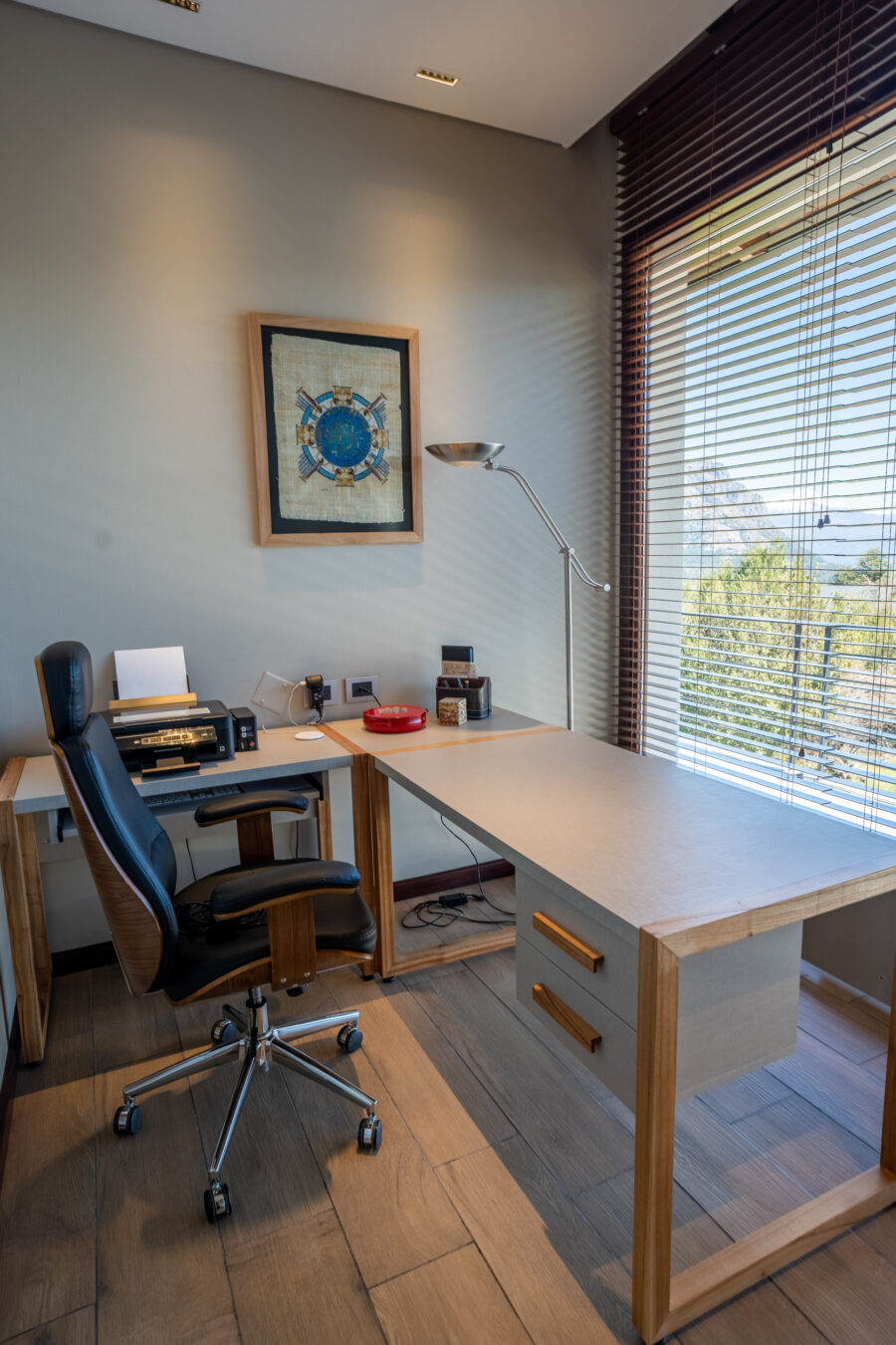 Cuenta con Toilette, Living Comedor, Cocina, quincho y SUM) con las áreas privadas de la casa (el primer piso donde se encuentran dos habitaciones en suite, cada una para dos personas y un escritorio privado ideal para aquellos que combinan el relax de las vacaciones con espacios de trabajo online). Asimismo, la planta alta cuenta con Kitchenette totalmente equipada y un amplio Salón donde encontramos un futón cama ideal para ubicar a dos huéspedes.