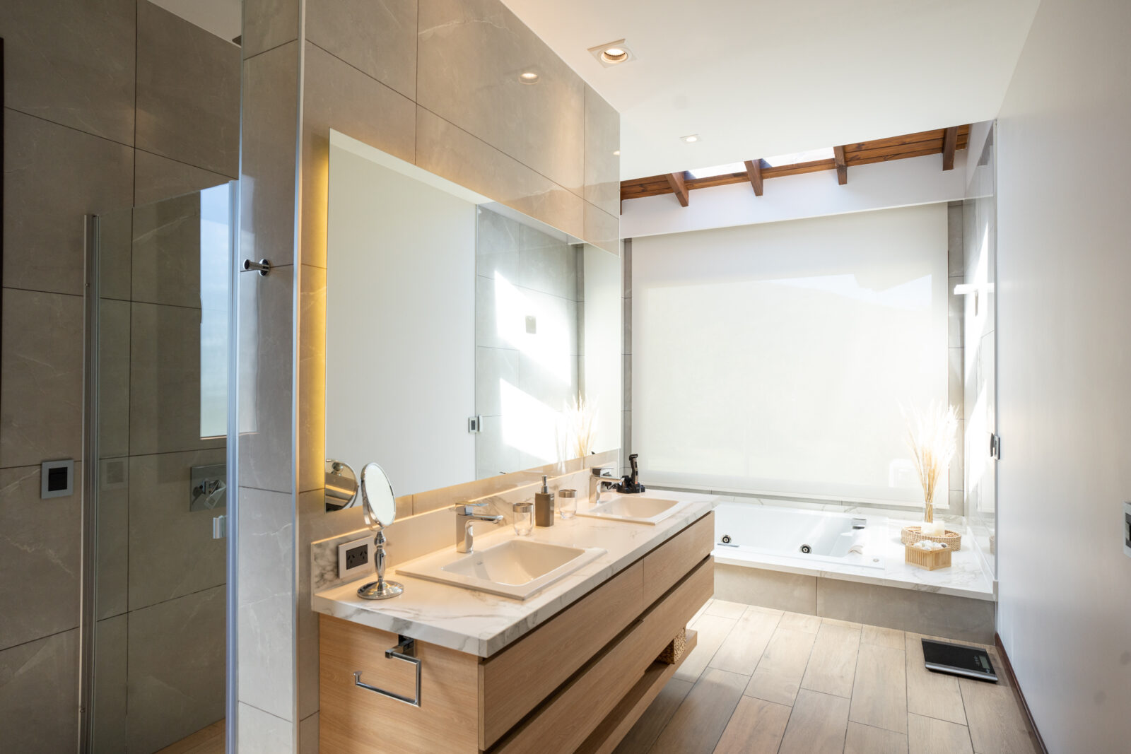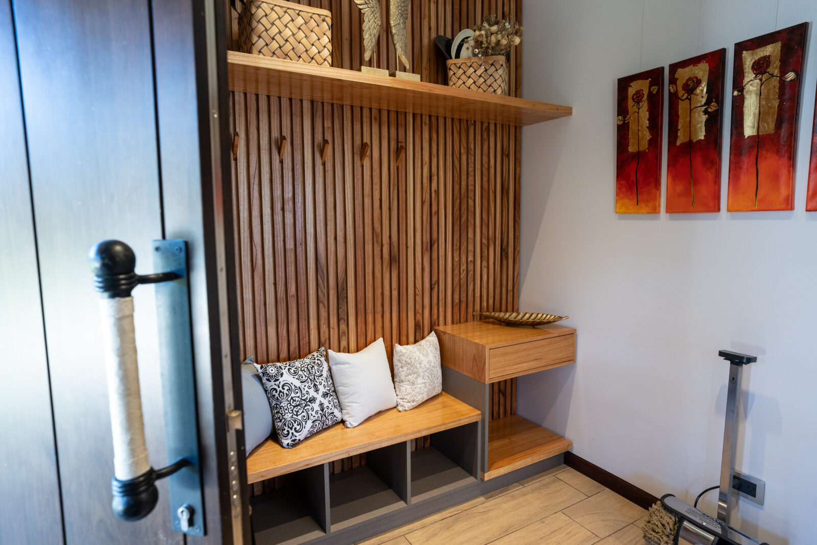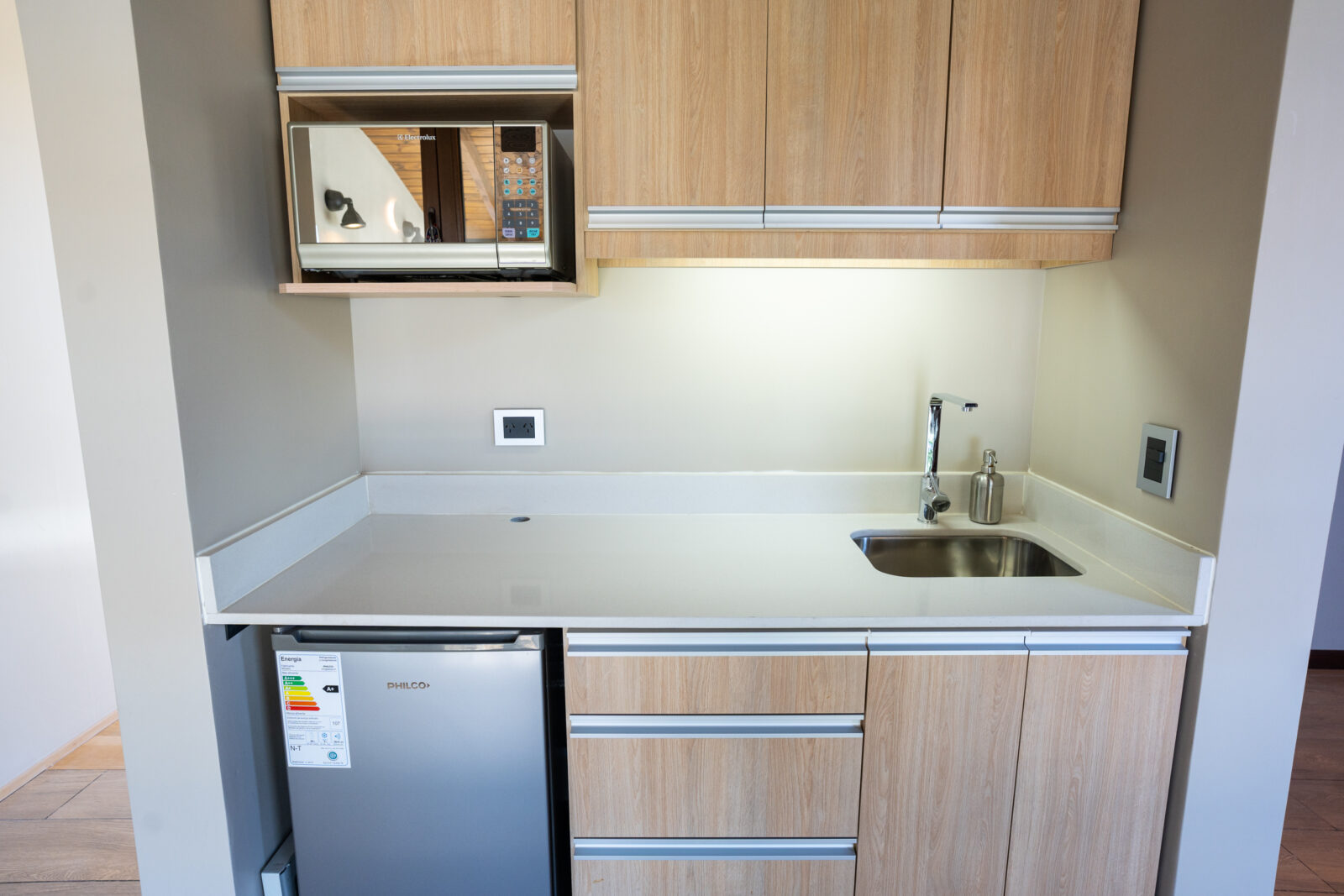 Cuenta con Toilette, Living Comedor, Cocina, quincho y SUM) con las áreas privadas de la casa (el primer piso donde se encuentran dos habitaciones en suite, cada una para dos personas y un escritorio privado ideal para aquellos que combinan el relax de las vacaciones con espacios de trabajo online). Asimismo, la planta alta cuenta con Kitchenette totalmente equipada y un amplio Salón donde encontramos un futón cama ideal para ubicar a dos huéspedes.