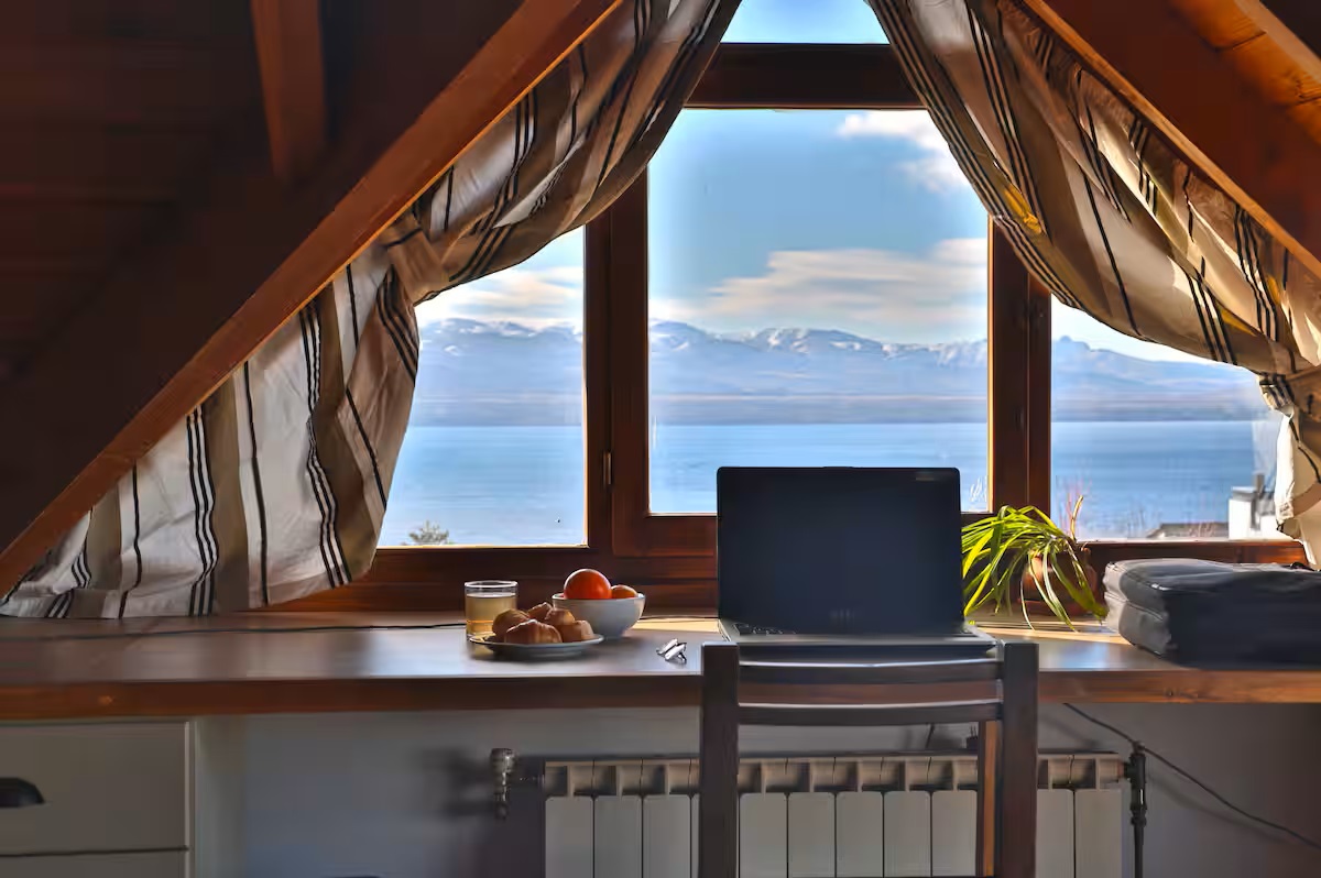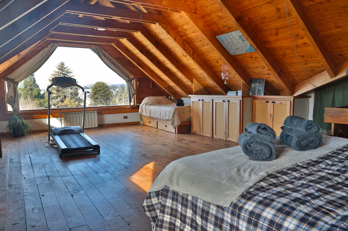También cuenta con un amplio espacio para trabajar y hacer ejercicio con vista al lago.