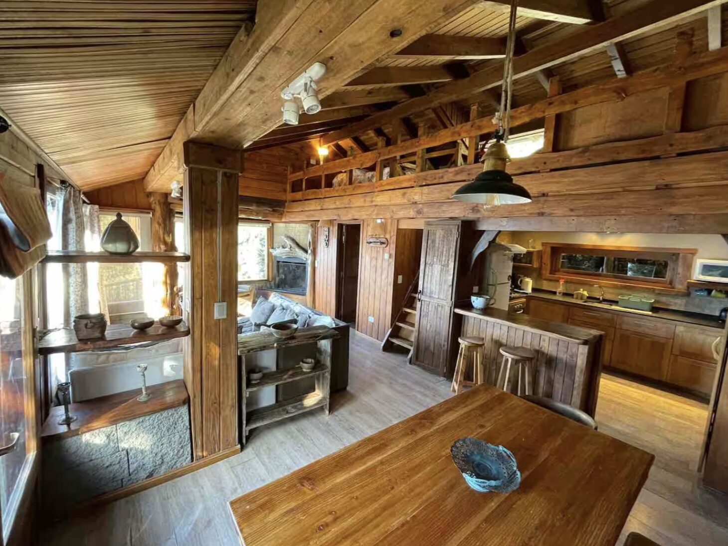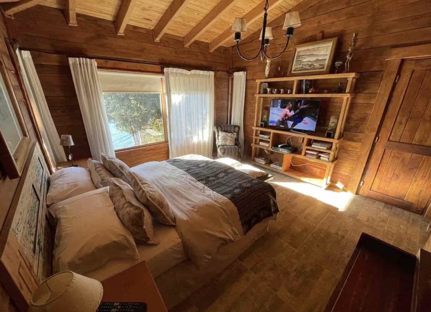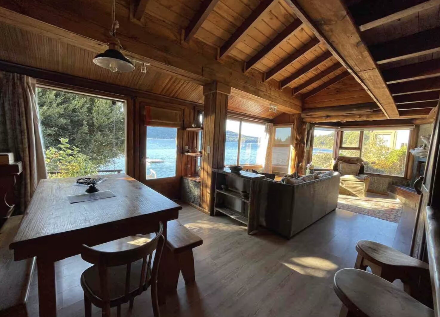 Tiene un dormitorio grande con baño en suit . Living con vista al lago . Mesa de comedor para 4 barra que da la cocina la cual esta equipada para poder cocinar con: horno pava electrica heladera grande. . La cabaña sale a un deck muy grande con mesa exterior para desayunar comer y pasar momentos unicos sobre el lago. JACUZZI CON USO OPCIONAL USD 10 POR DIA,