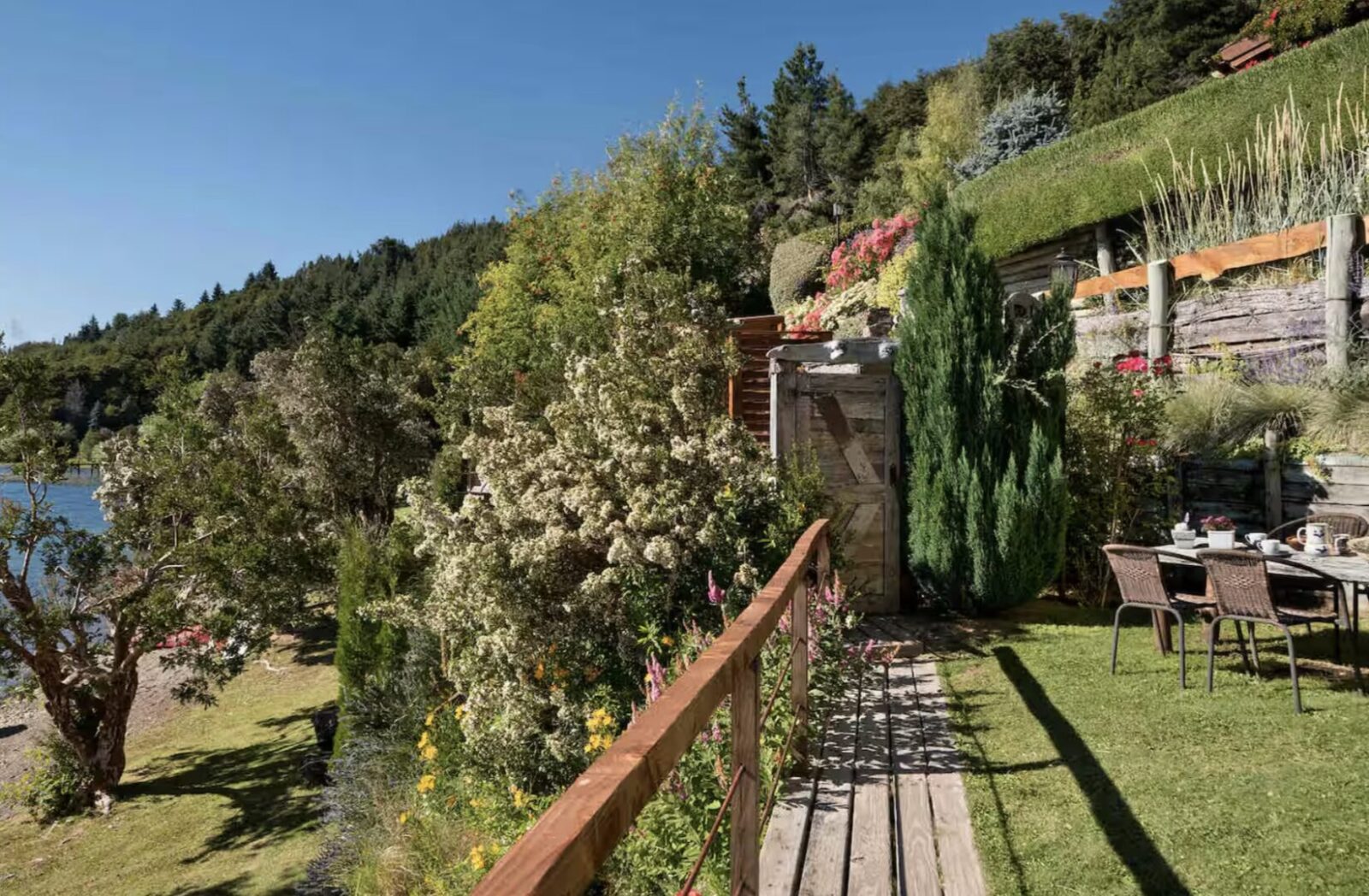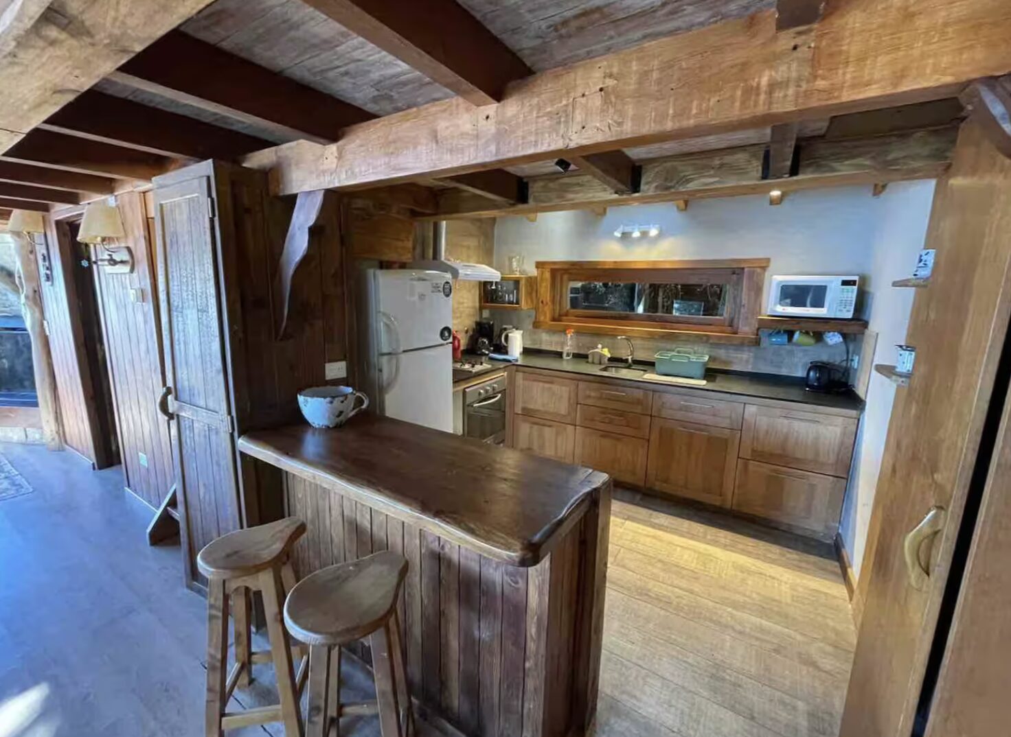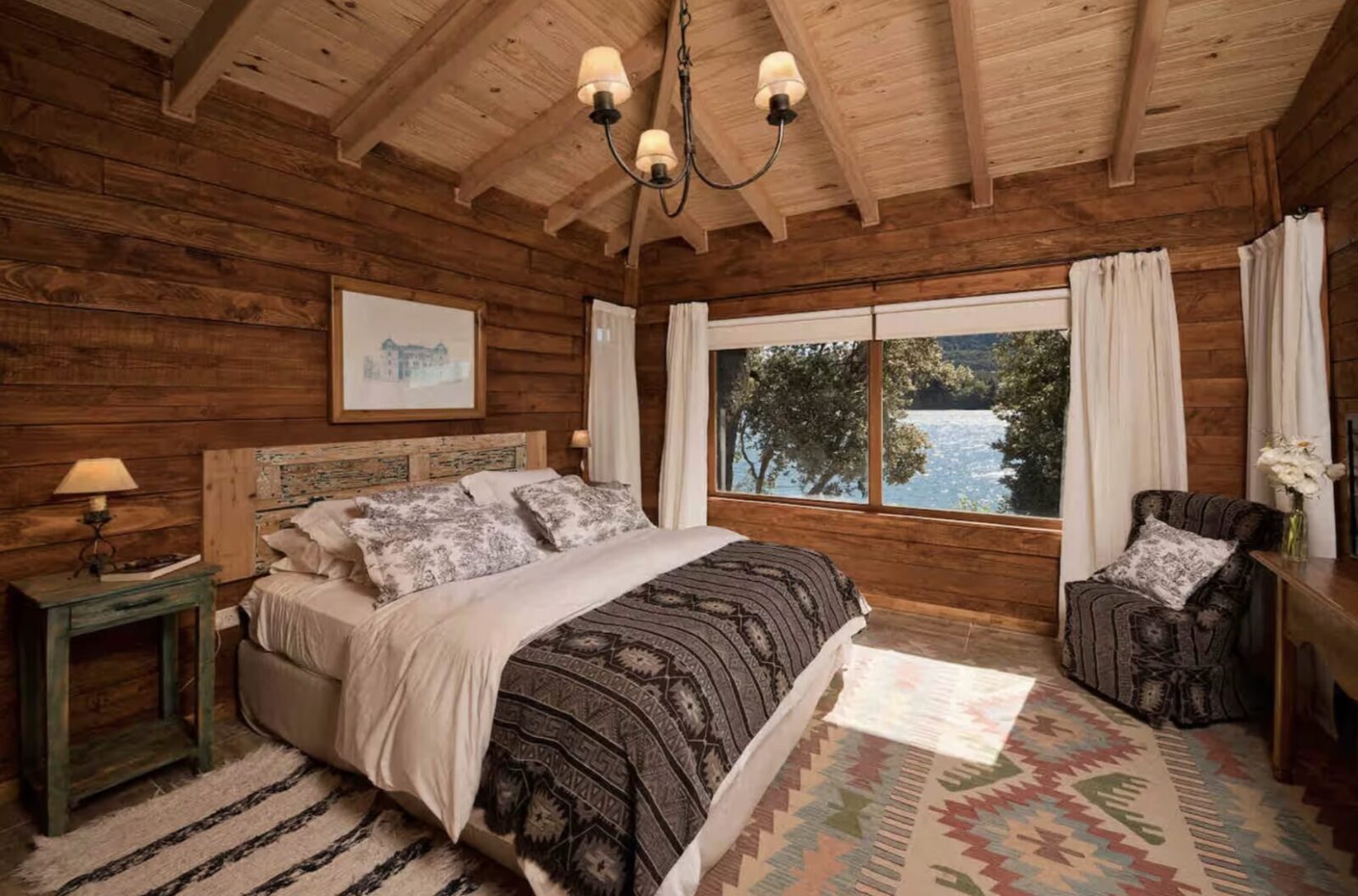 Tiene un dormitorio grande con baño en suit . Living con vista al lago . Mesa de comedor para 4 barra que da la cocina la cual esta equipada para poder cocinar con: horno pava electrica heladera grande. . La cabaña sale a un deck muy grande con mesa exterior para desayunar comer y pasar momentos unicos sobre el lago. JACUZZI CON USO OPCIONAL USD 10 POR DIA,