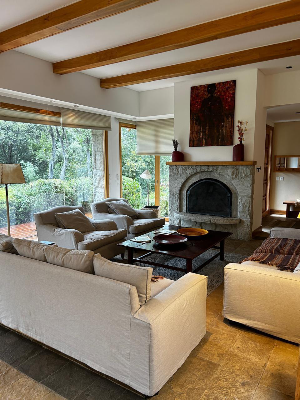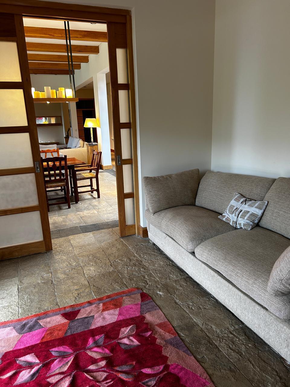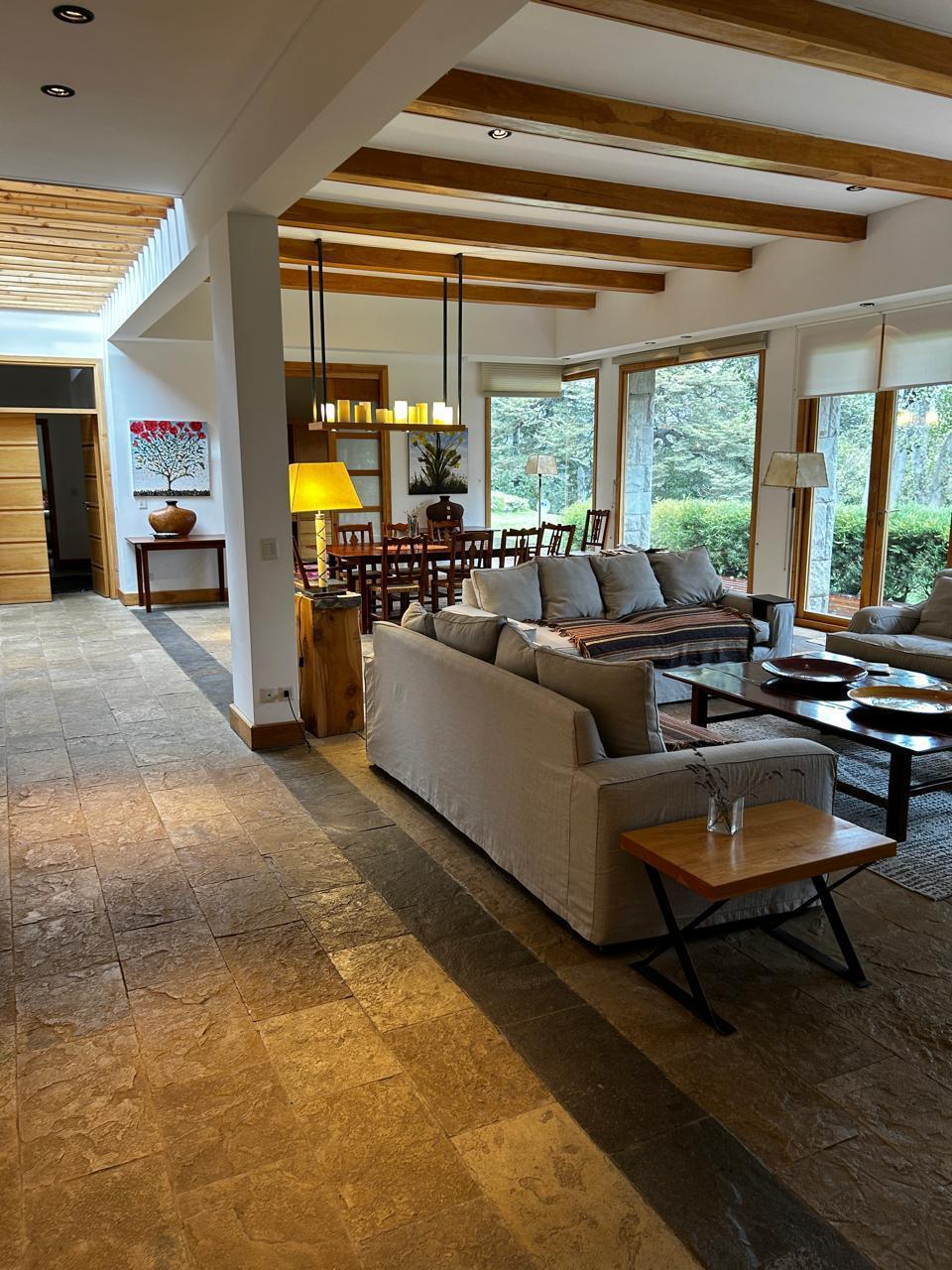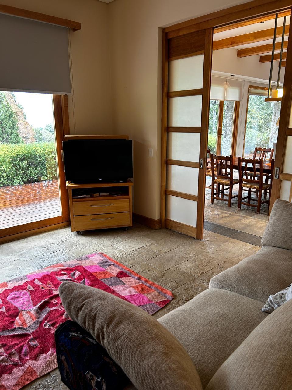 Casa muy luminosa en una sola planta. Tiene 3 habitaciones y un playroom que puede ser habitacion. Tres baños, cocina amplia integrada al living comedor. Lavadero con lavarropas y secarropas. jardin plano. Muy cerca del starter del golf.