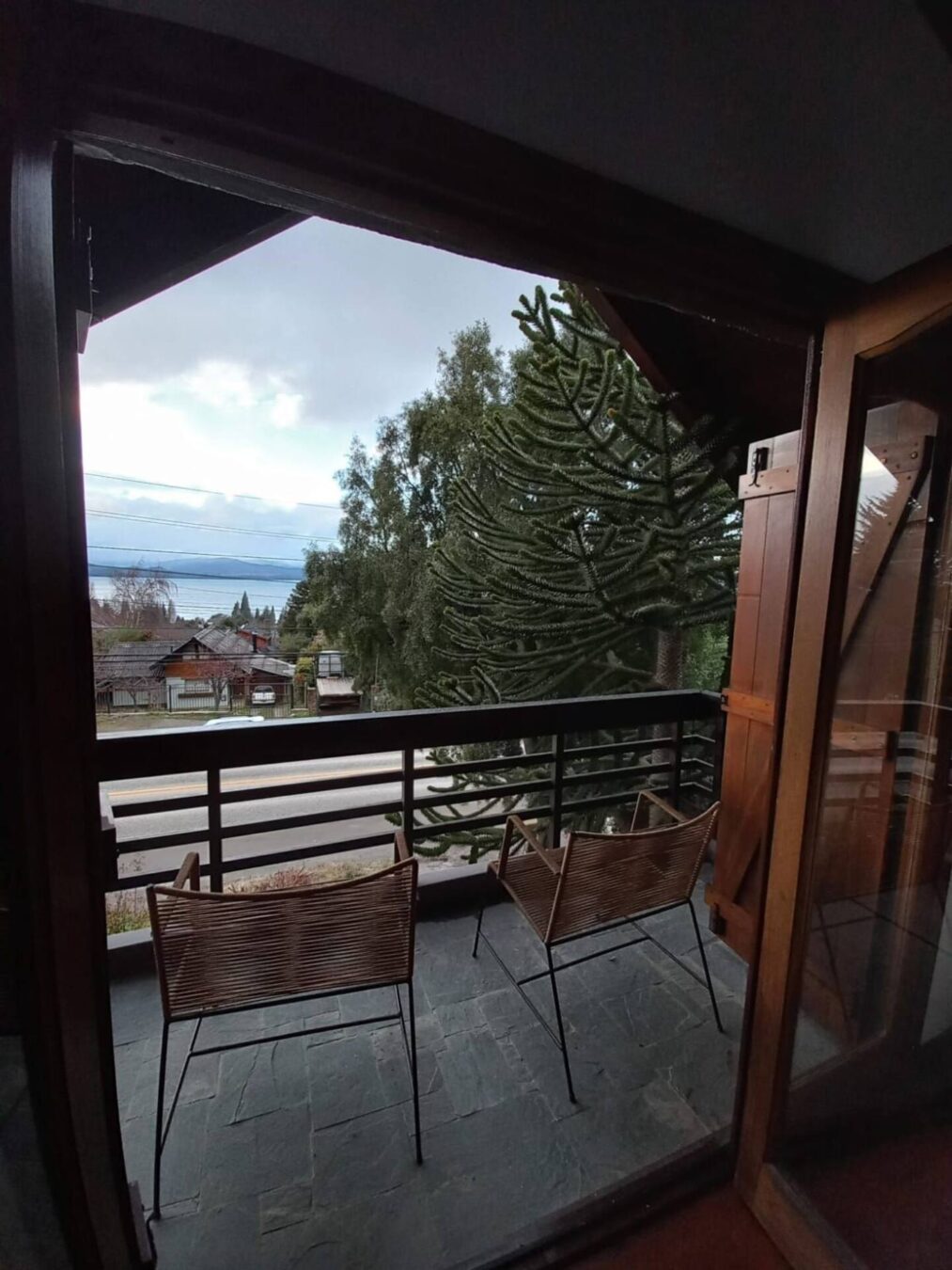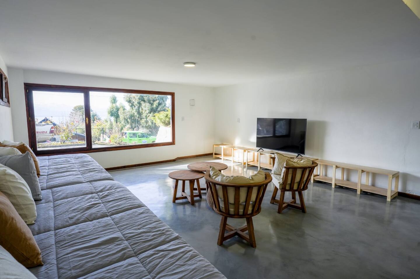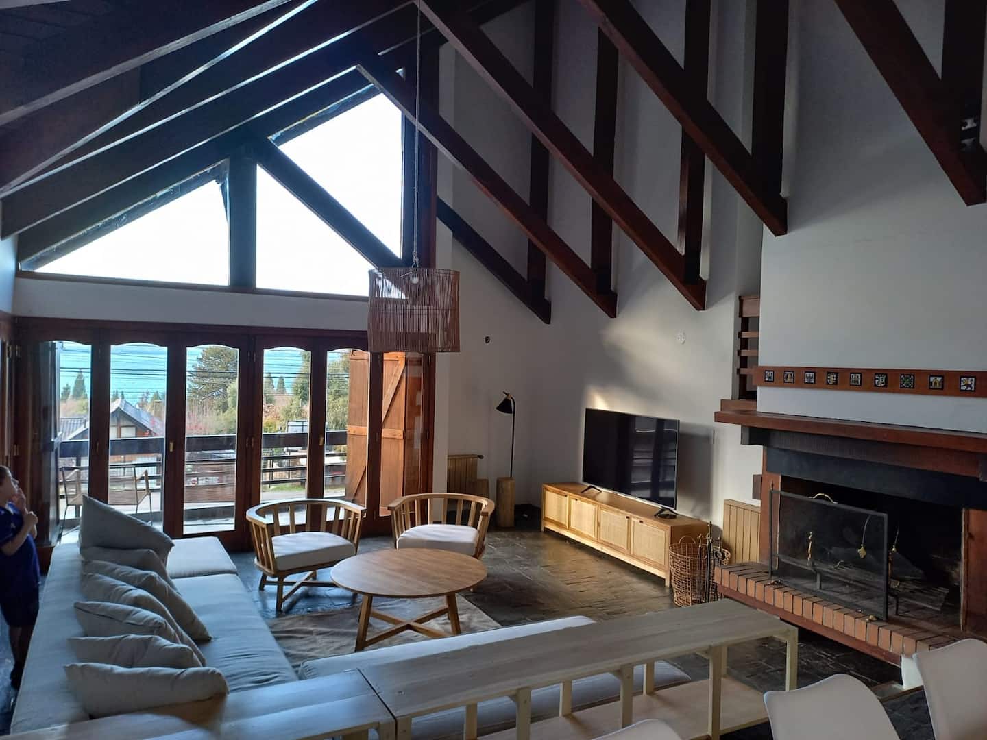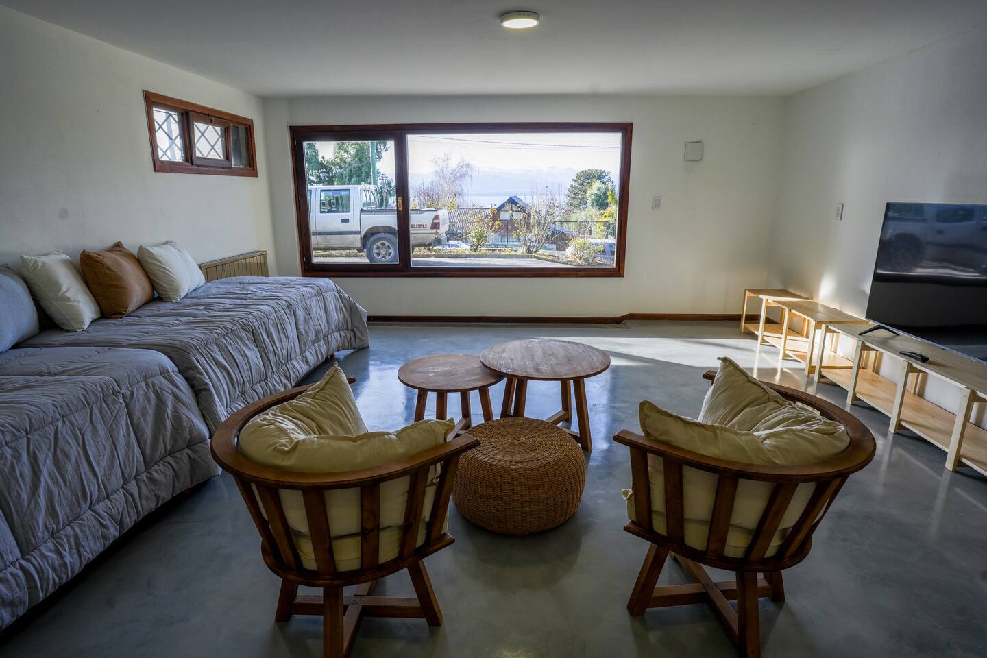 El living es amplio con hogar a leña y vista al Lago Nahuel Huapi cuenta con una TV.