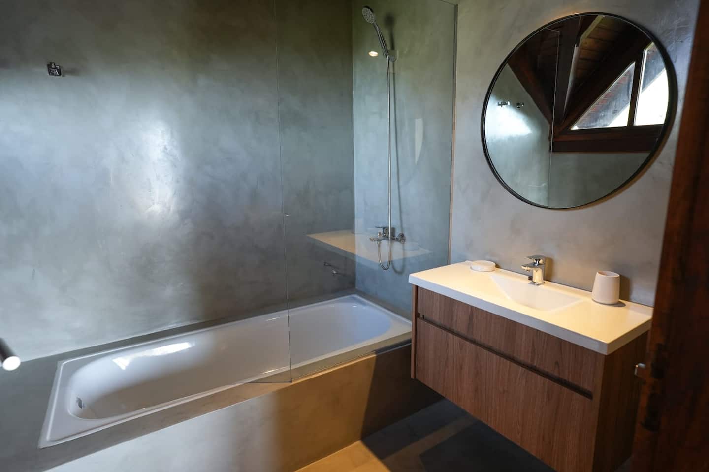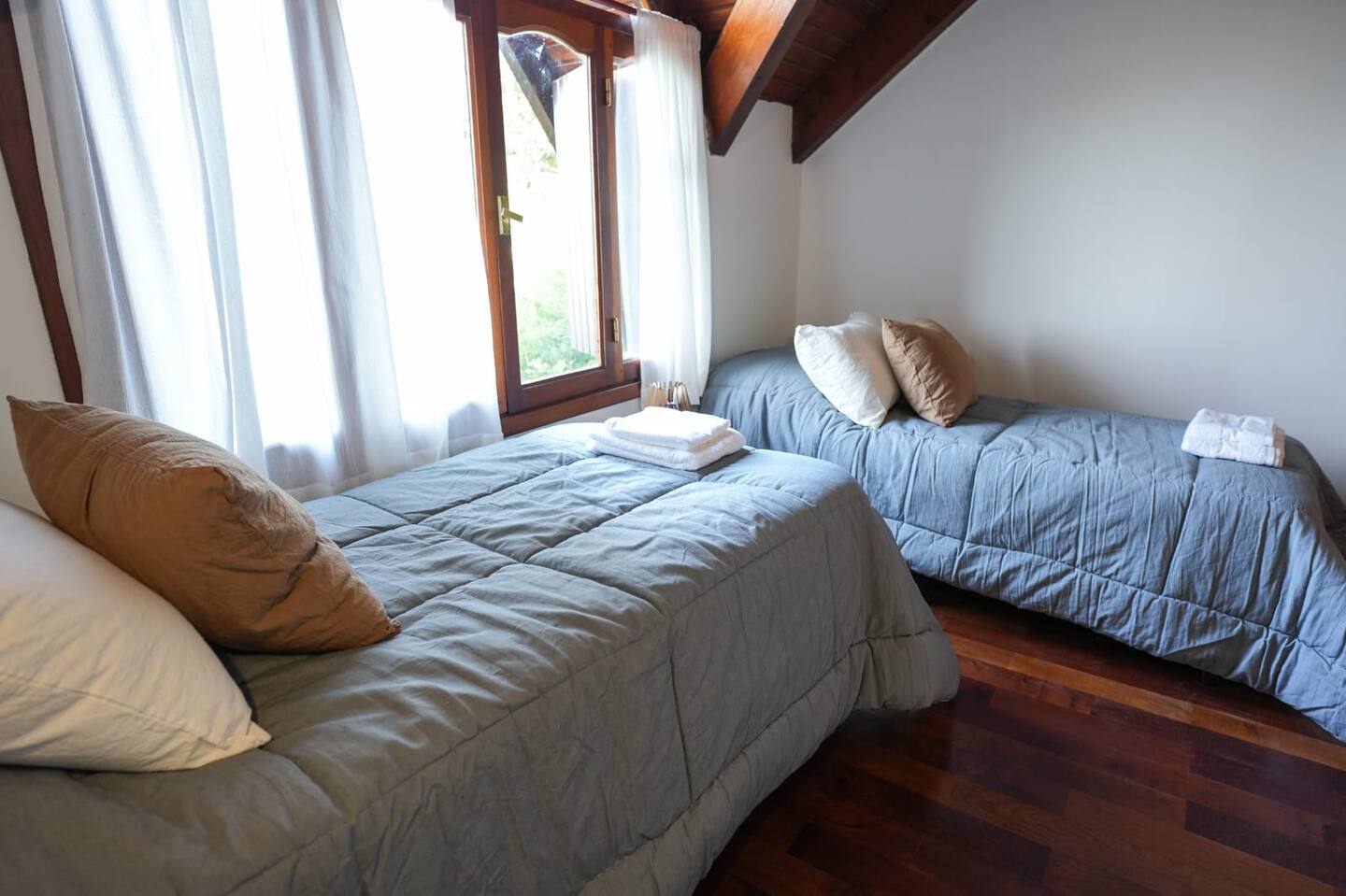 Tiene 5 habitaciones y 4 baños distribuidos de la siguiente manera: En Planta Baja hay una habitación con 2 camas singles, un baño, una habitación de servicio con cama single con carri cama y baño.