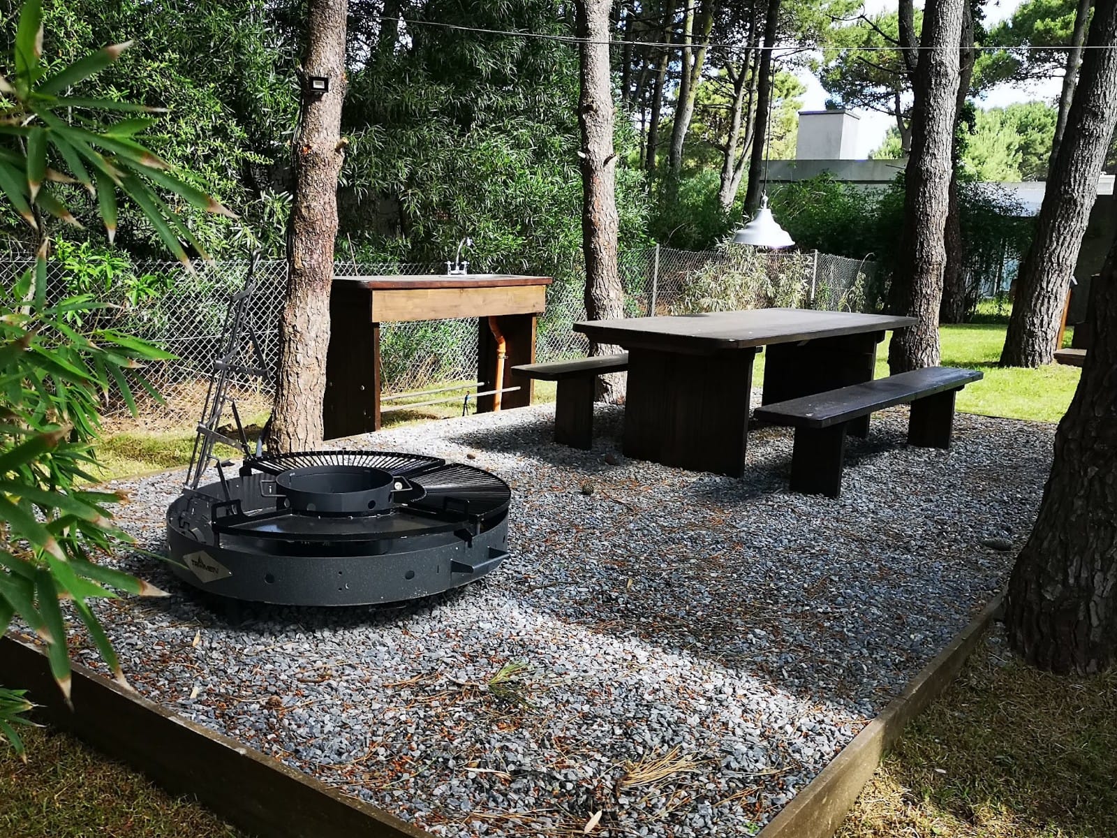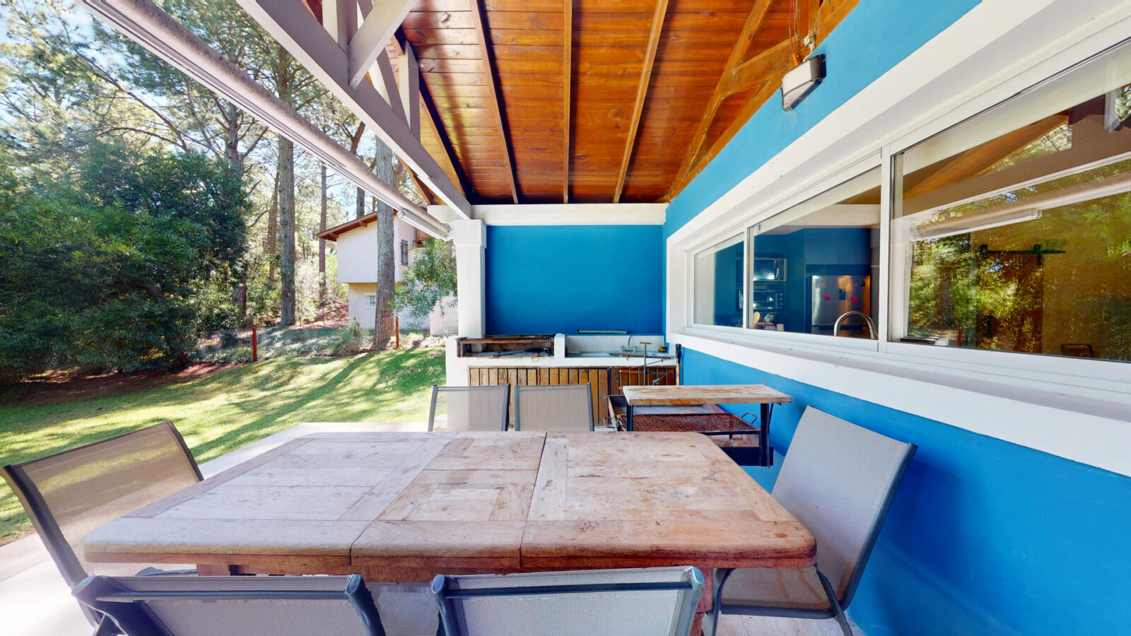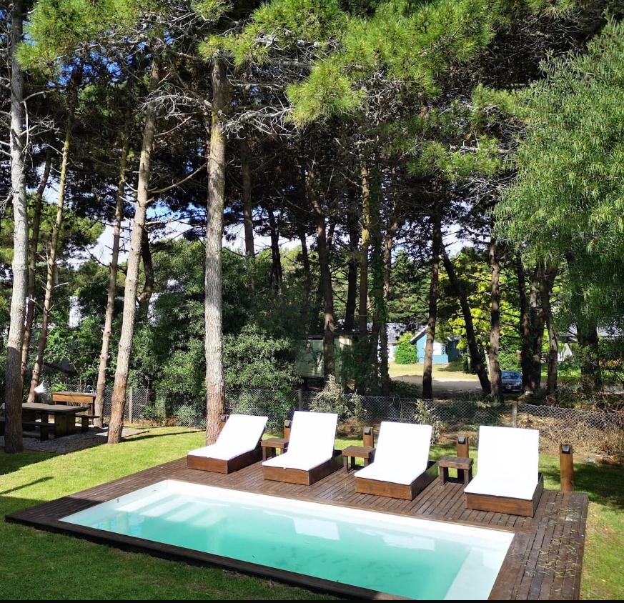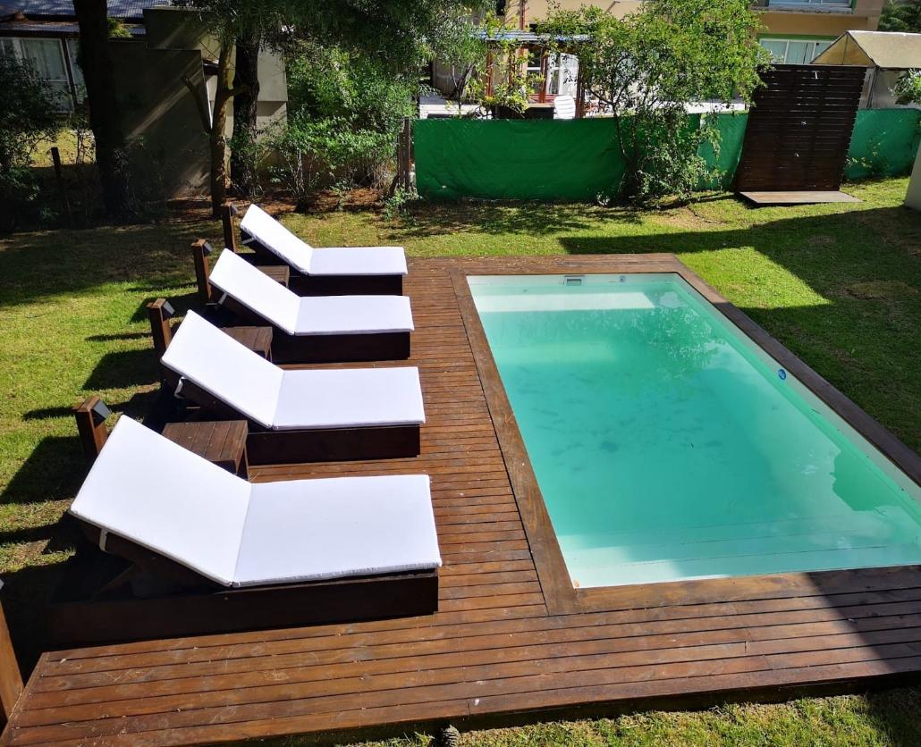 La casa cuenta con una pileta de 8 × 4 m climatizada más seis reposeras fijas de madera. También cuenta con un sector de asador con mesas y sillas, para 10 personas más con mesada, lavaplatos e iluminación para la noche.
