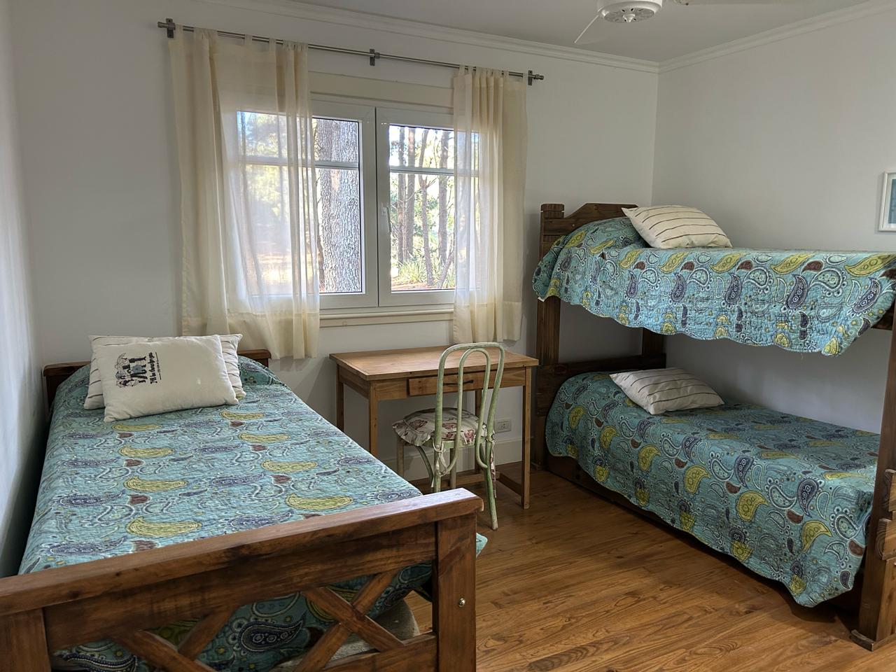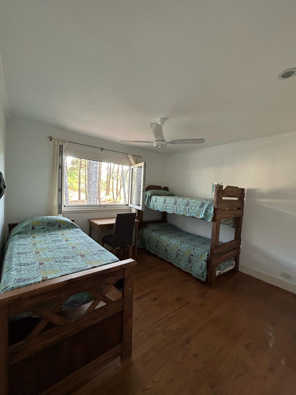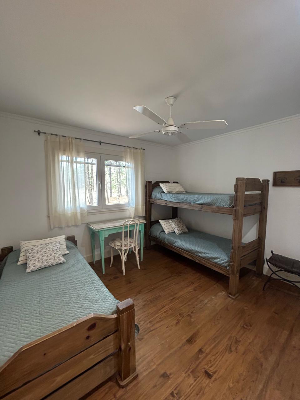 Dormitorio principal en suite con living privado. al lado hay un cuarto con dos camas con baño en frente, a continuacion otro dormitorio con dos camas y baño al lado, mas dos dormitorios que comparten baño. uno tiene una cucheta y una cama con carro abajo. y el otro dormitorio con otra cucheta con otra cama.