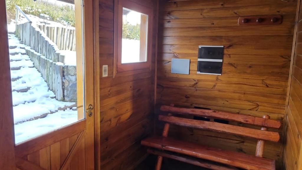 La cabaña cuenta con 4 dormitorios , principal en suite, 2 baños completos y toilette de recepción, living con hogar a leña y comedor, hall frío, cocina equipada (heladera con freezer, microondas,cafetera, tostadora y lavarropas). TV por DirecTV en el living. WiFi. Calefacción central por radiadores. Parrilla externa.