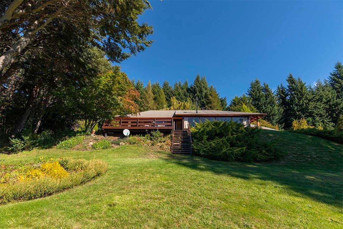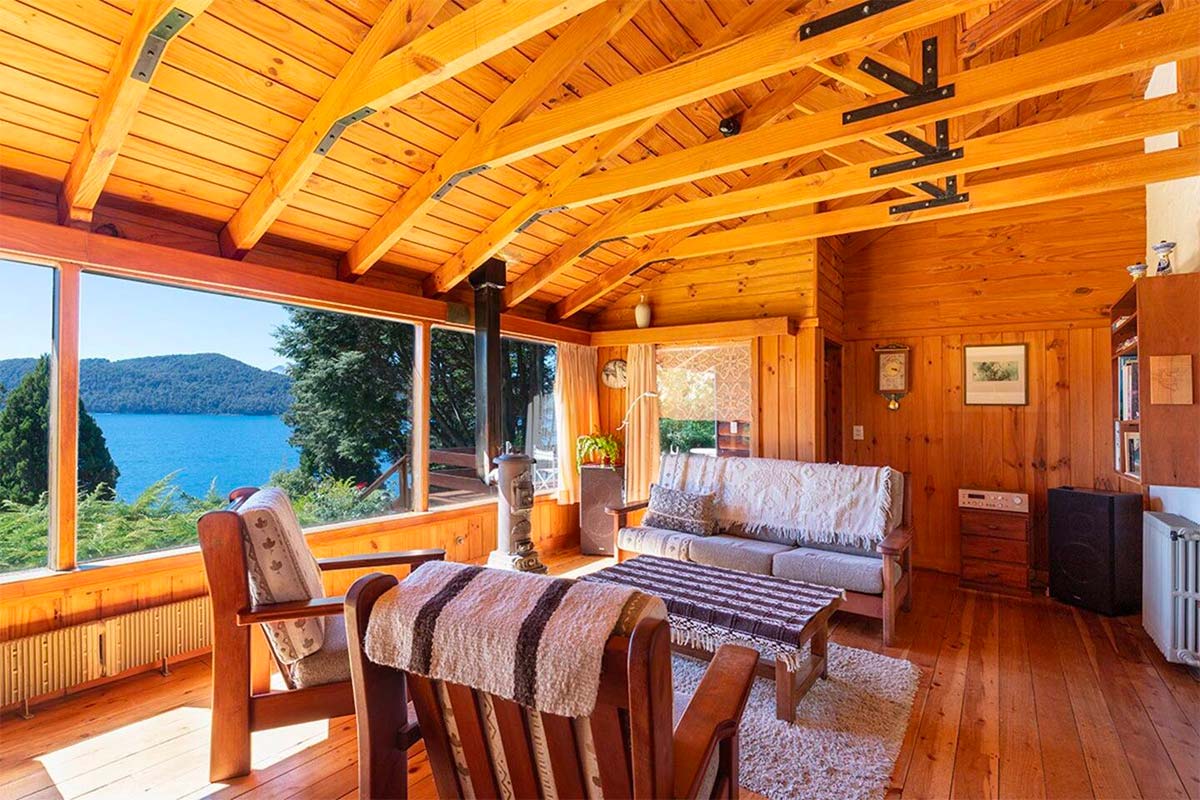La cabaña es totalmente de troncos, esta rodeada de extensos jardines cuidados amorosamente, se puede disfrutar del lago Nahuel Huapi, ya que el terreno llega hasta la costa misma, pasando por un encantador bosque.