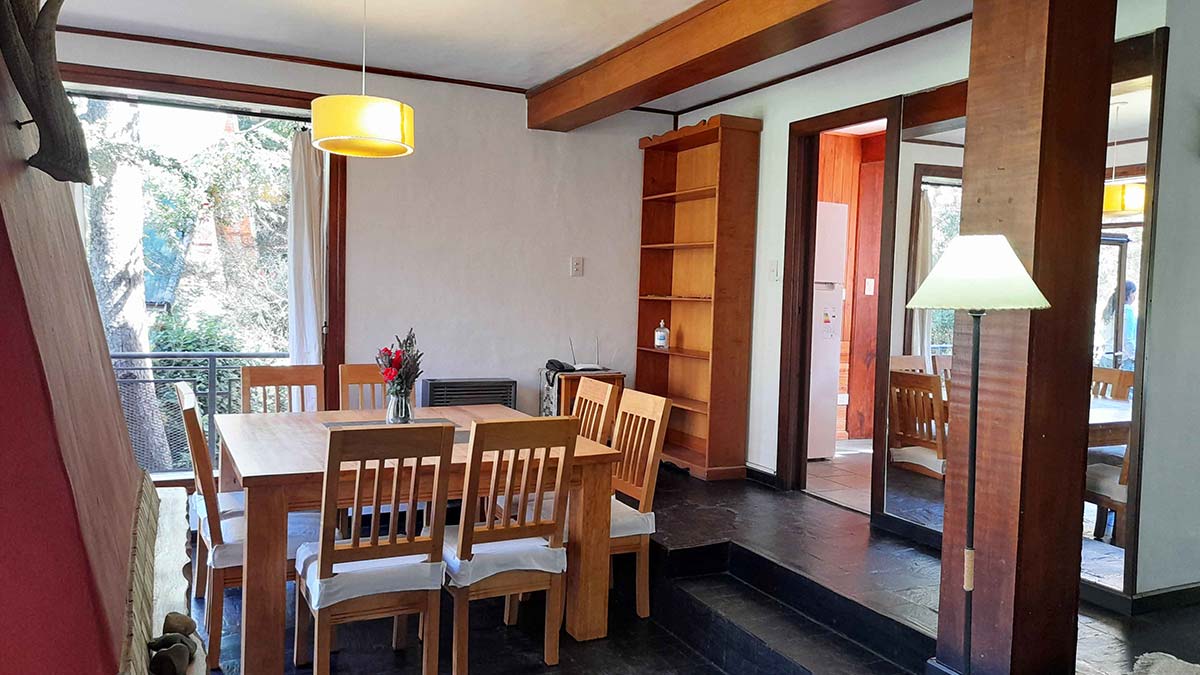 Planta media: Living en dos ambientes, uno con salamandra a leña y vista al bosque de robles y un living Comedor con hogar a leña (rincón de lectura, TV, juegos de mesa). Y deck de roble hacia el parque.