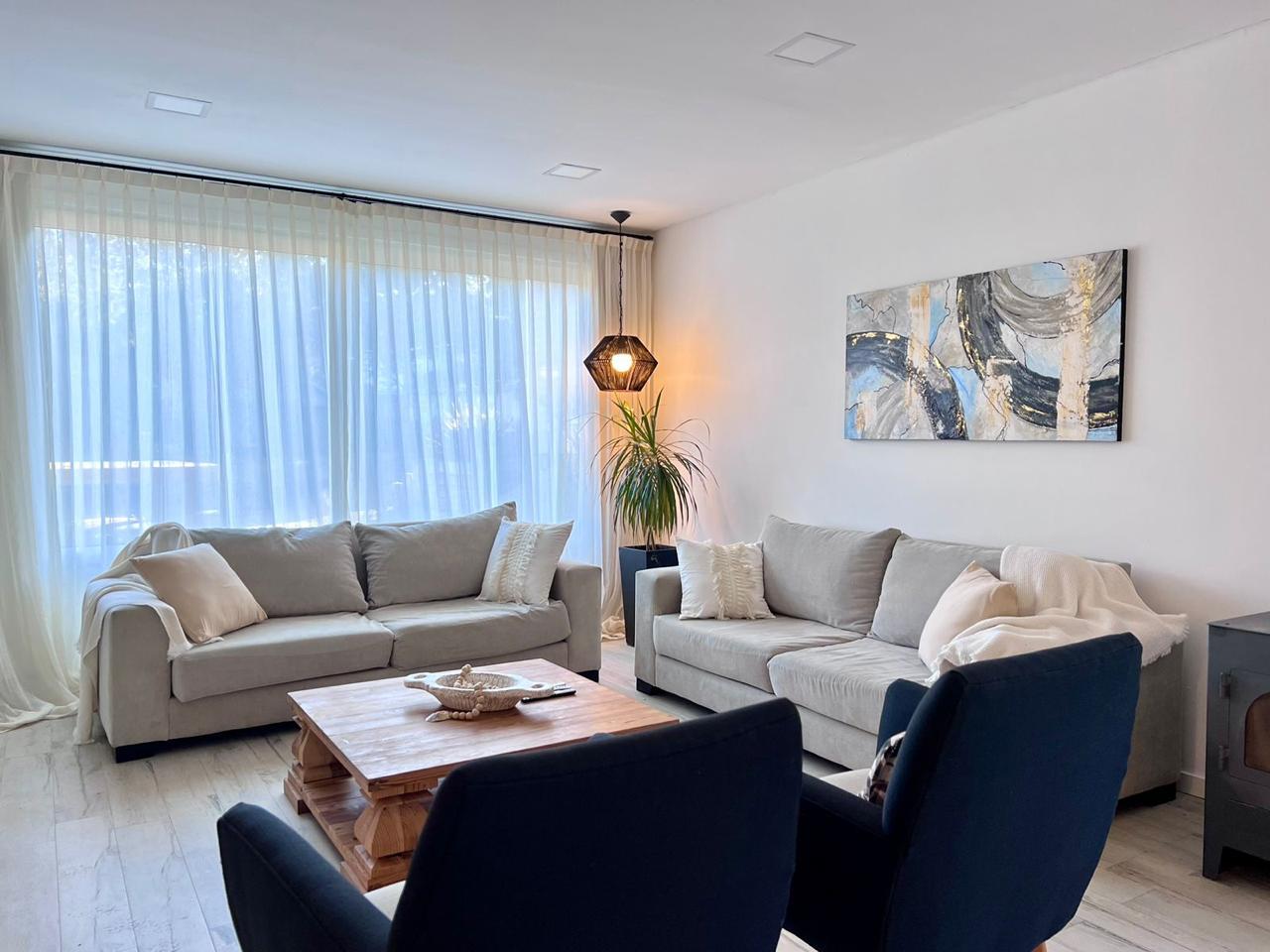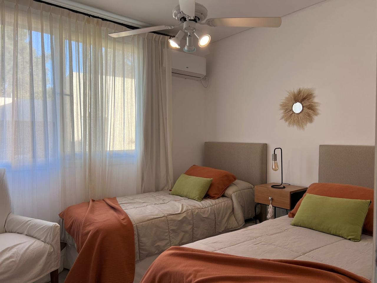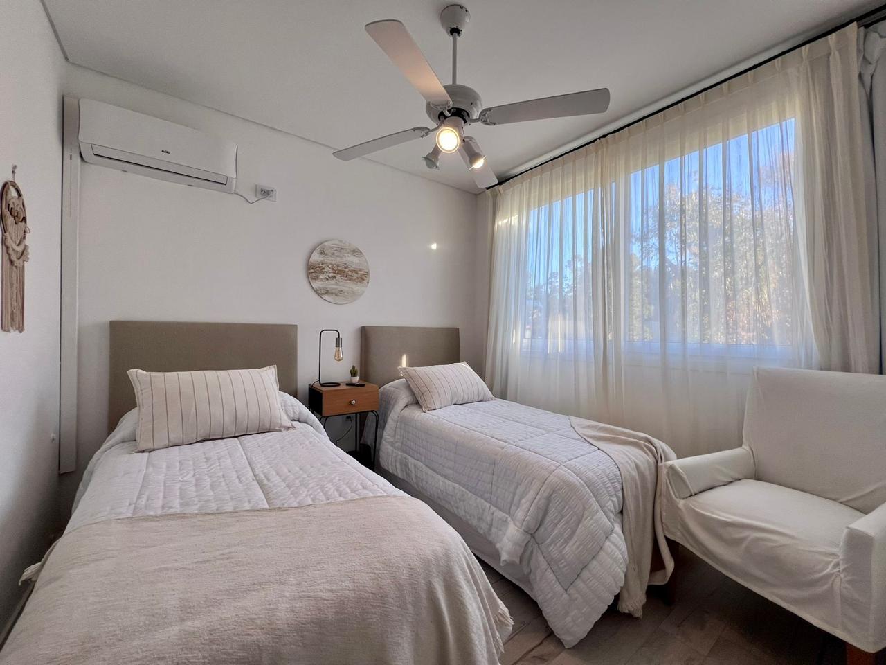 3 dormitorios, 2 banos completos y un toileet, incluye sabanas y toallas. Gran galeria con vista al parque y pileta.