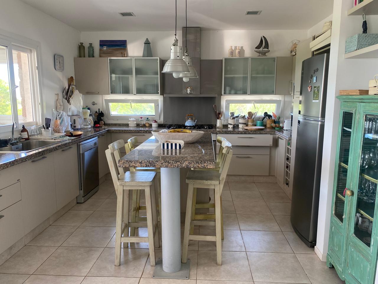 Cocina super completa con puertas corredizas, comoda isla con banquetas y salida a la galeria.