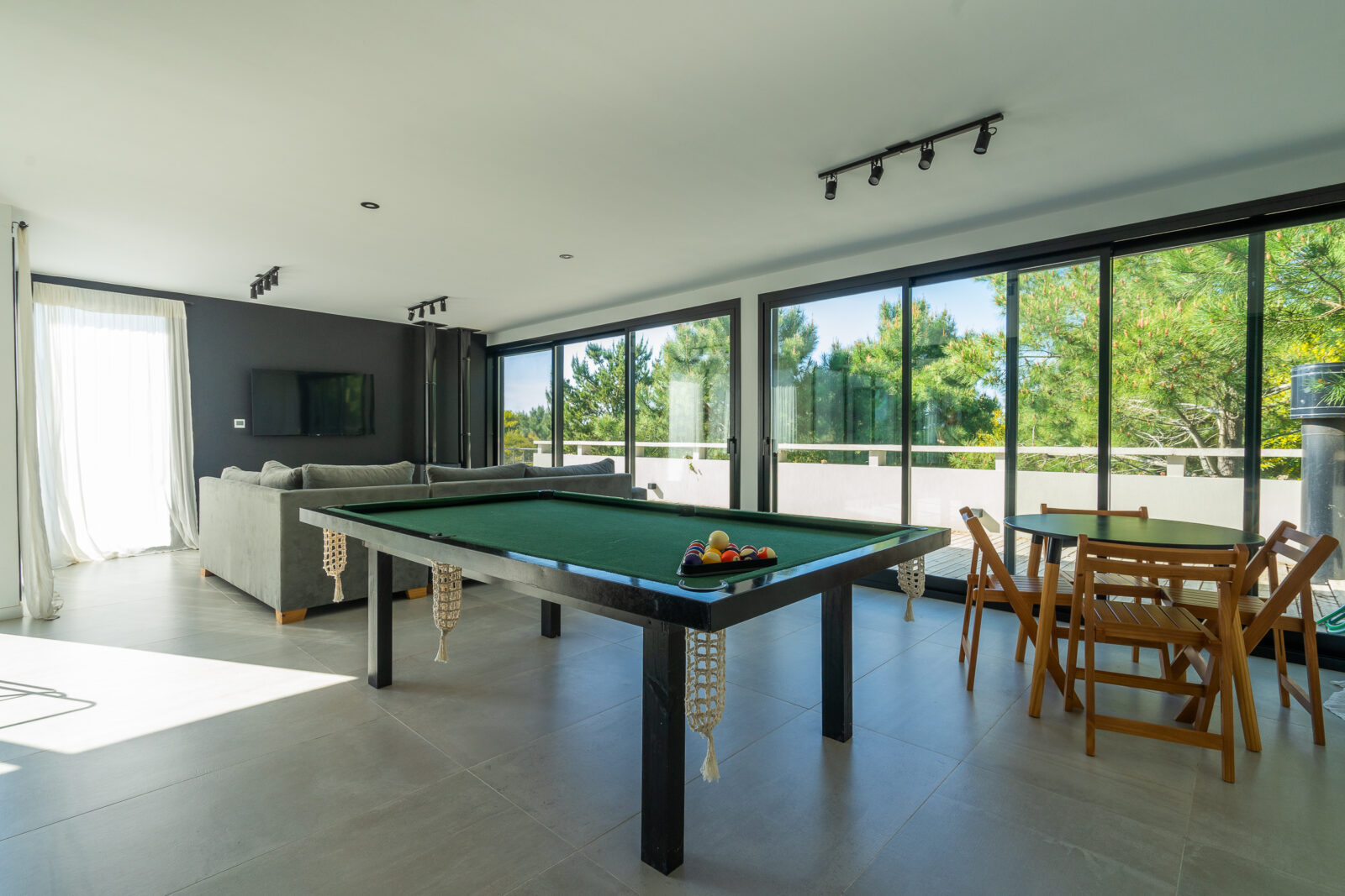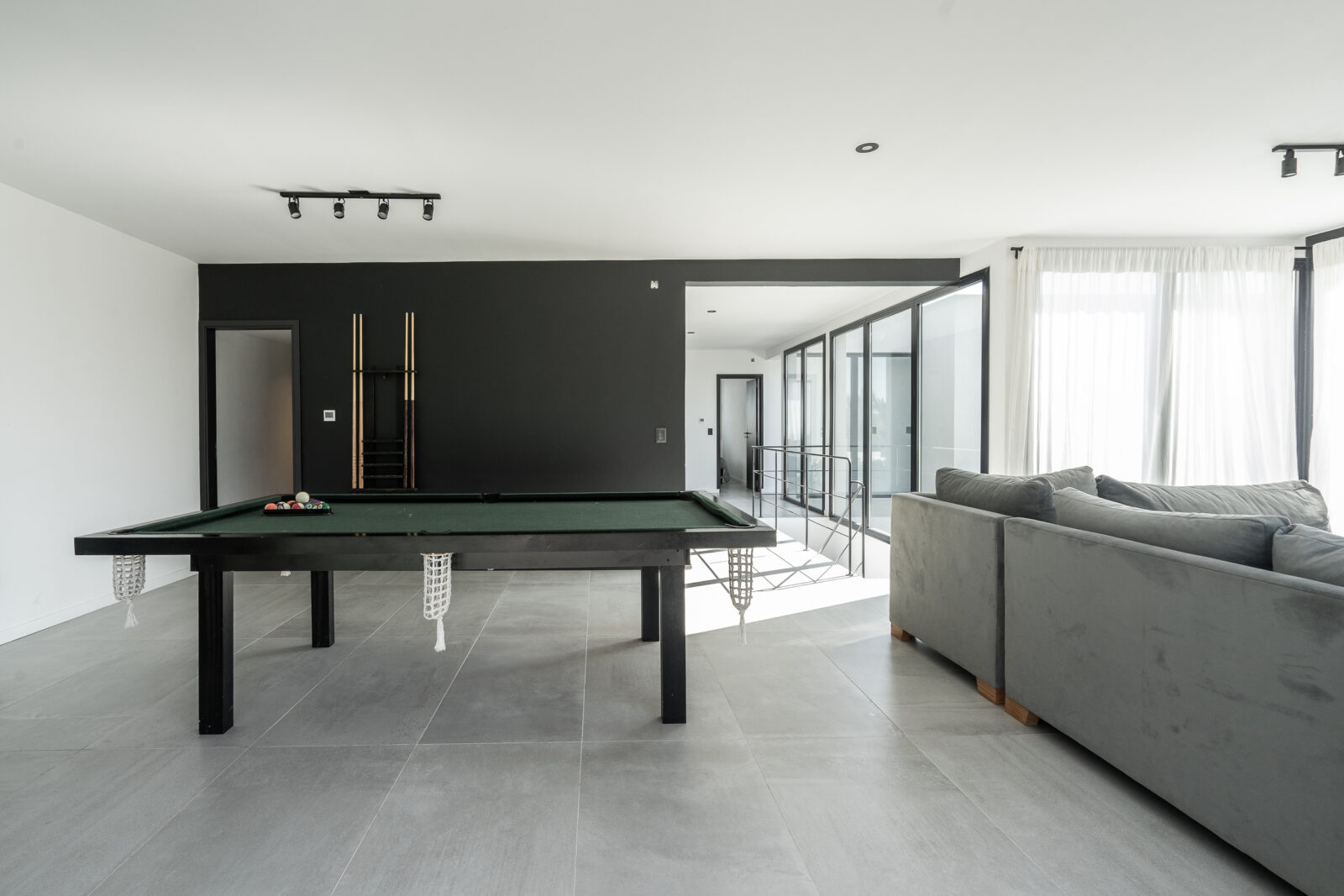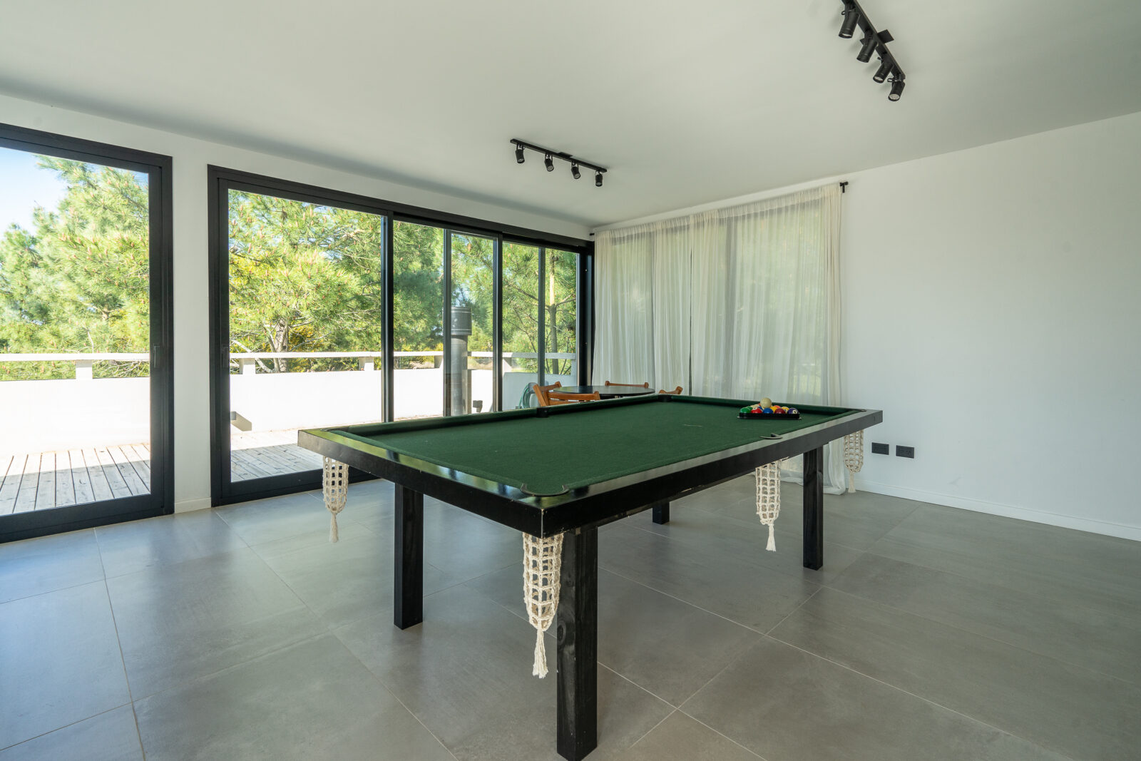 Playroom con mesa de pool, sector de televisión con sillón esquinero, mesa para juegos de mesa