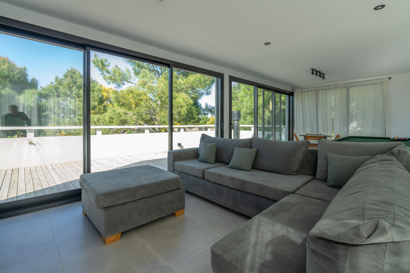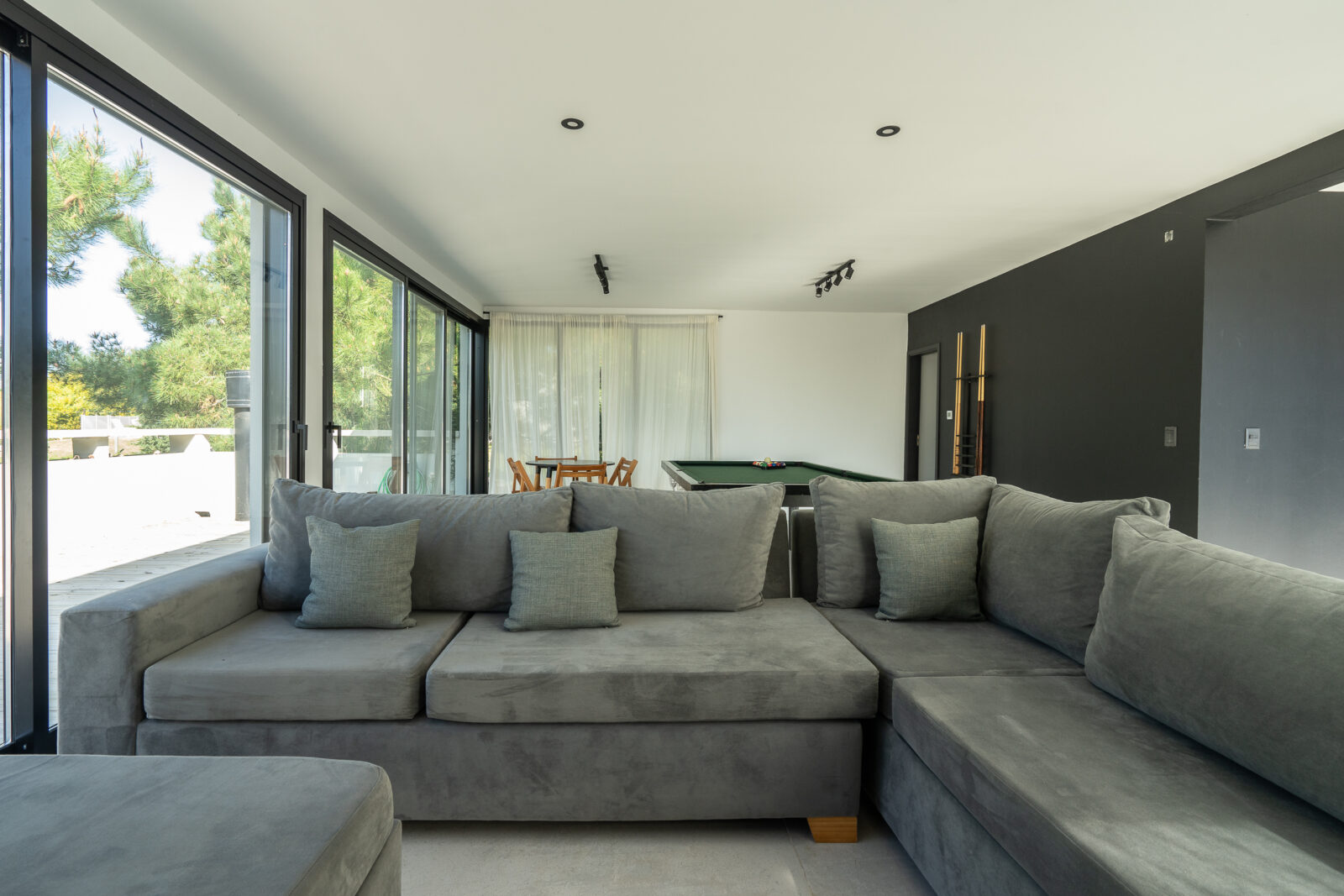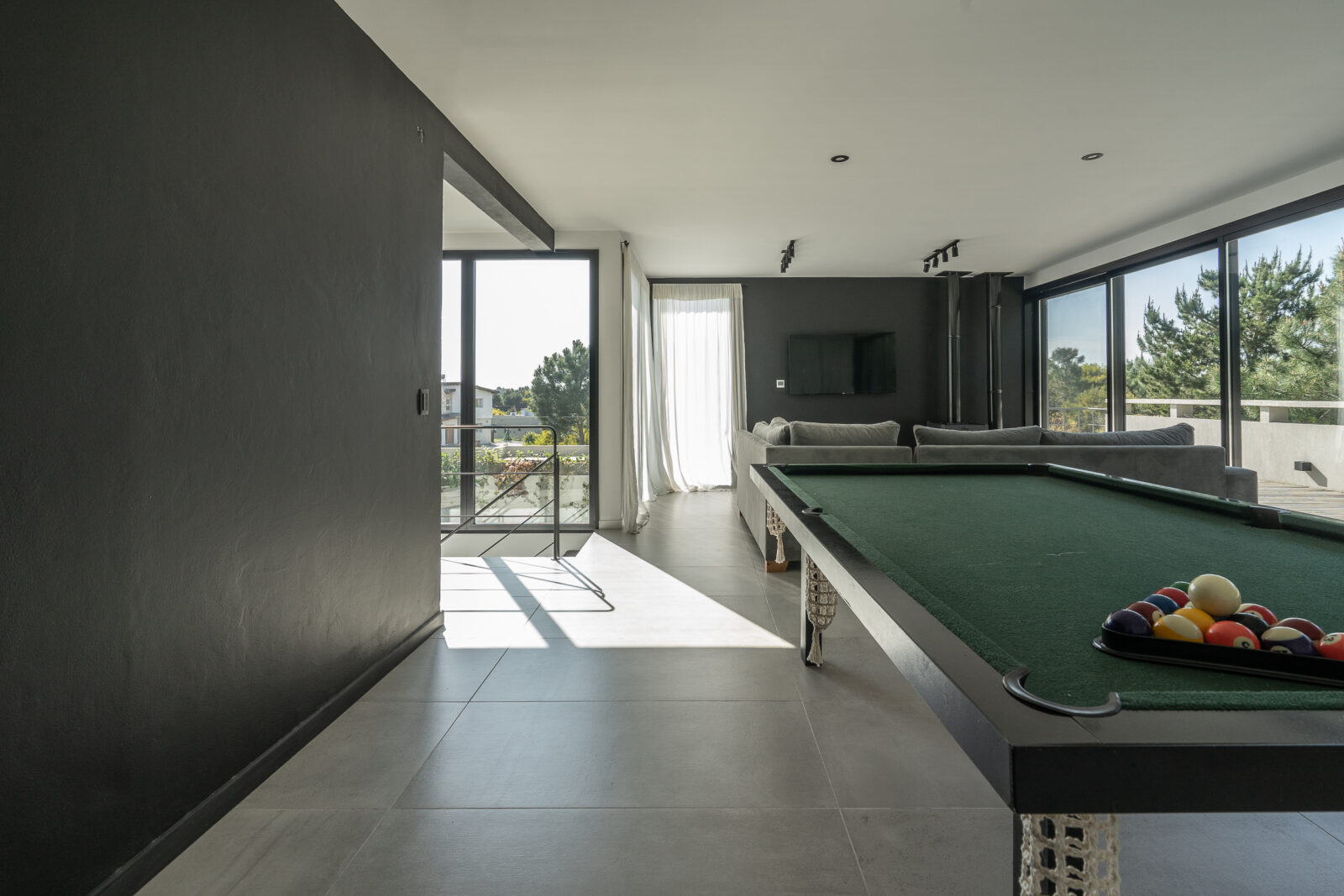 Playroom con mesa de pool, sector de televisión con sillón esquinero, mesa para juegos de mesa