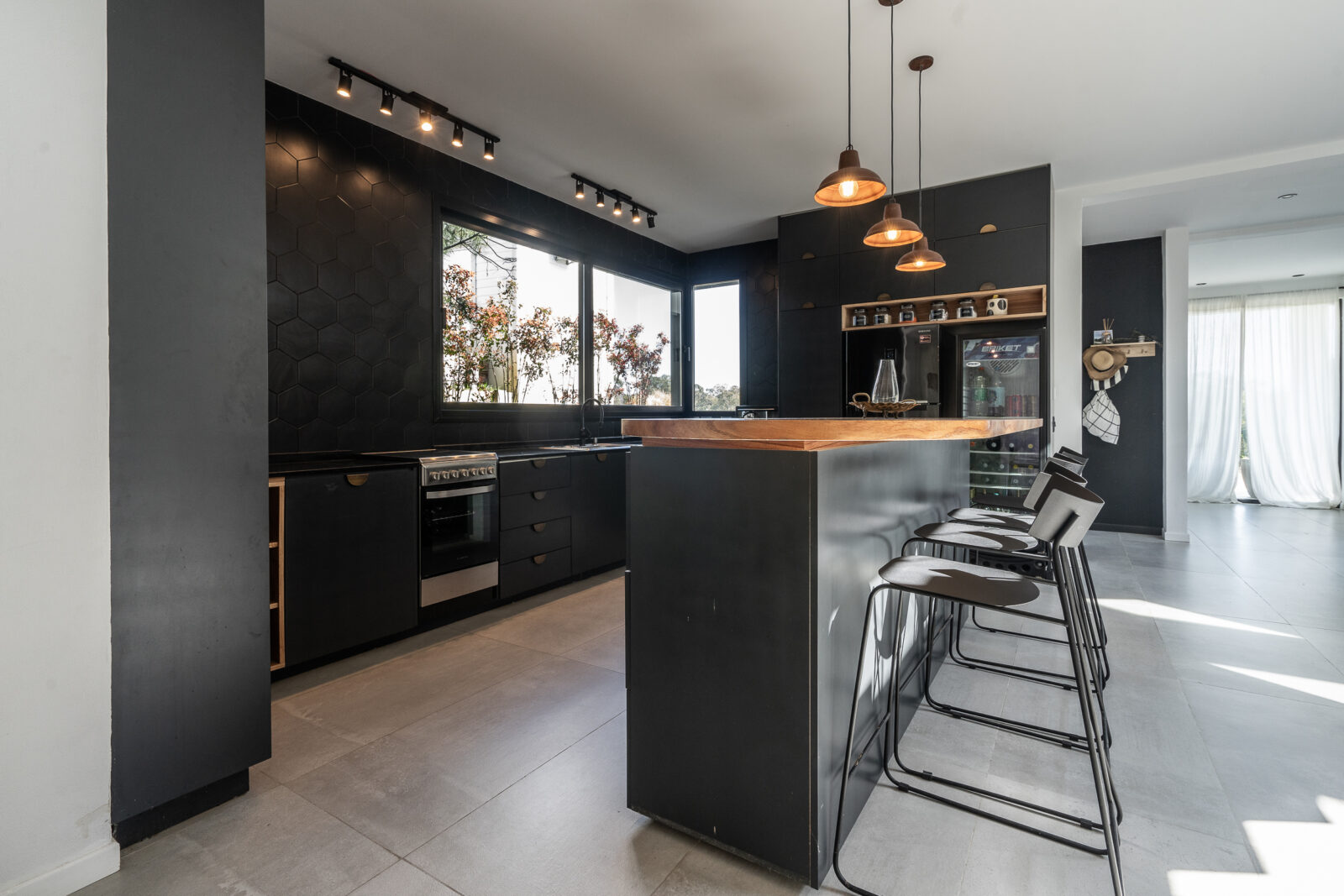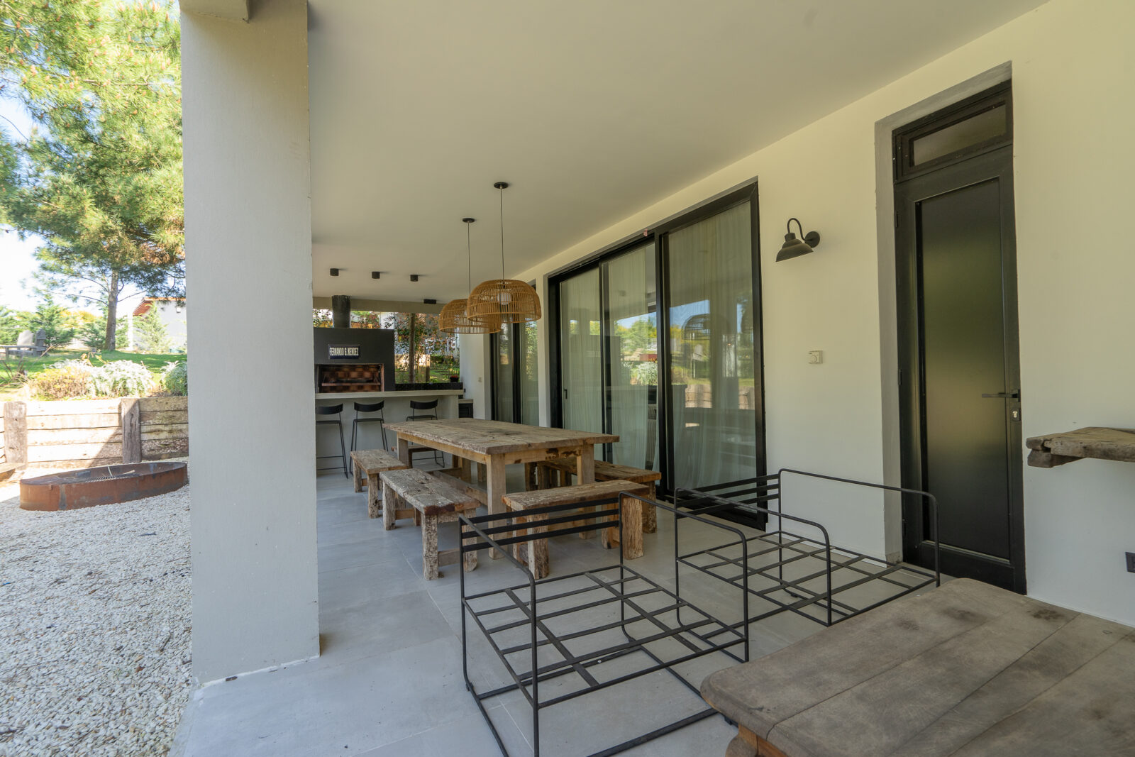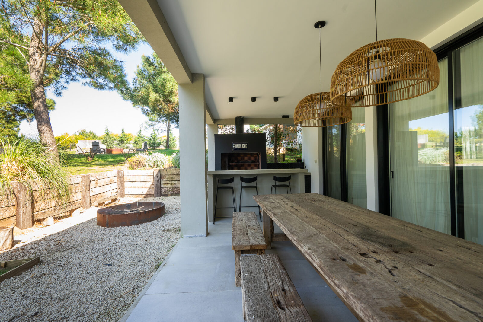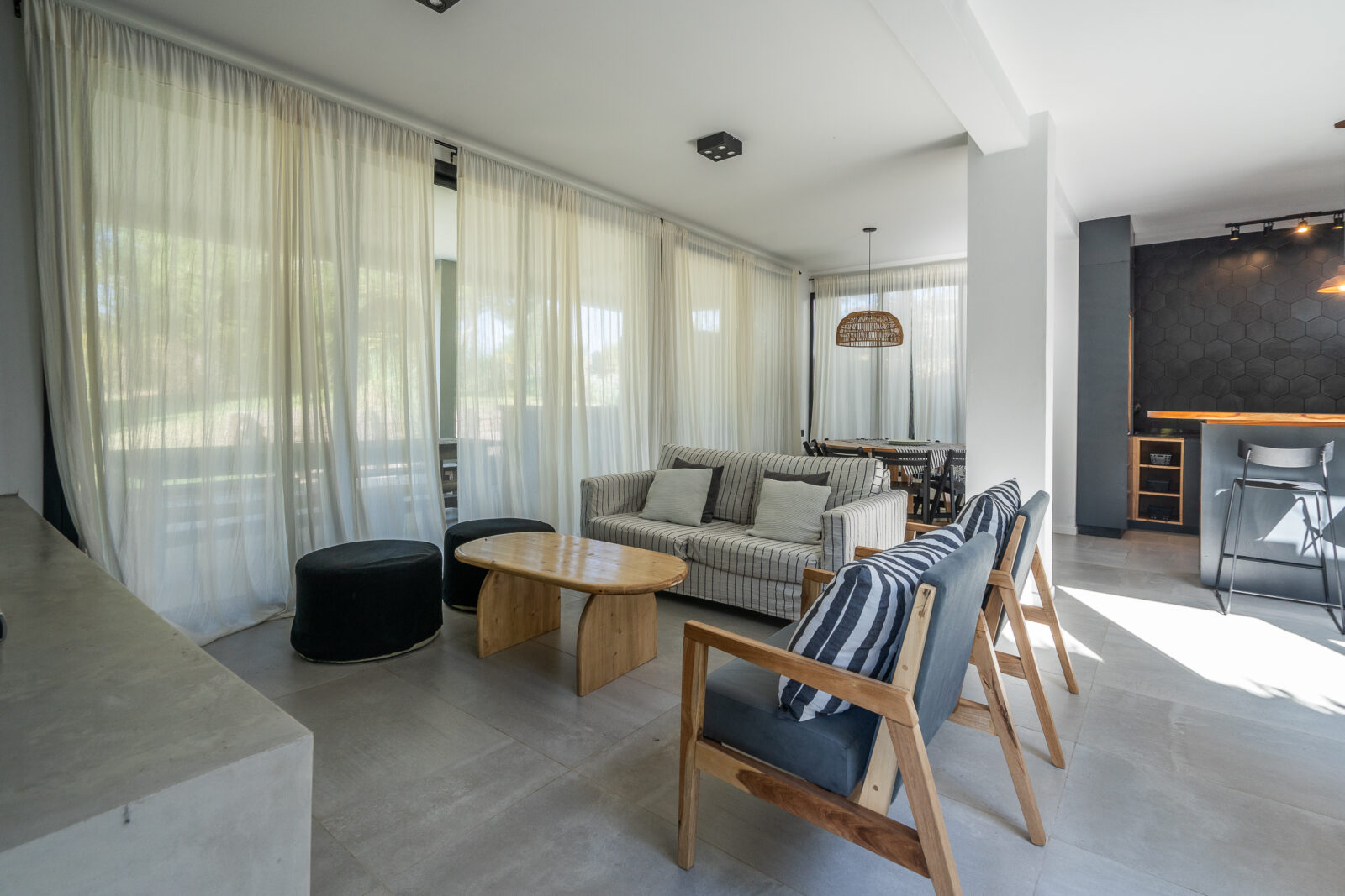Amplia galeria con parrilla, isla con taburetes , mesa de 3,00 x 1,00, sector de sillones