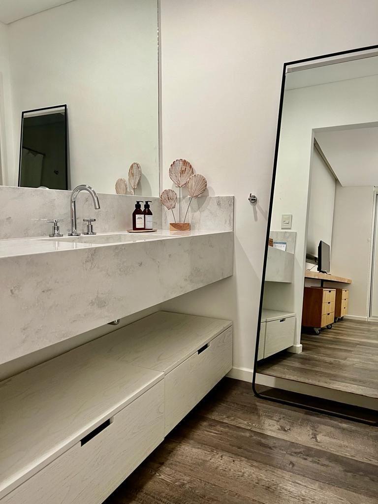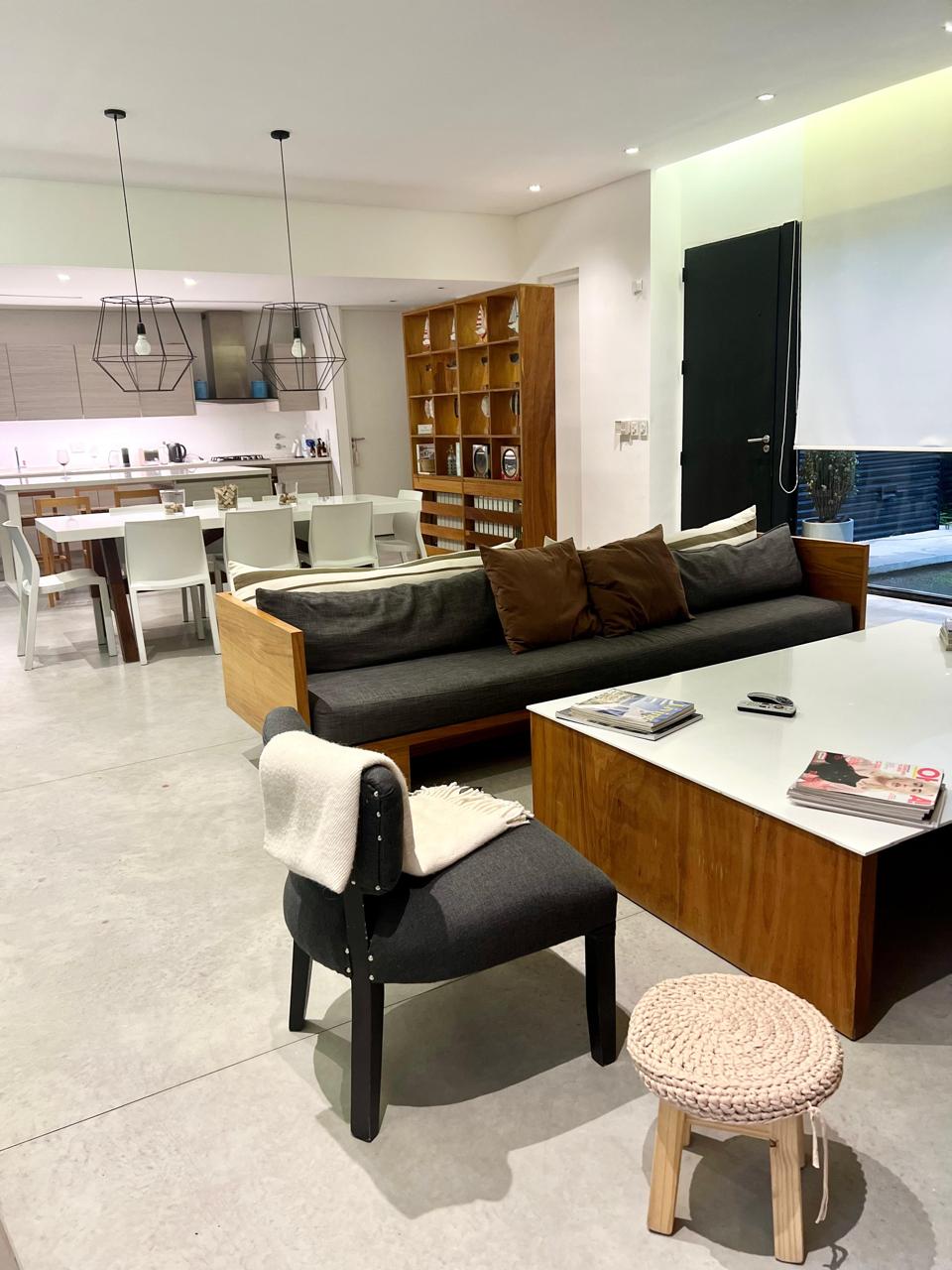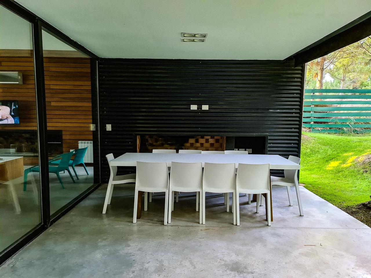 Galería con parrilla y fogonero , mesa para 12 con sillas y barra con bancos.