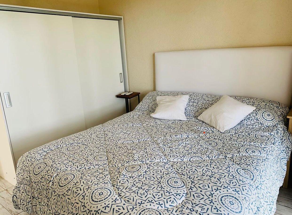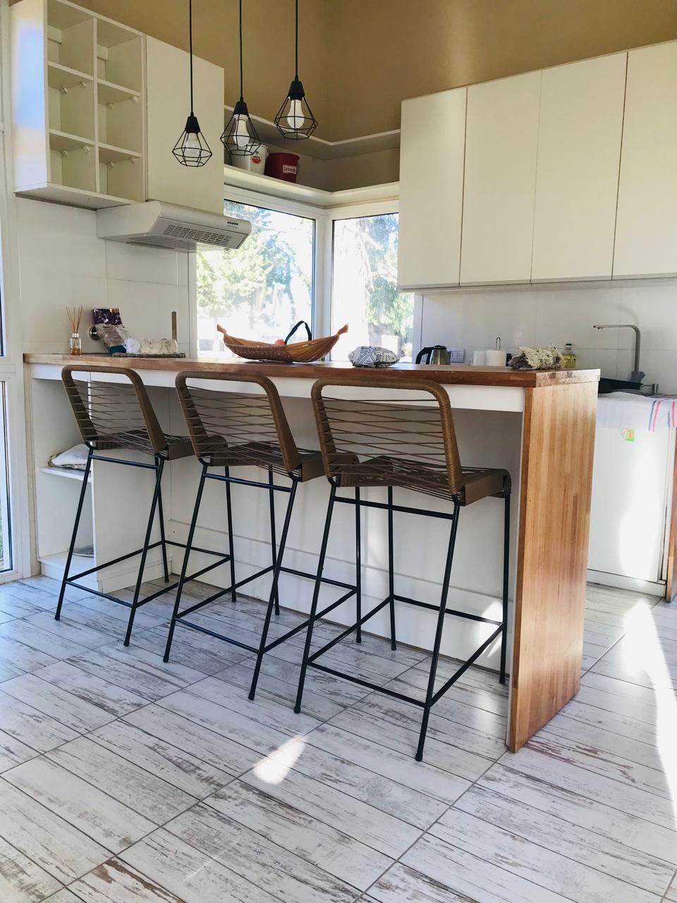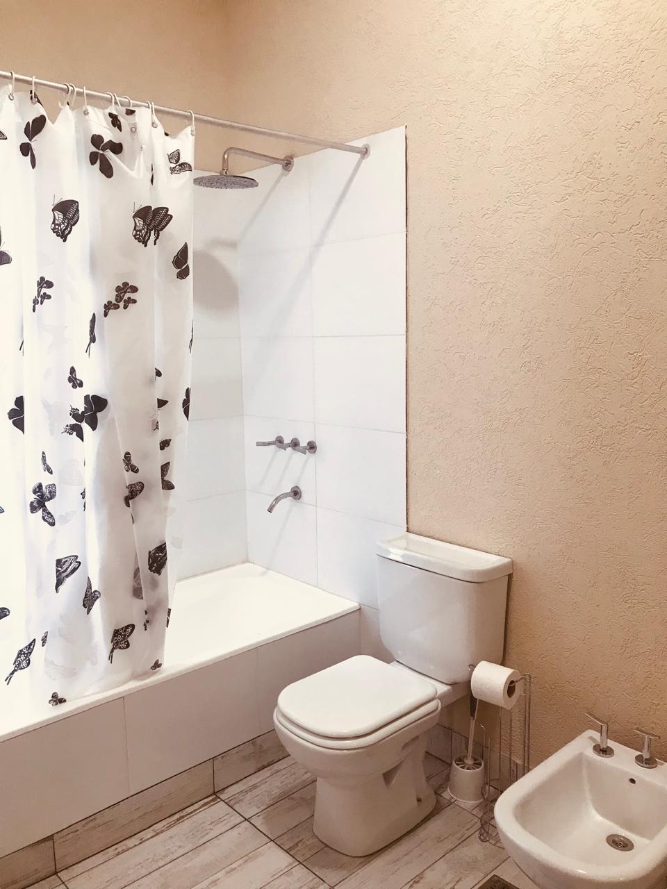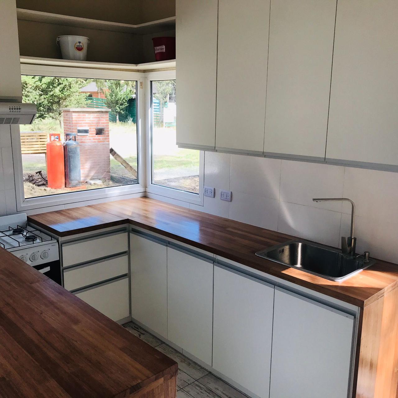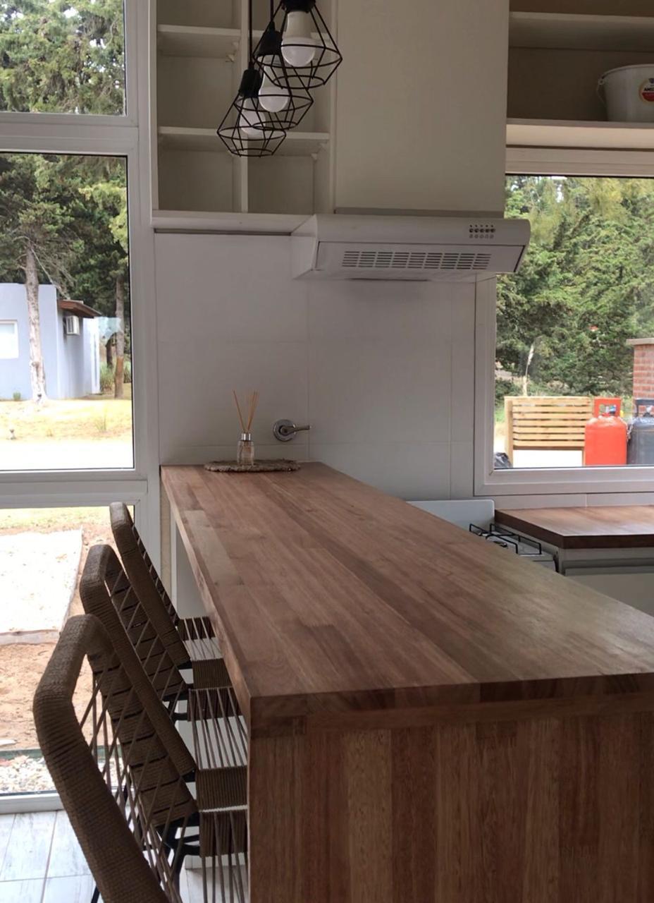 Cocina a gas, equipada con cafetera, tostadora, multiprocesadora, pava eléctrica microondas, heladera con freezer.