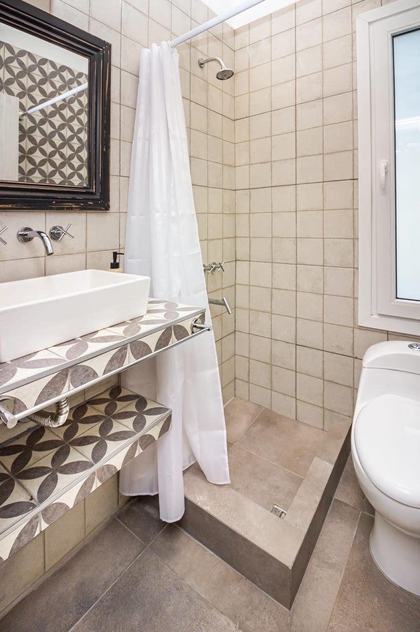 Junto a la entrada se encuentra un recibidor que da al toilette con ducha y a una habitación de servicio que cuenta con ventilador de techo.
