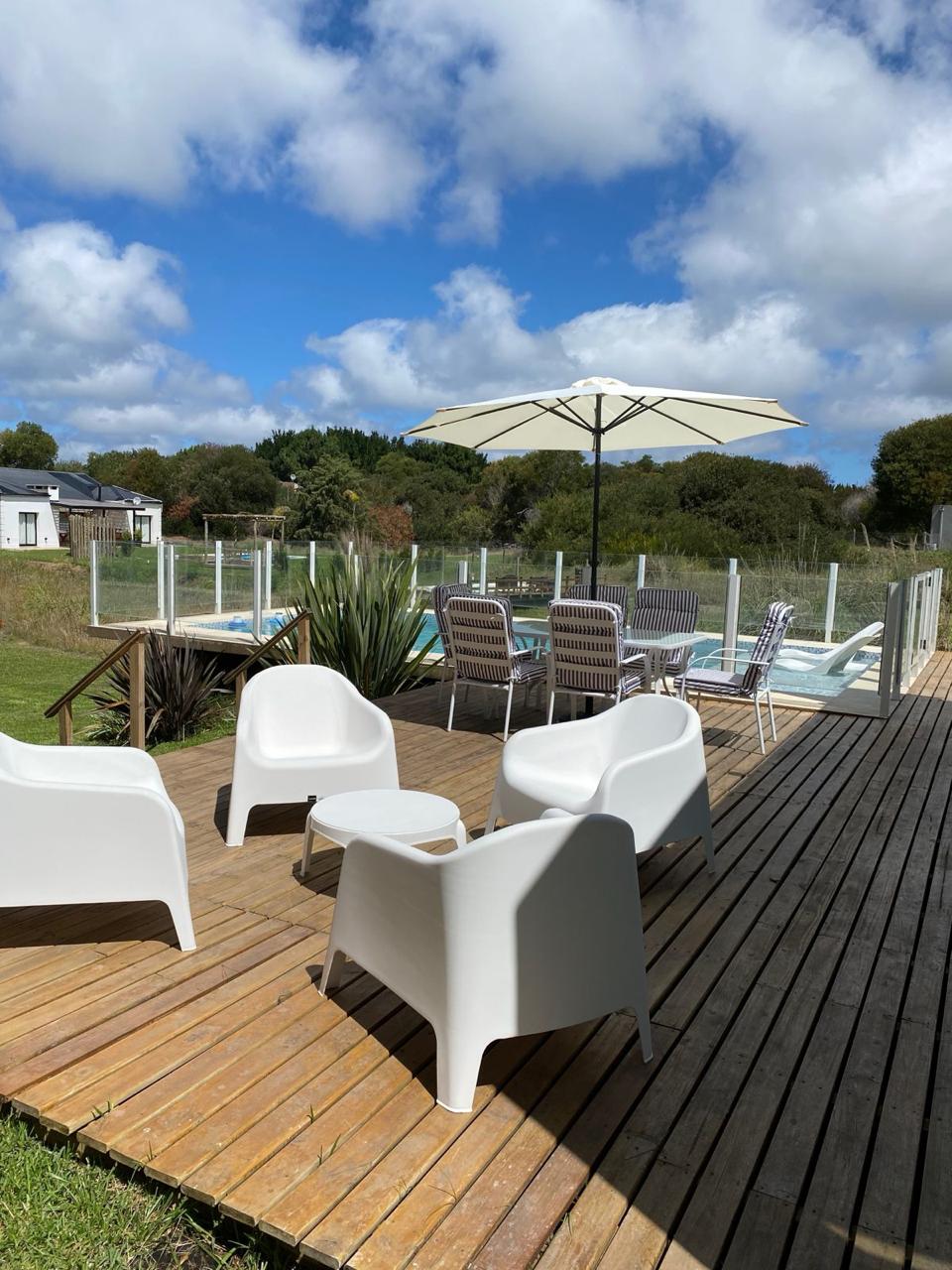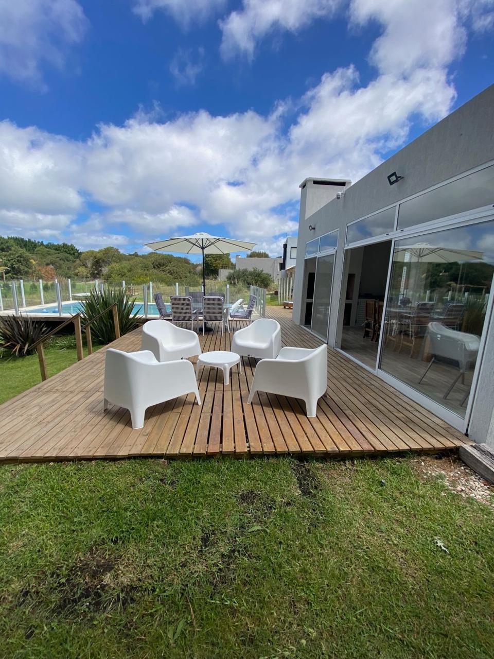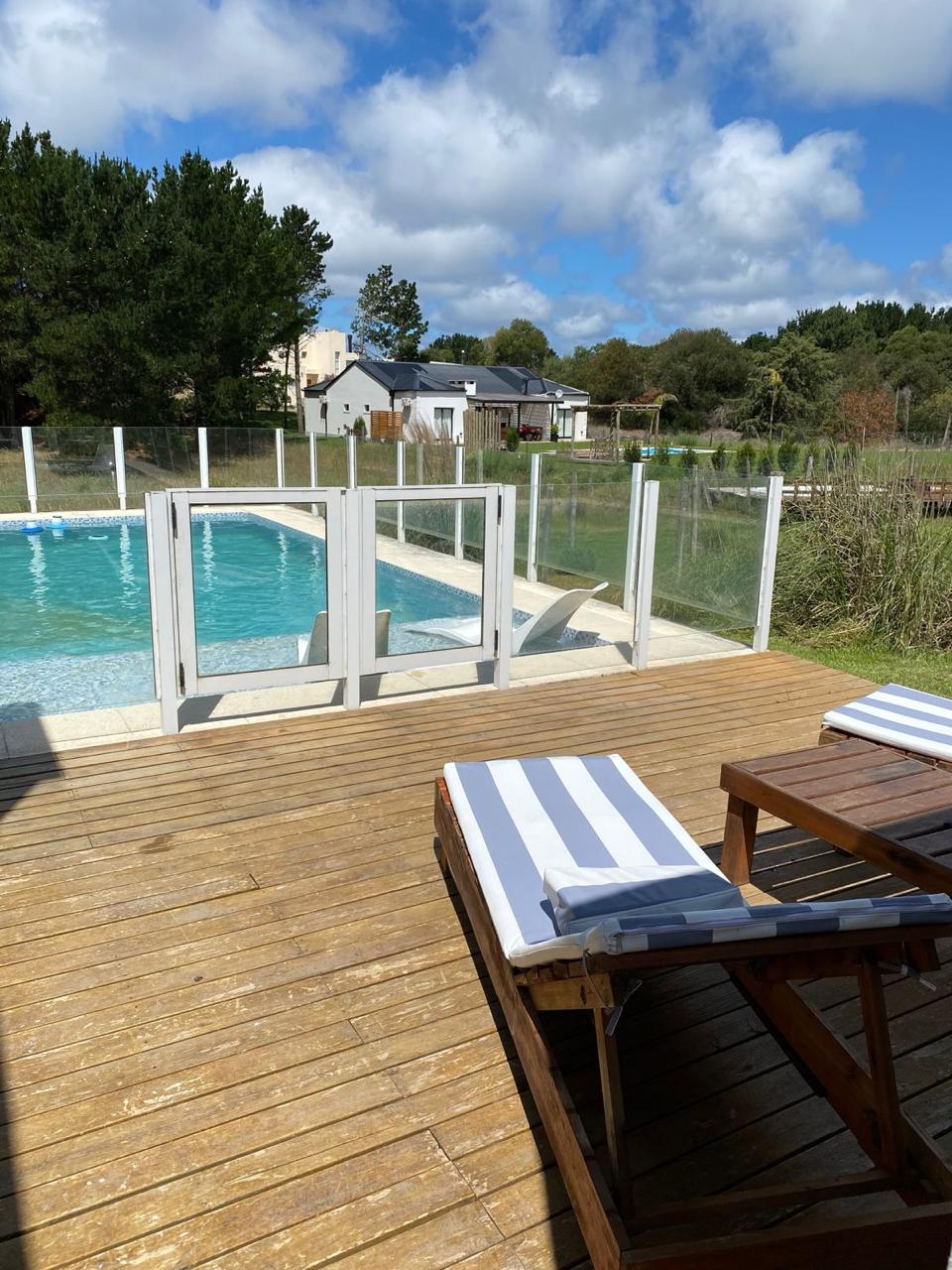 Pileta cercada con playa húmeda y deck de madera exterior con reposeras, mesa con sombrilla y 6 sillas y 4 sillones con mesa ratona.