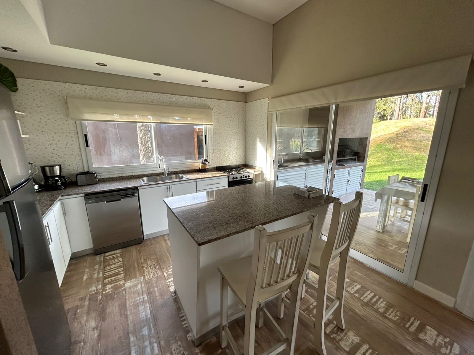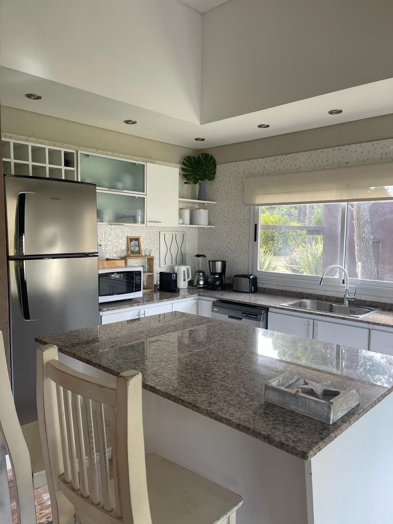 Cocina con isla totalmente equipada: heladera con freezer, horno a gas, microondas, lavavajillas, tostadora, licuadora, cafetera de filtro y Nespresso, pava eléctrica.