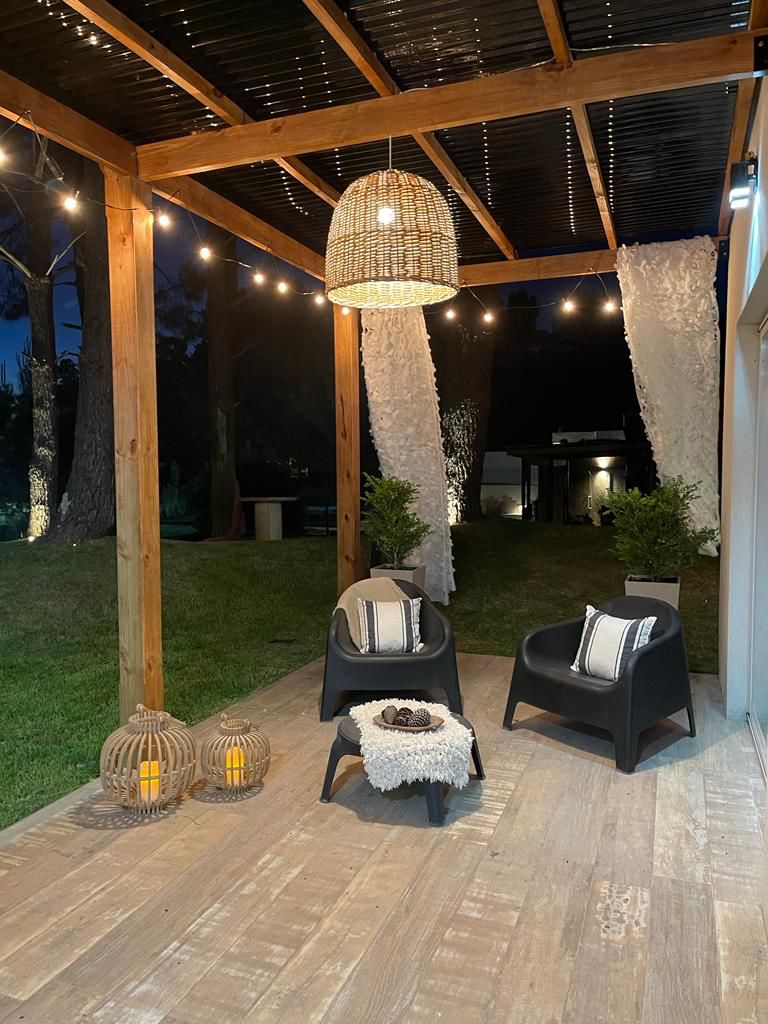 Galería con parrilla y mesa más living exterior con pérgola.