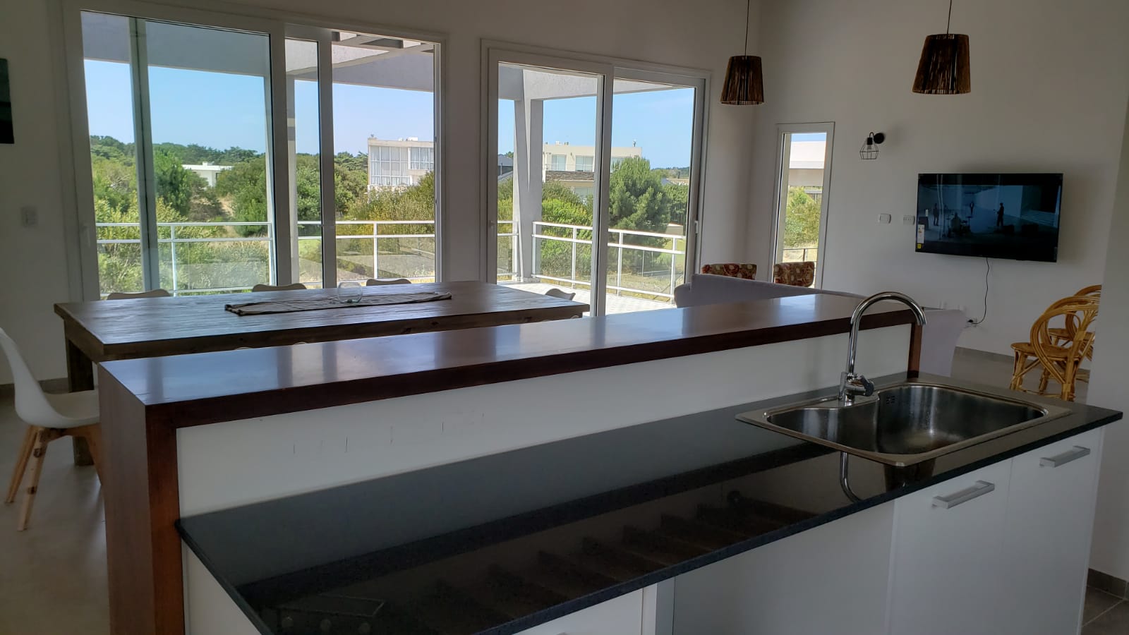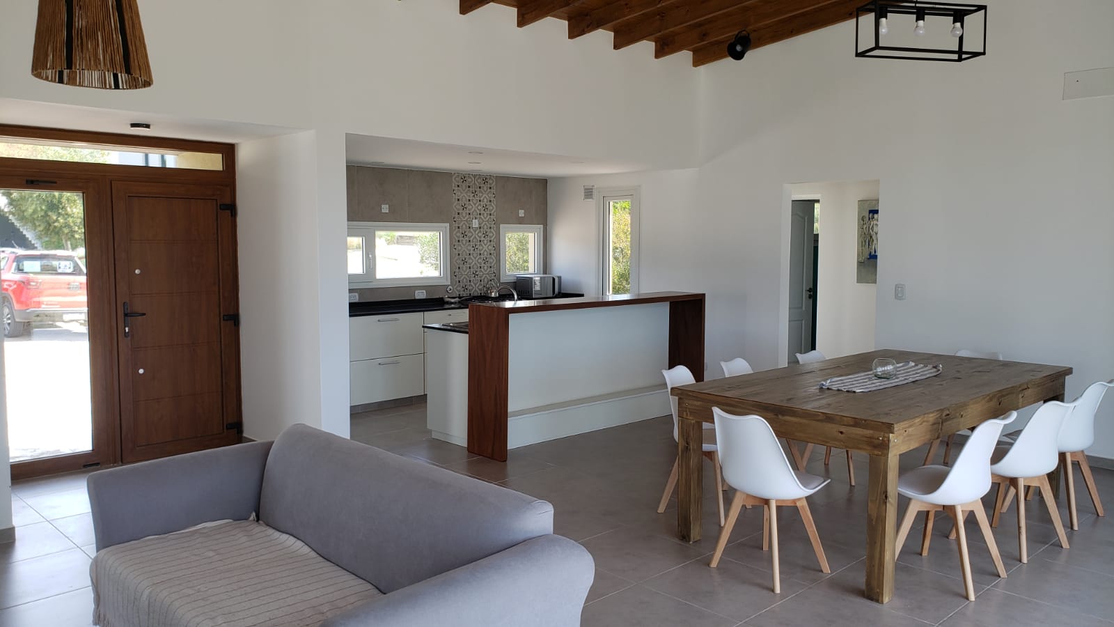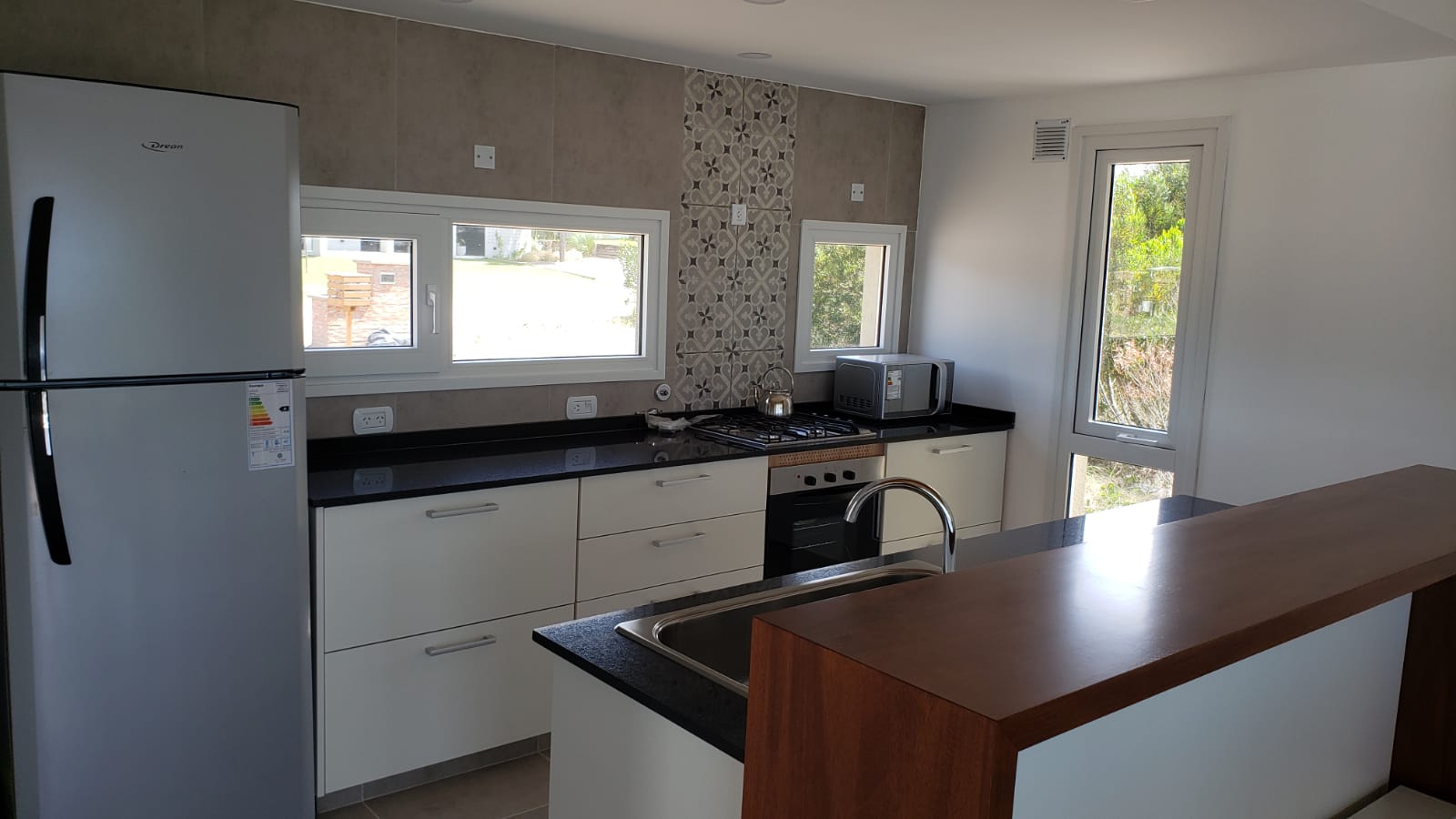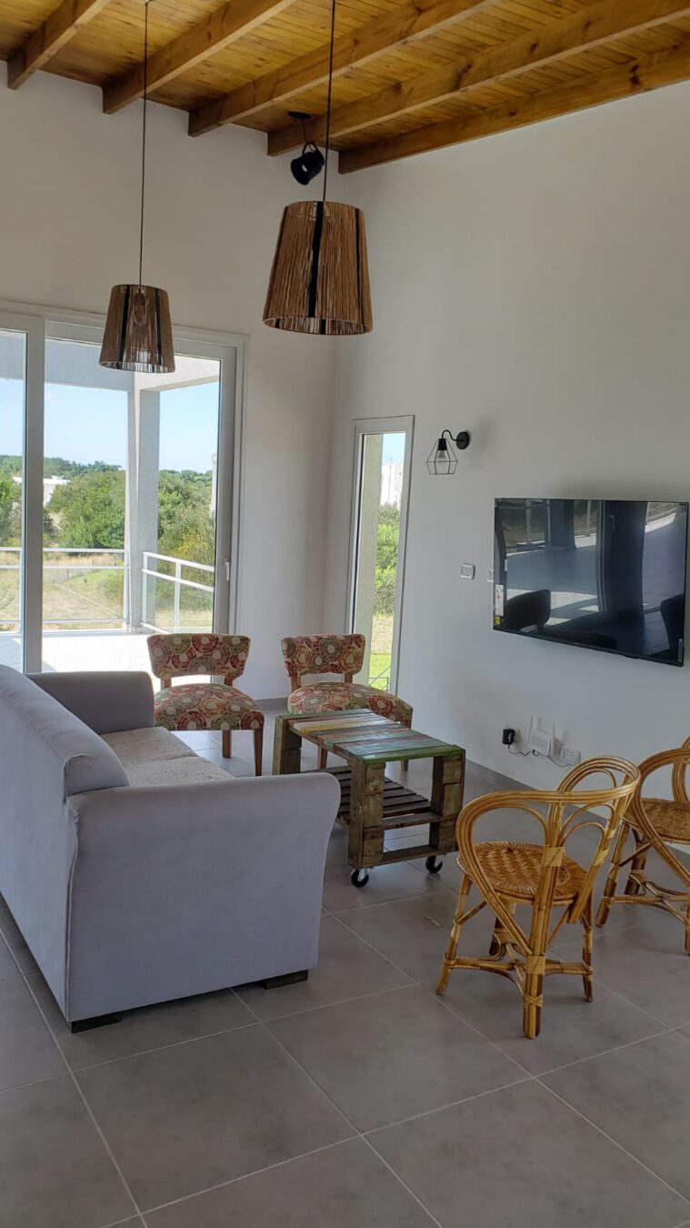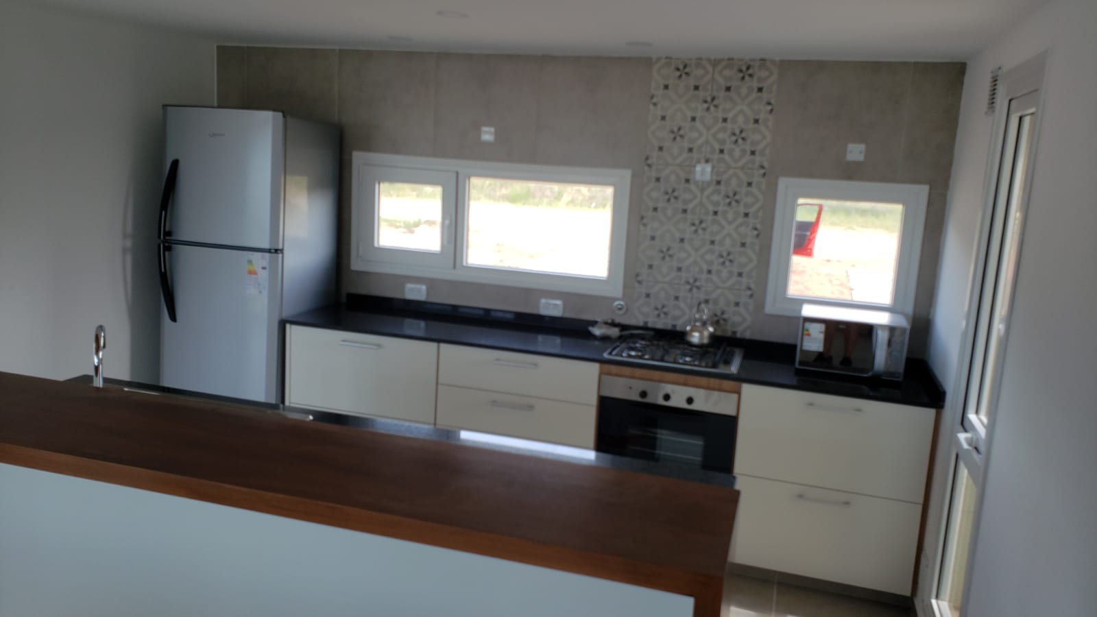 Living comedor con cocina integrada, barra desayunadora incluida. Galería con parrilla. Smart TV de 55”.