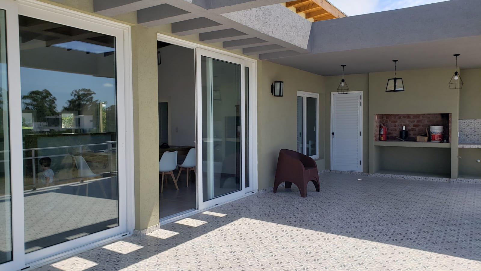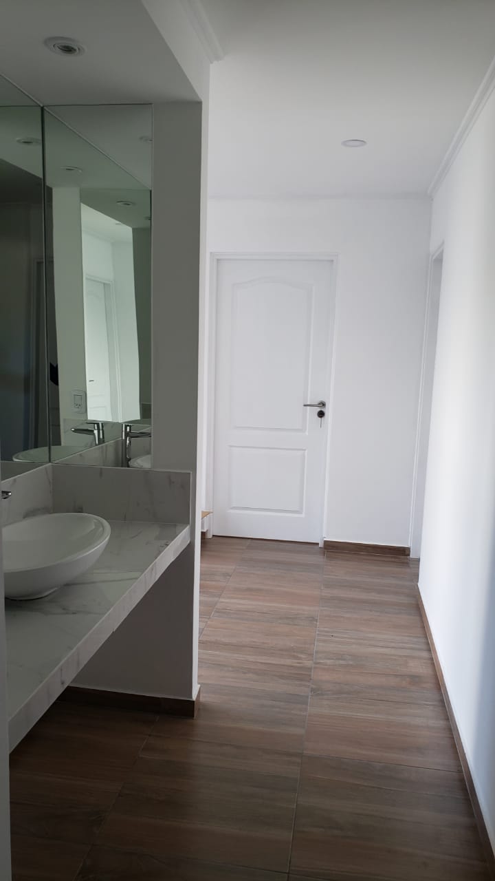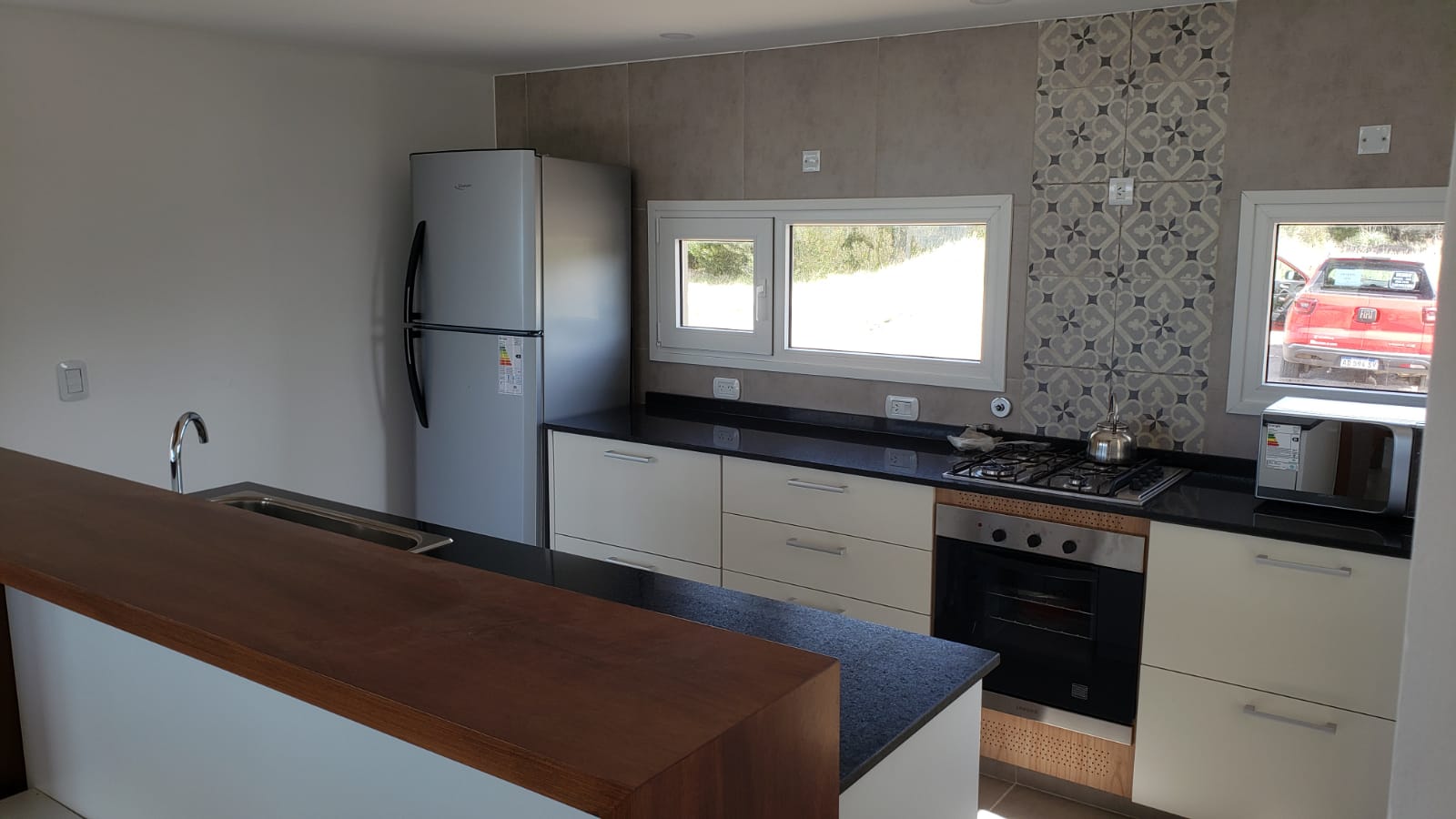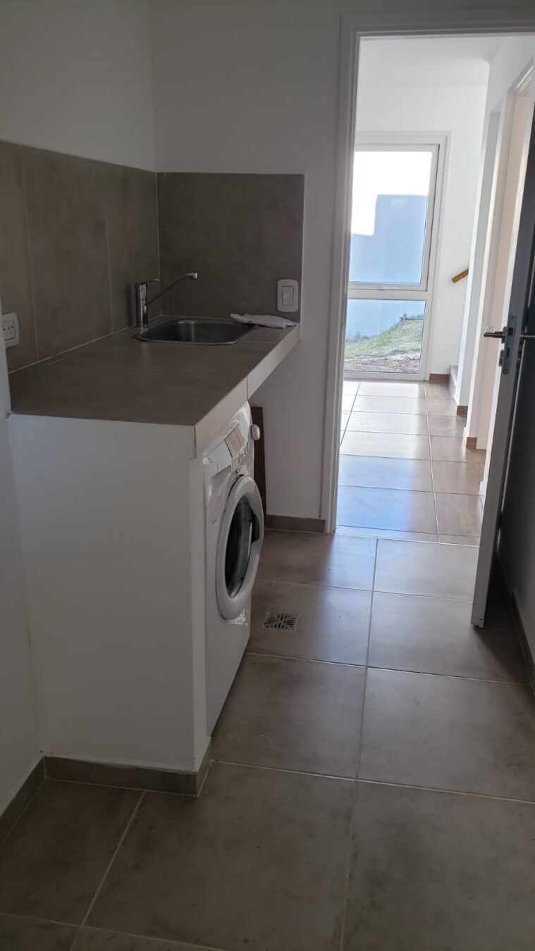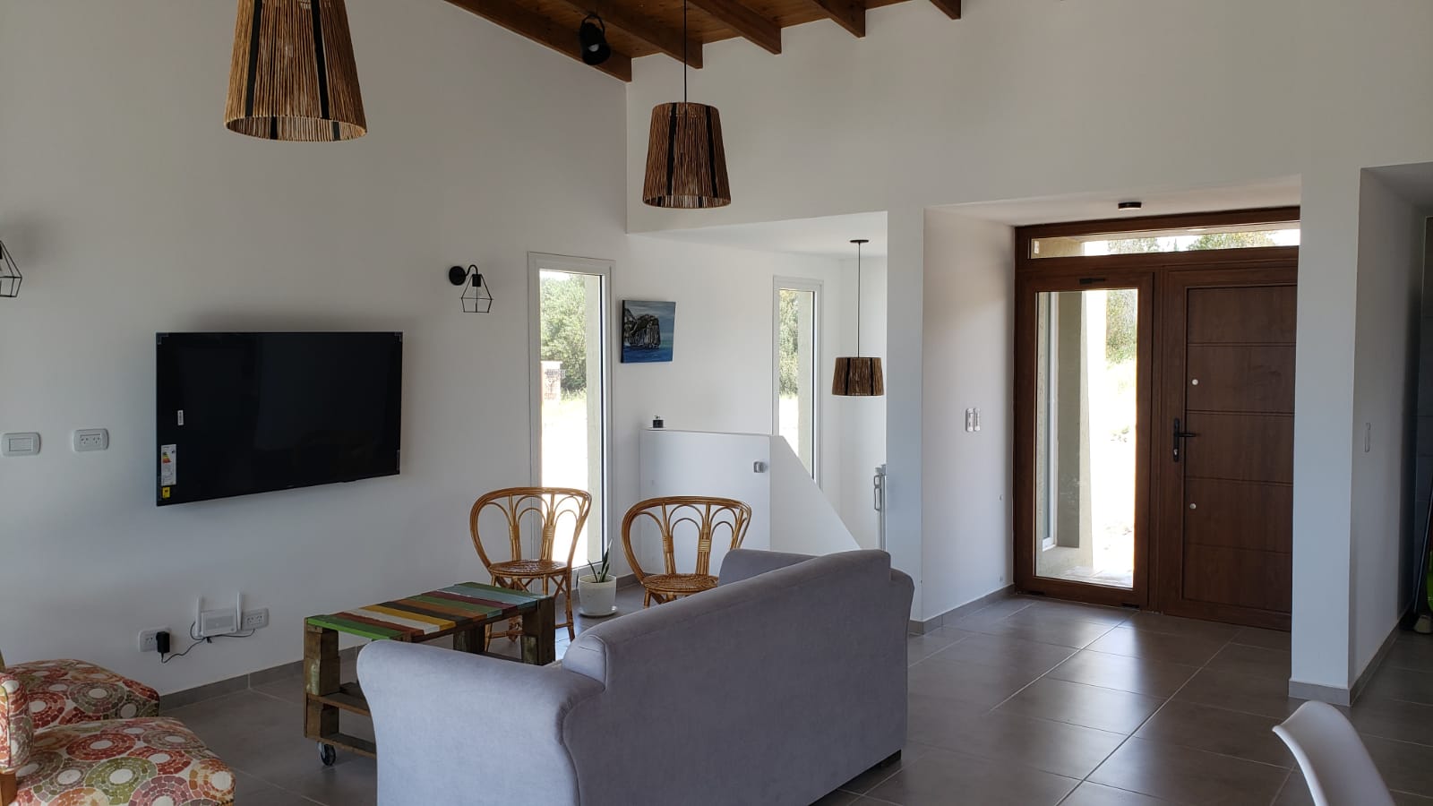 Living comedor con cocina integrada, barra desayunadora incluida. Galería con parrilla. Smart TV de 55”.